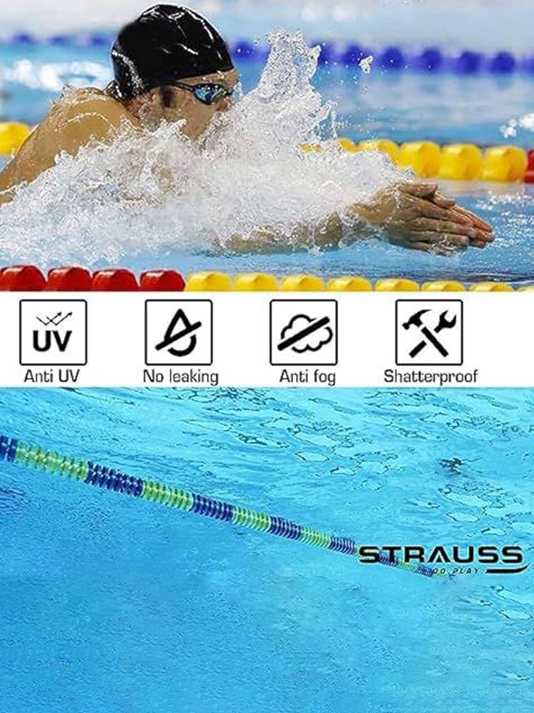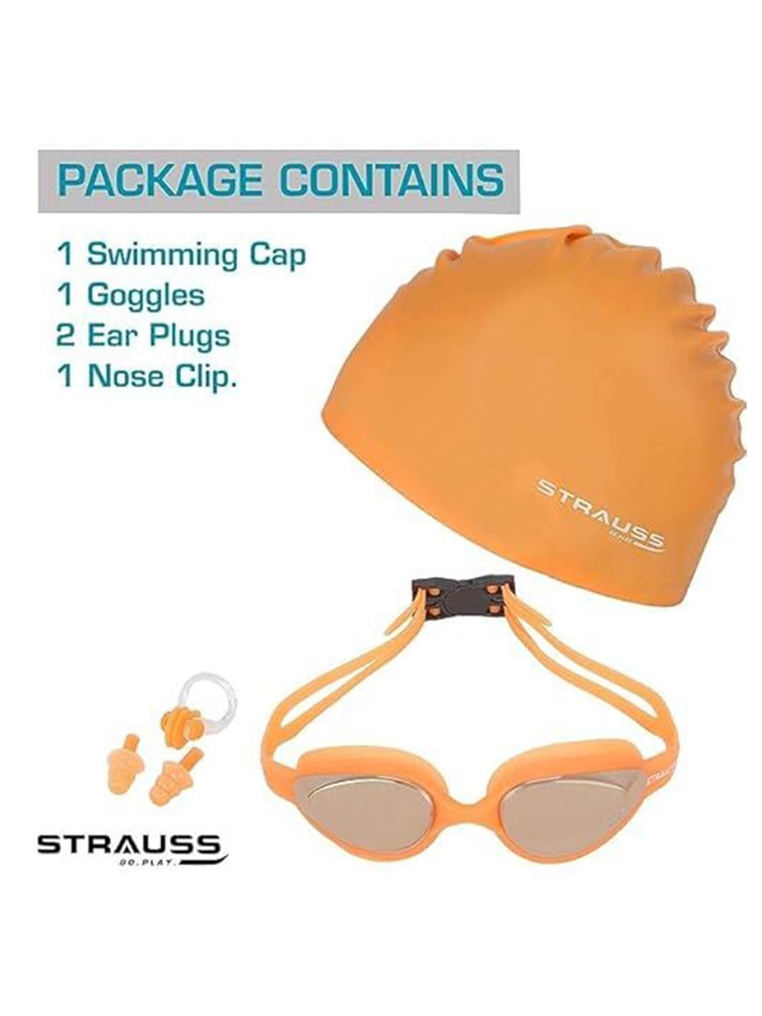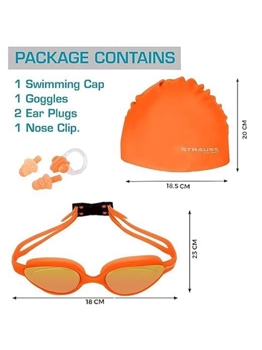 Set Content: 1 Swimming goggles, 1 Swimming Cap, 2 Earplugs & 1 Nose clipColor: OrangePattern: SolidStrap Material: SiliconeLens material: GlassFeature:Anti-FogComfortableUV protection