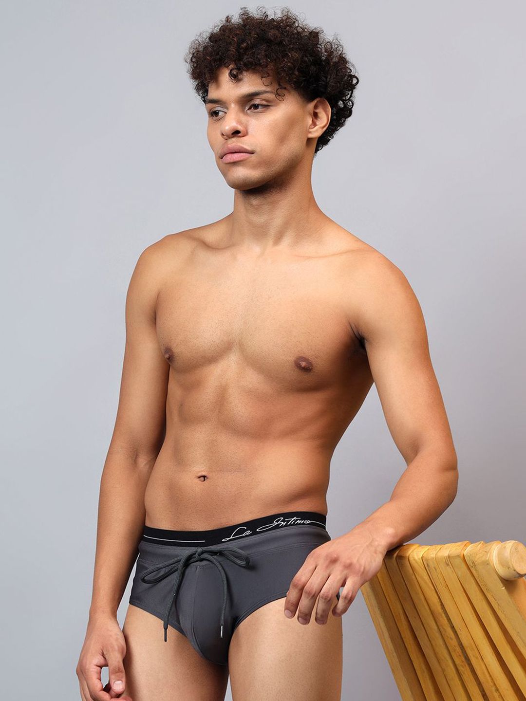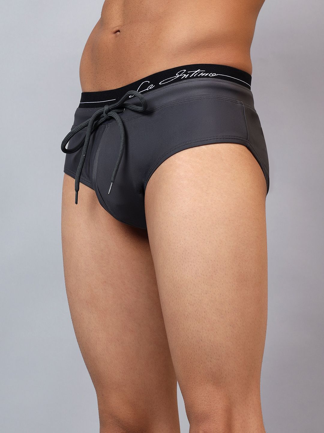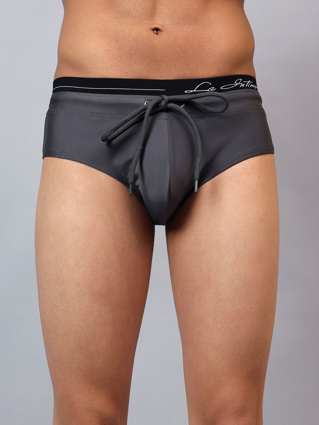 Grey Solid mid-rise swim Briefs,has an elasticated waistband with drawstring closure.
