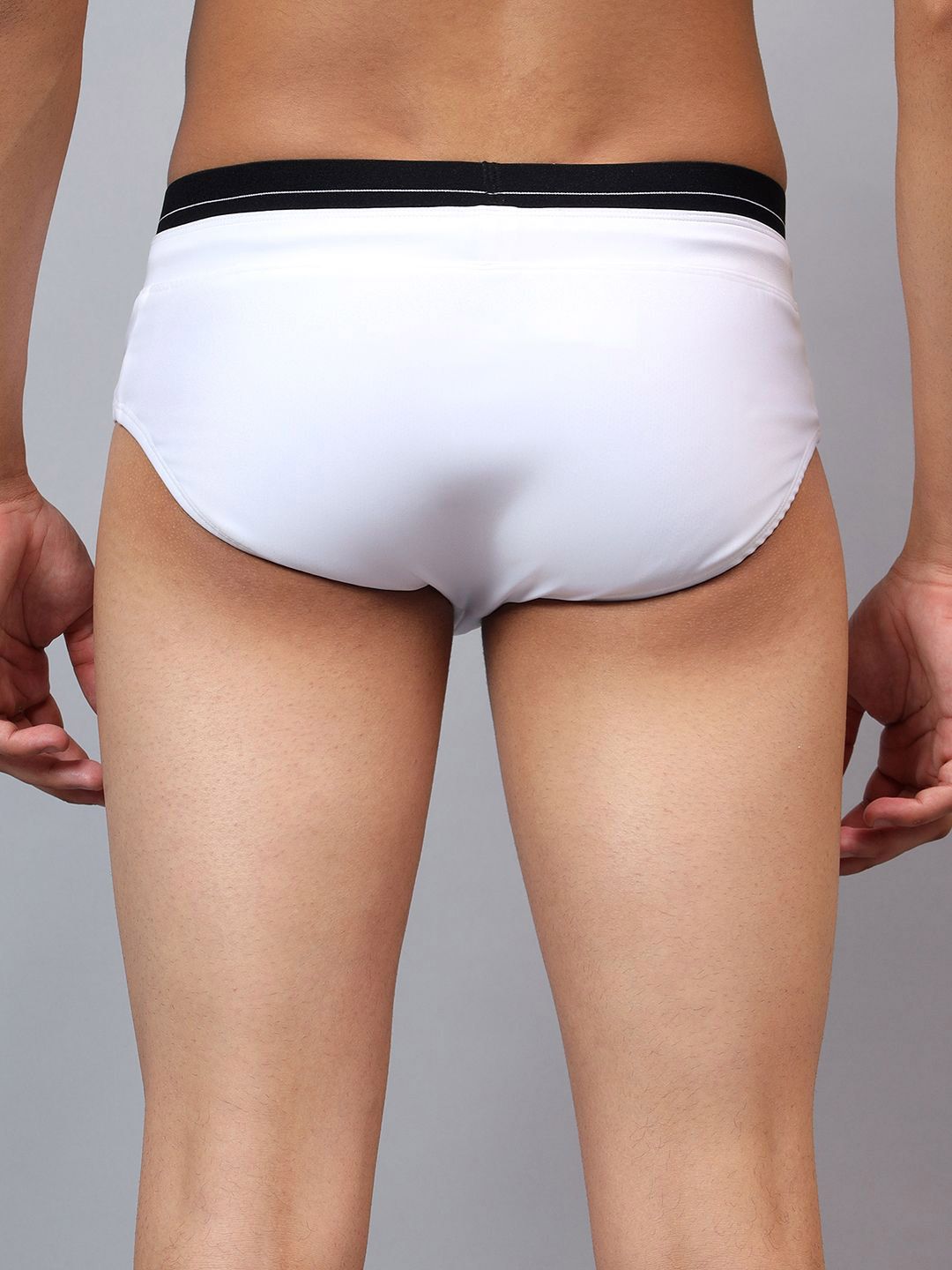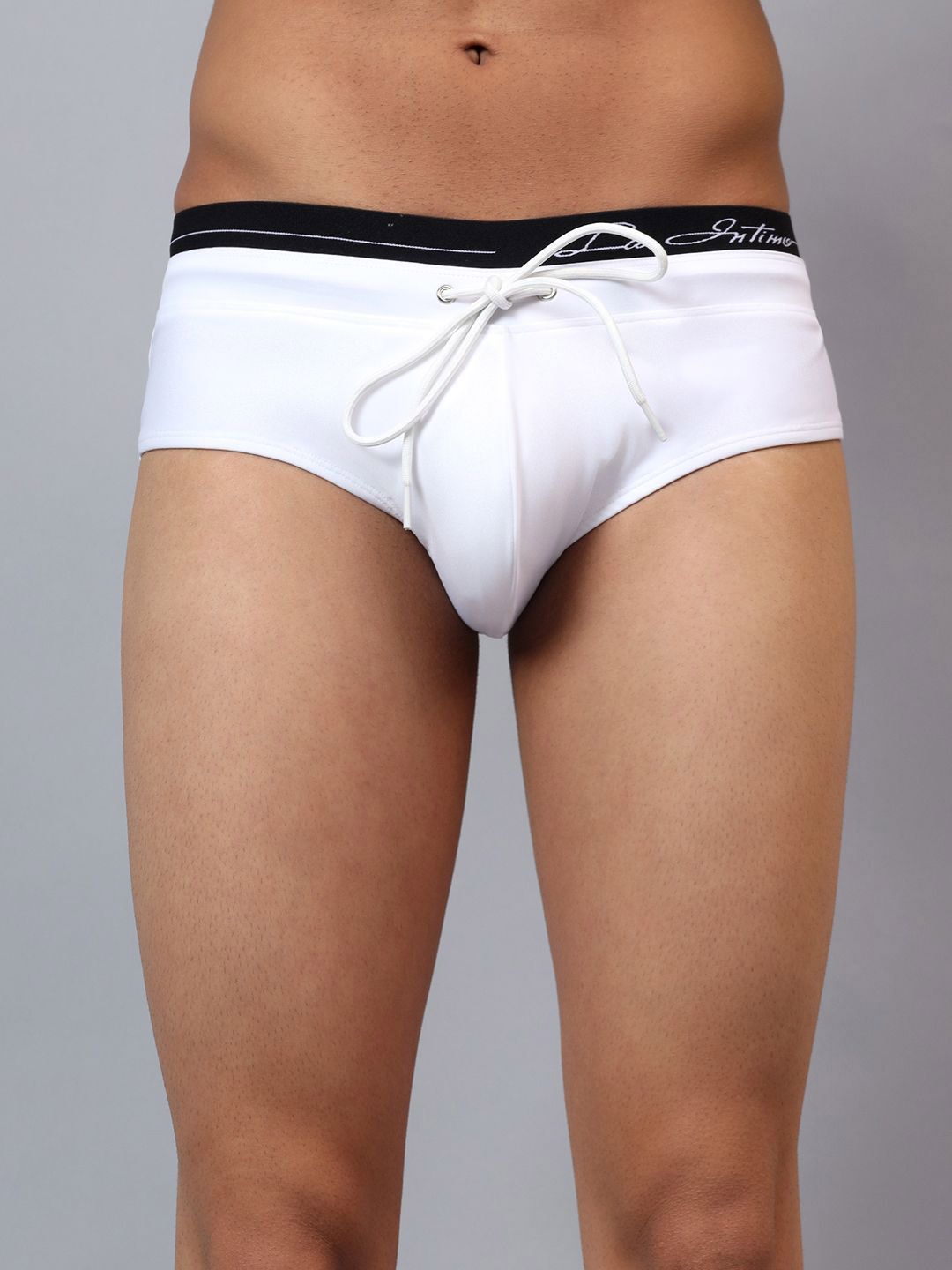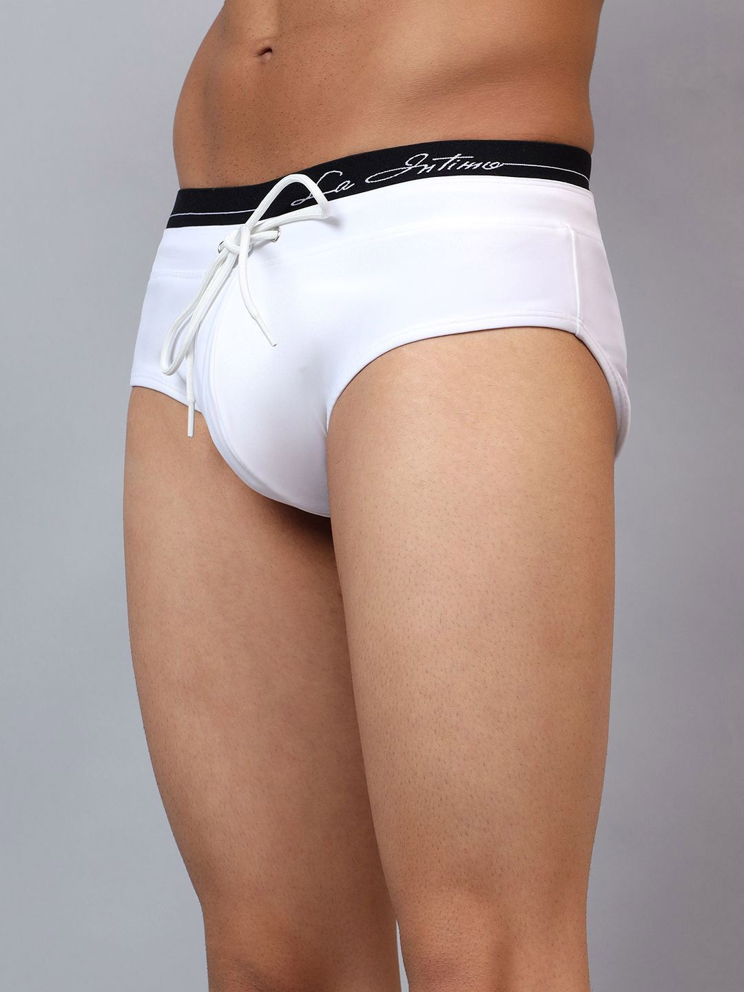 White Solid mid-rise swim Briefs,has an elasticated waistband with drawstring closure.