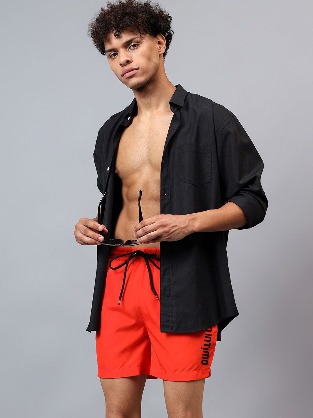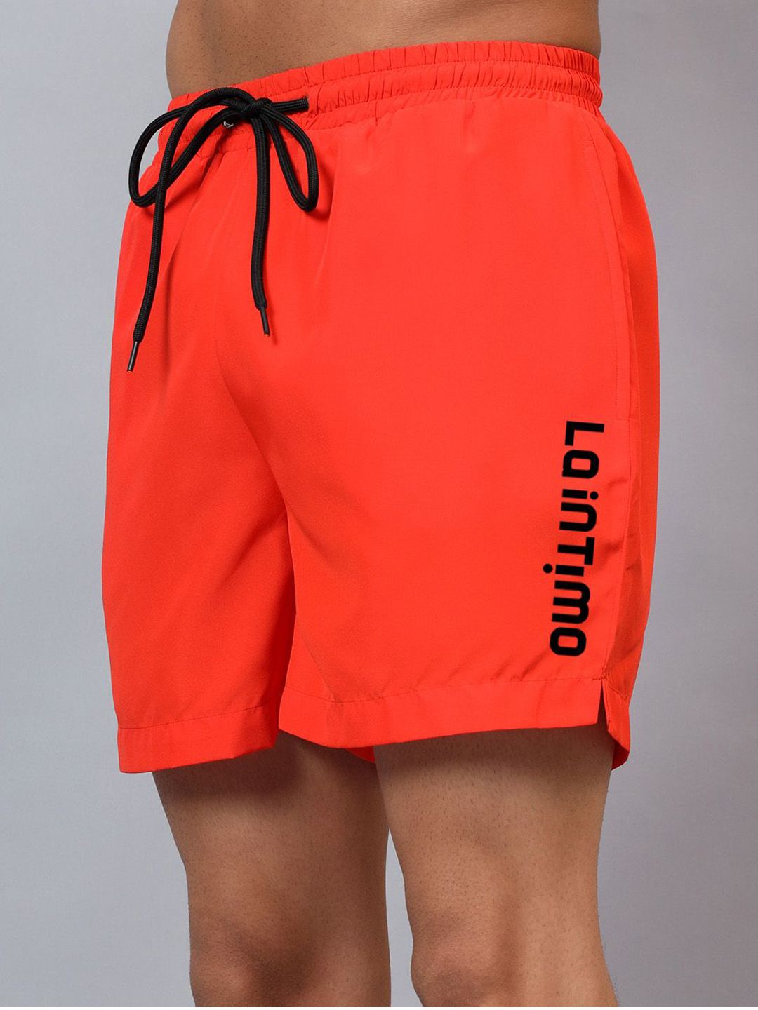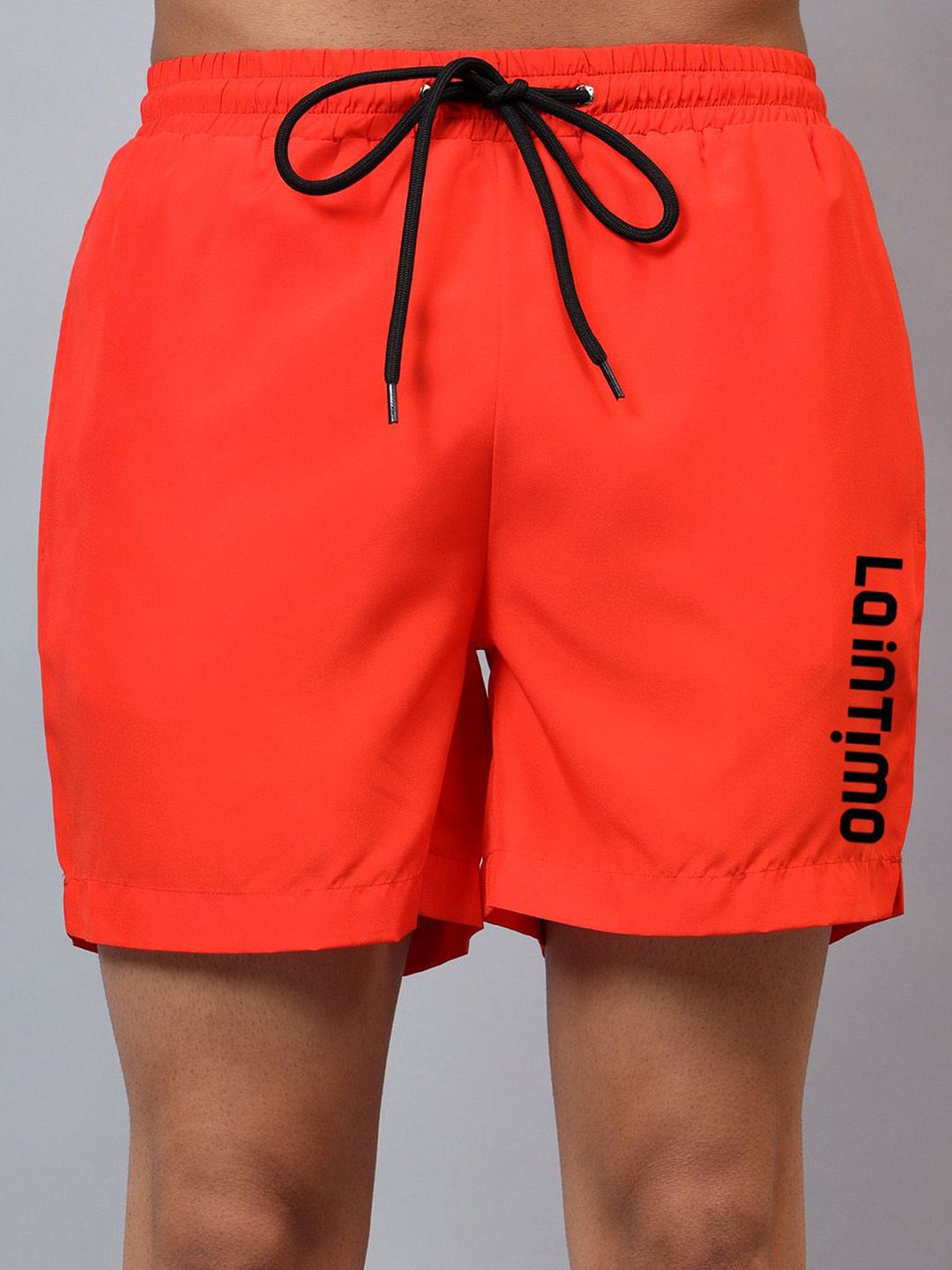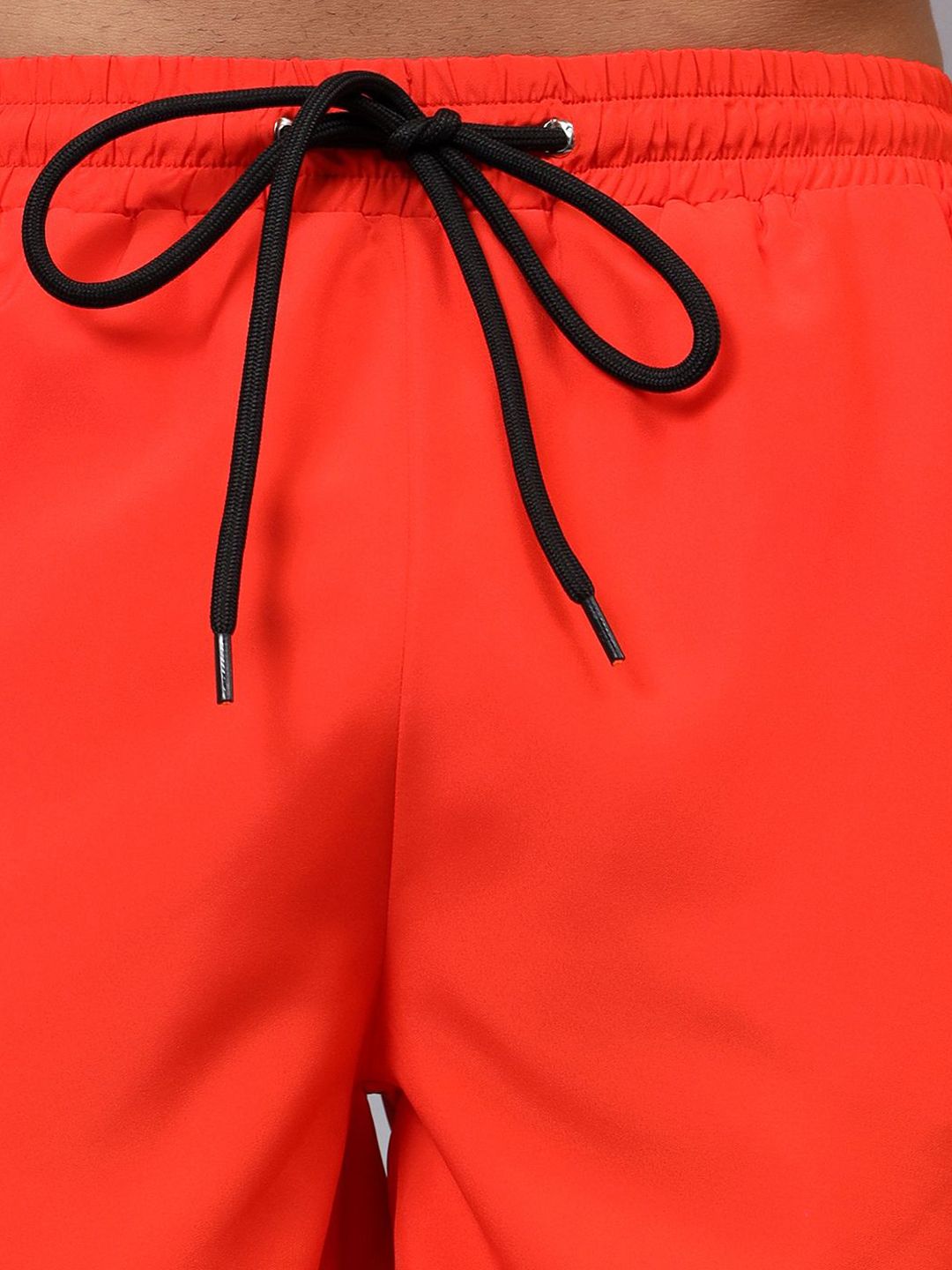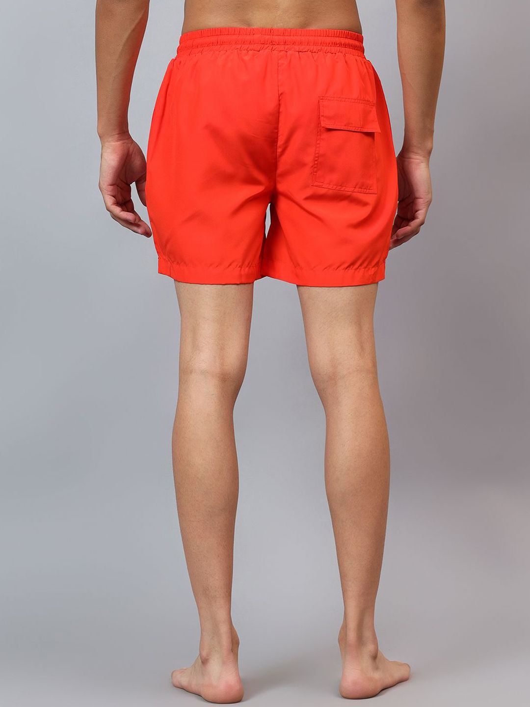 Orange solid mid rise swim shorts, has an elasticated waitsband with drawstring closure, 1 back flap pocket.