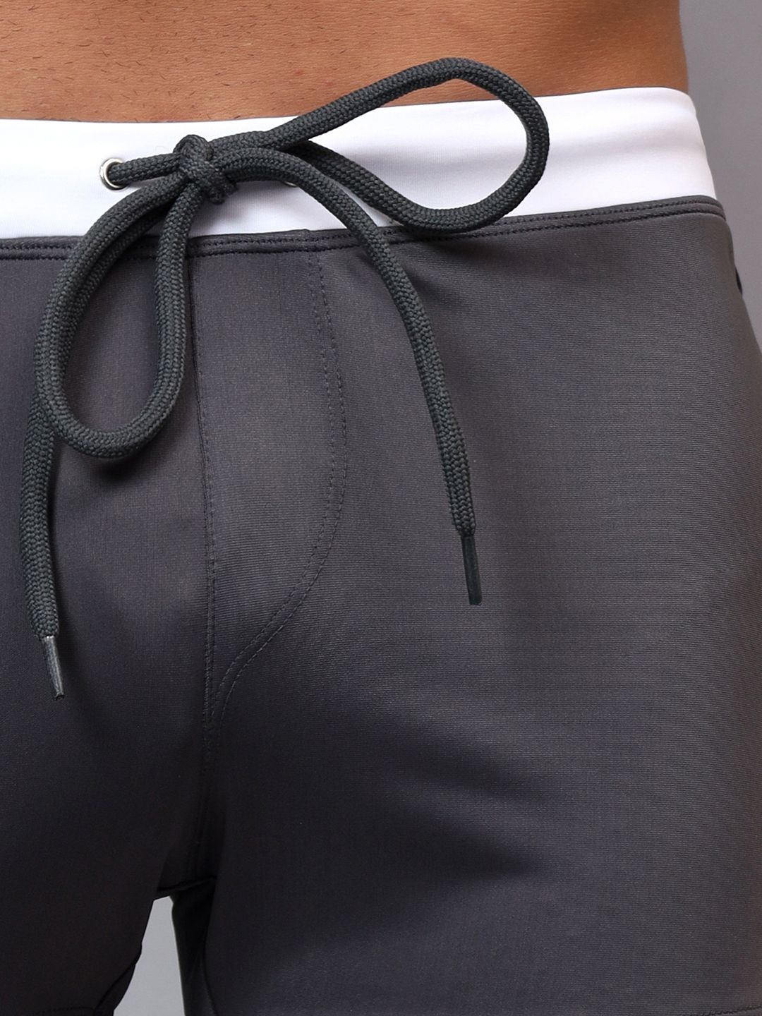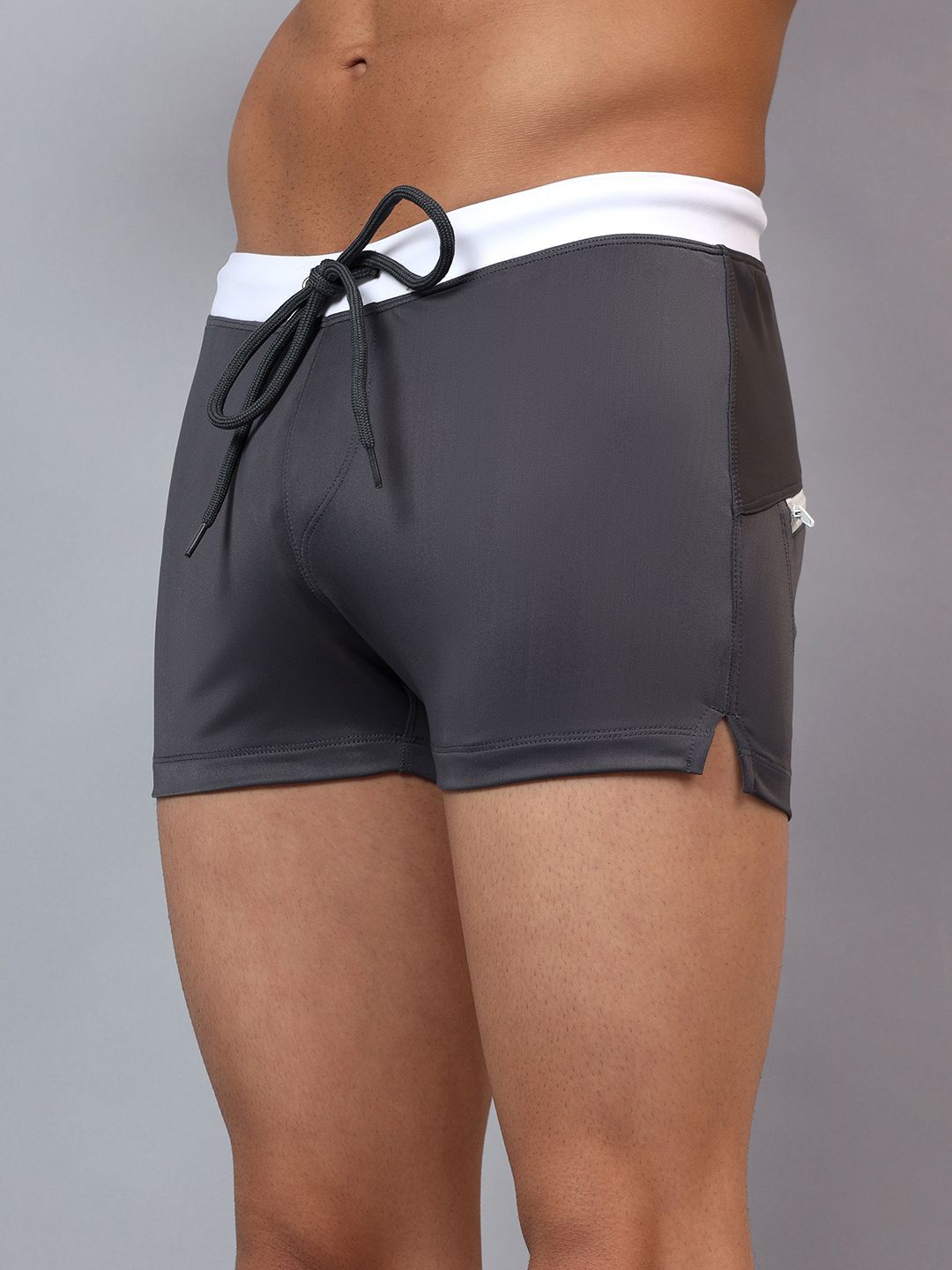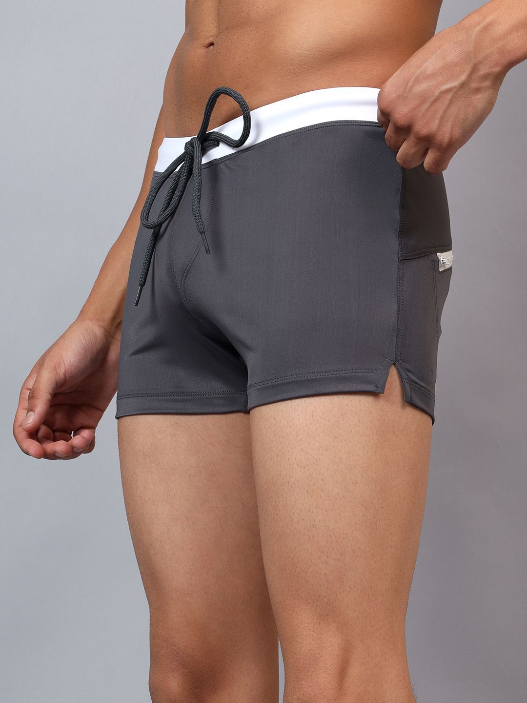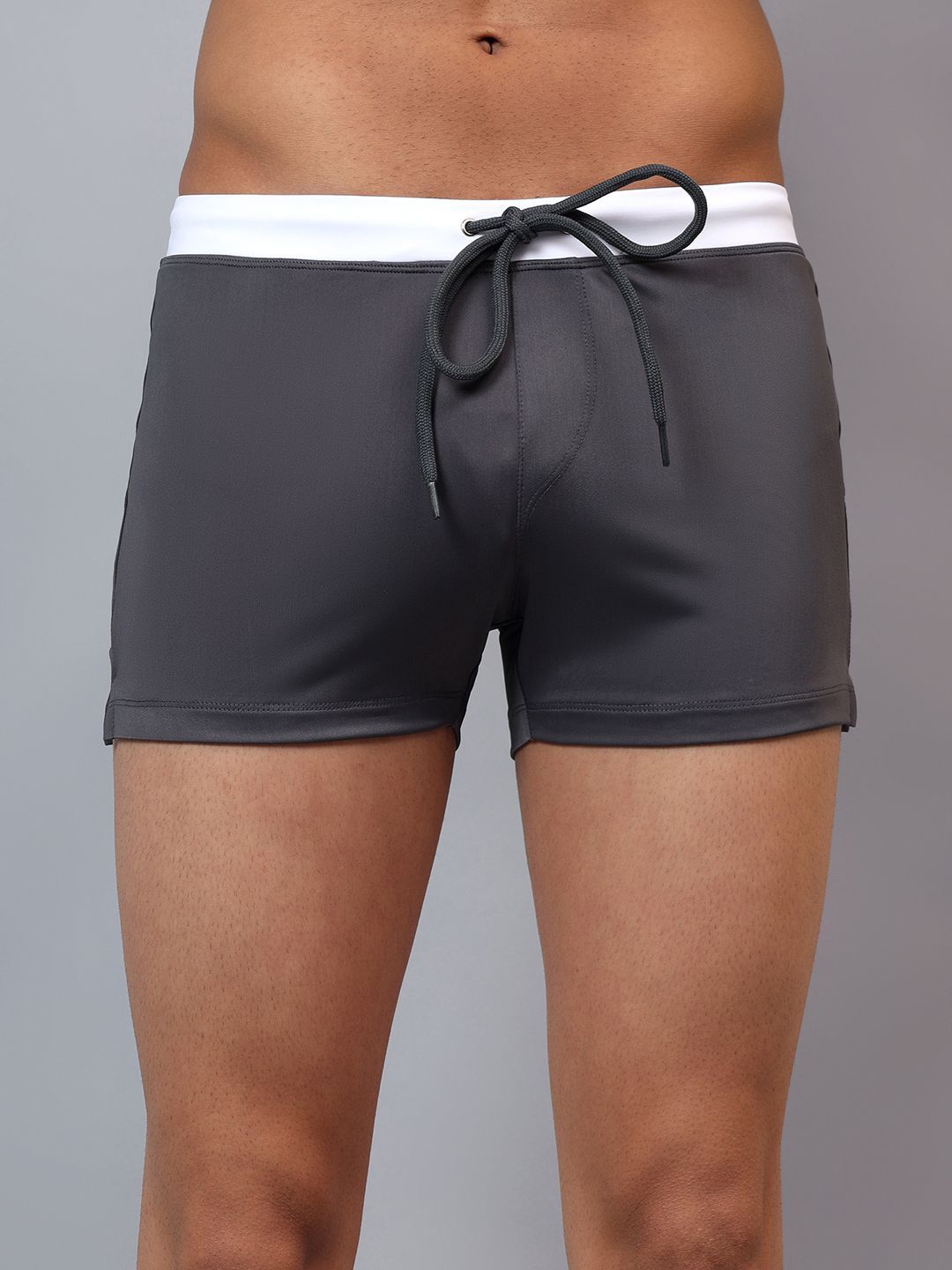 Grey solid mid rise swim trunks, has an elasticated contrast waitsband with drawstring closure, 1 back zip pocket.