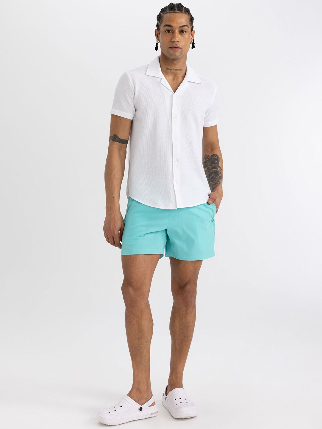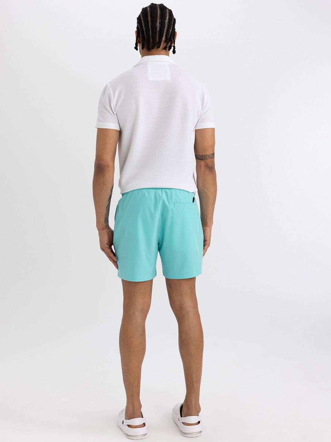 Blue solid high-rise swim bottoms, has an elasticated waistband with drawstring closure