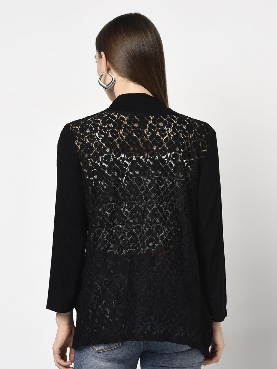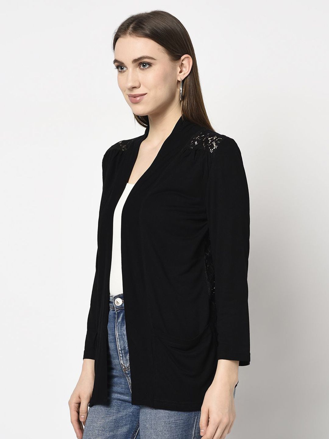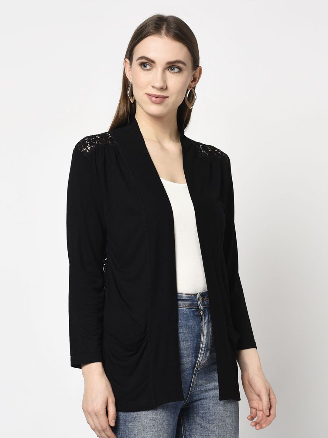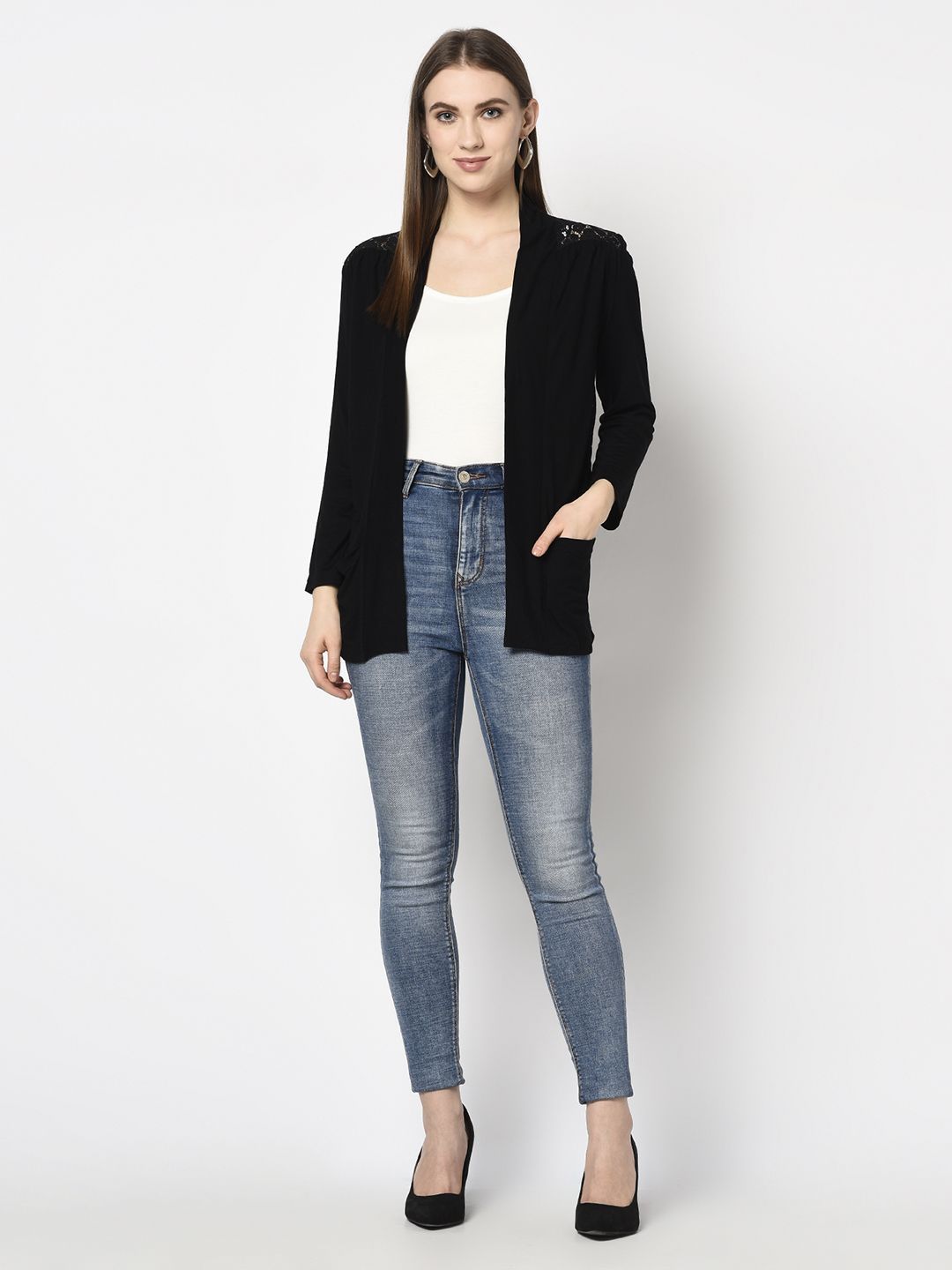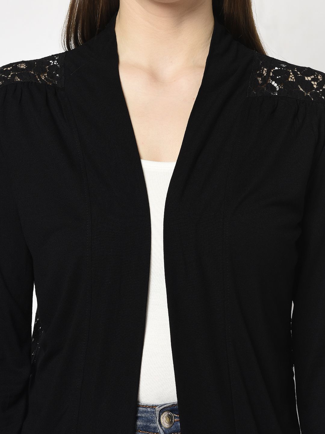 Black solid open front shrug ,has shawl collar & long sleeves, with straight hem