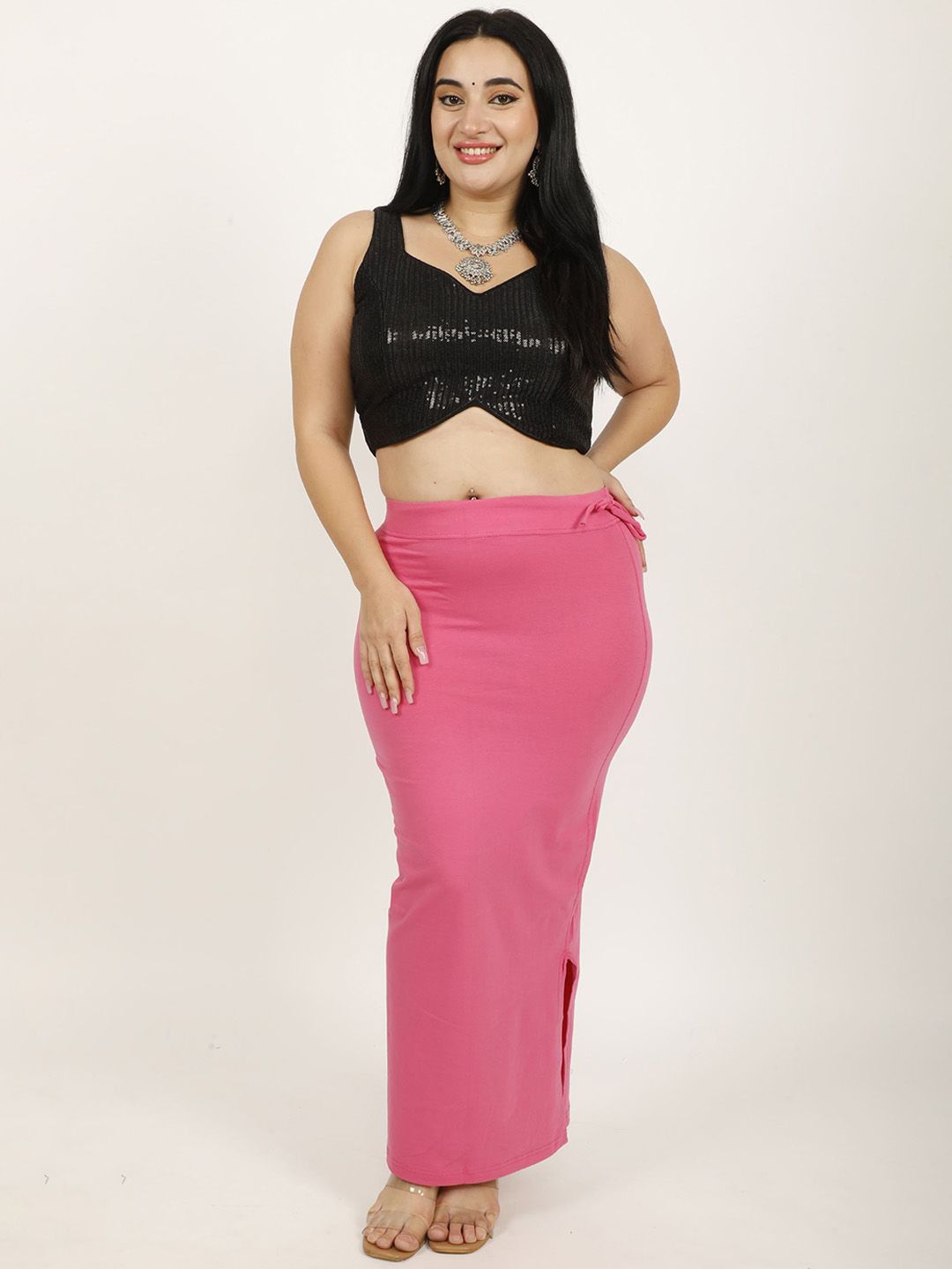 Pink solid Stretchable saree shapewear, has an elasticated waistband with drawstring closure and flared hem