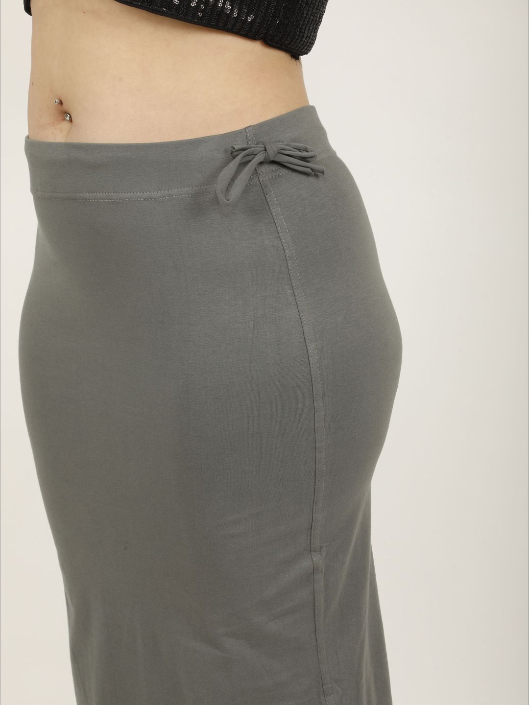 Grey fish-cut style saree shapewear, has an elasticated waistband with inner drawstring closure, seamless and a side slit