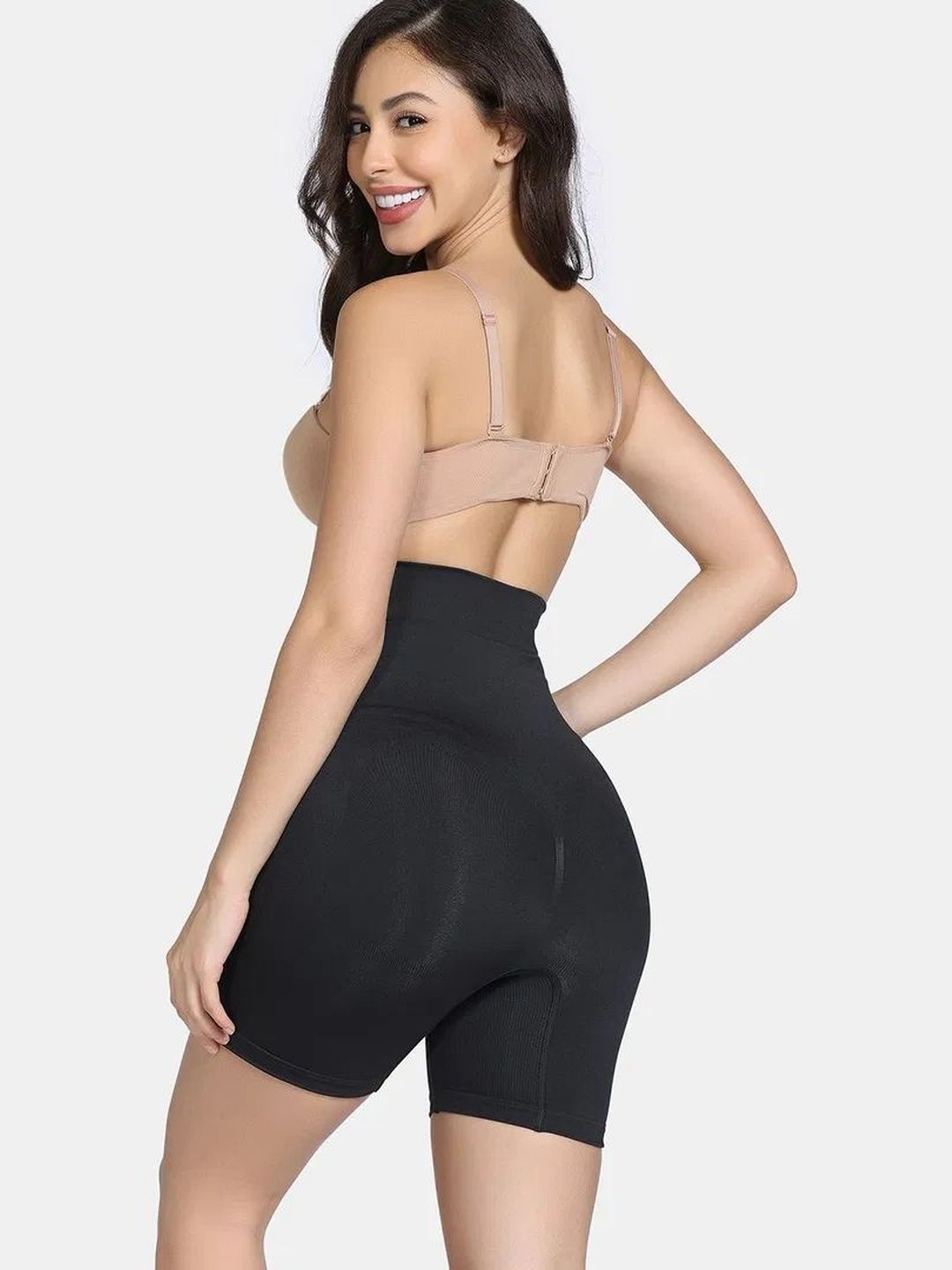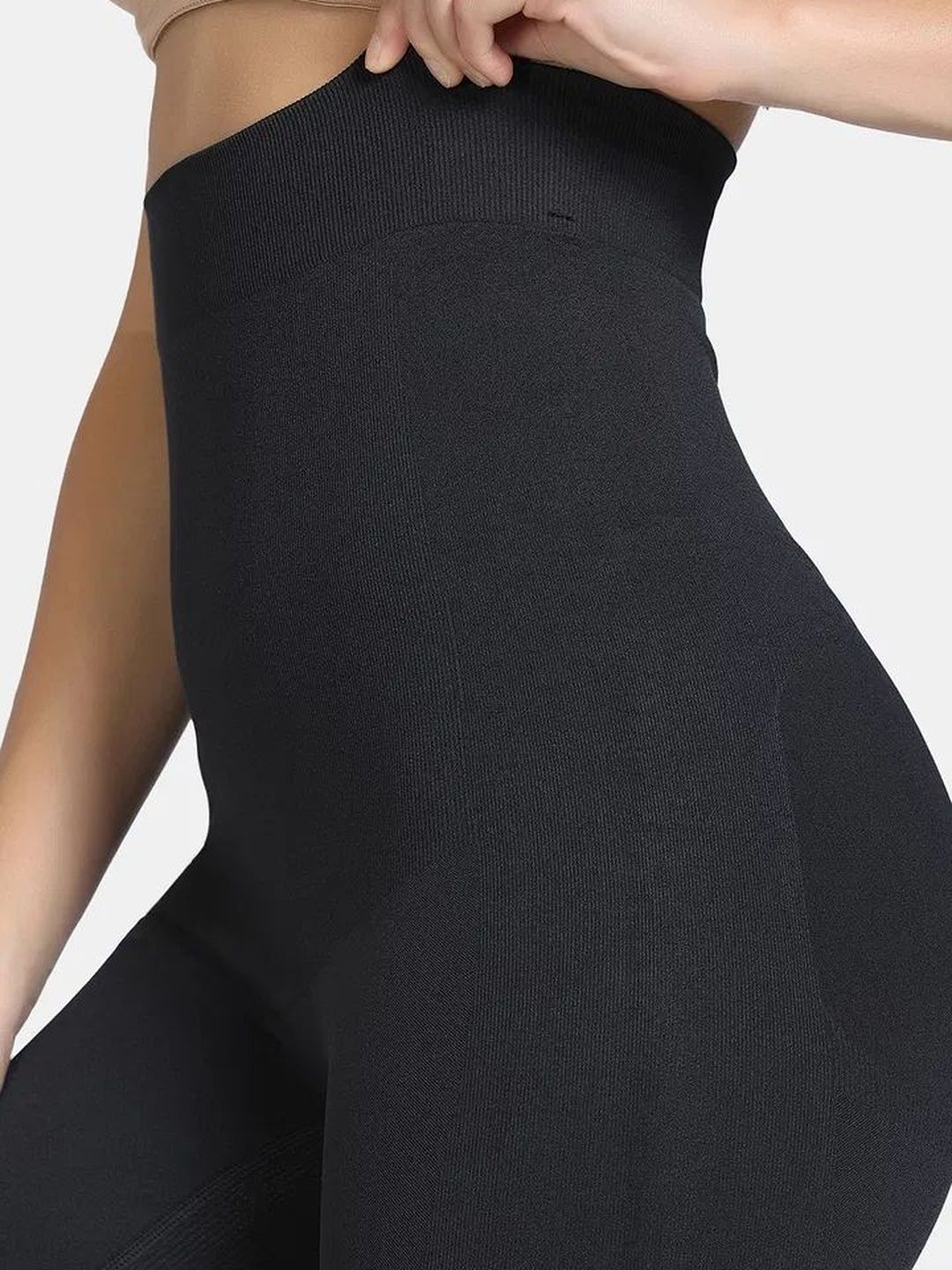 Black solid tummy and thigh shaper has an elasticated waistband, and a double-layered gusset