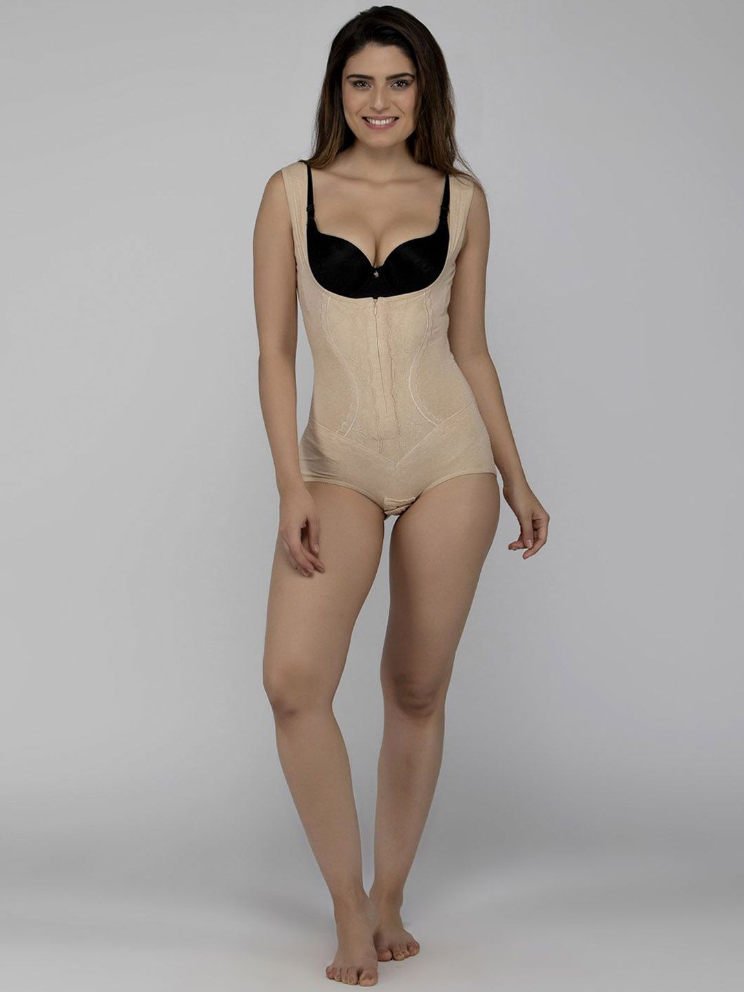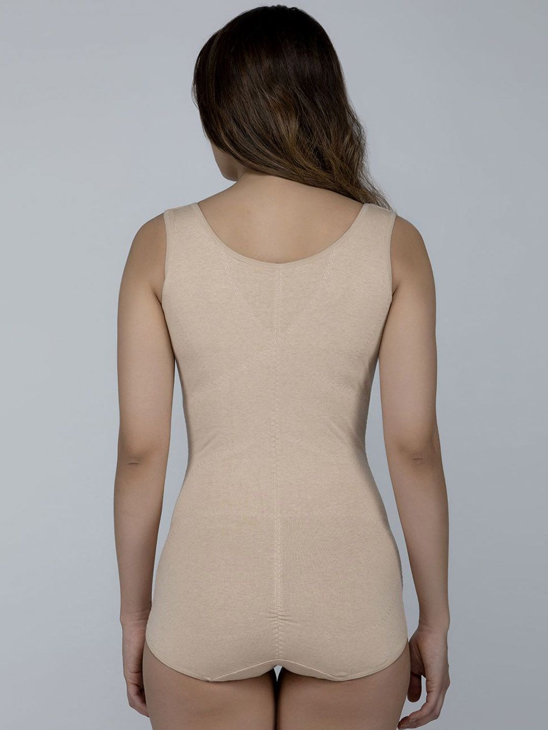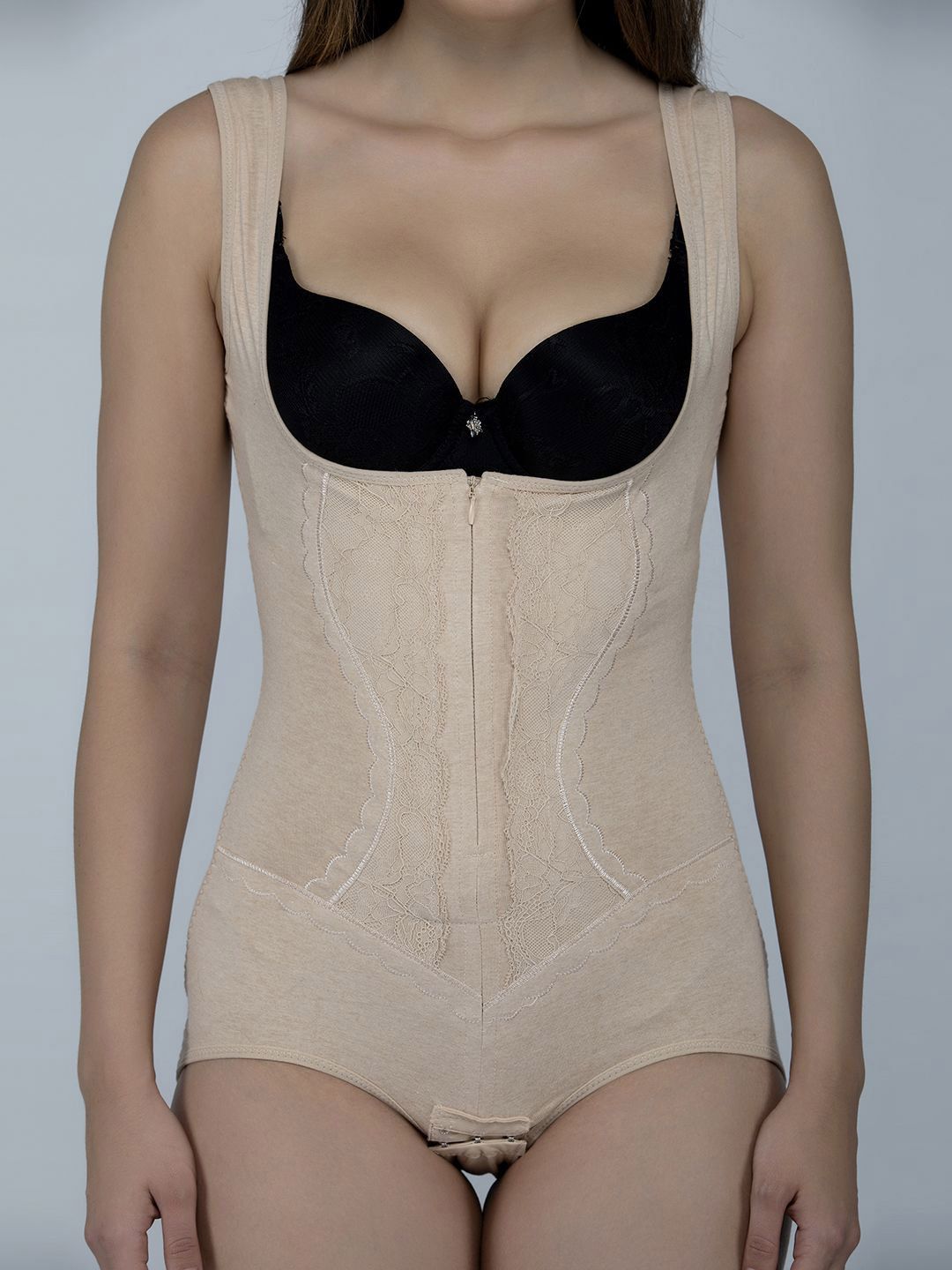 Nude coloured solid full body compression corset shapewear, has elasticated with hook closure