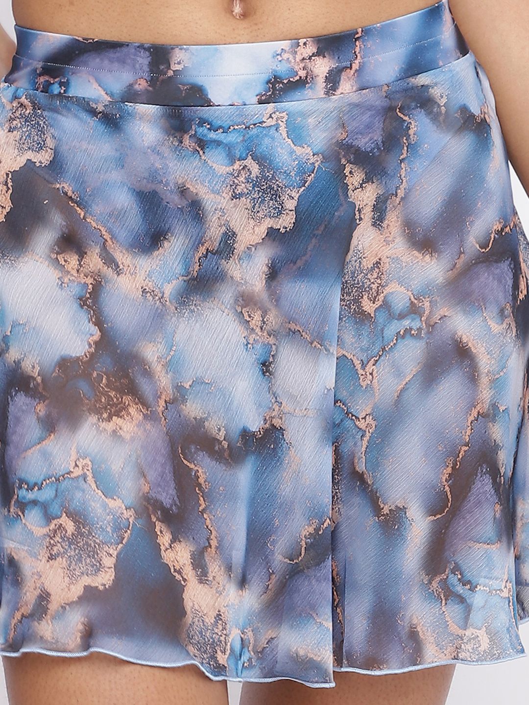Blue printed cover-up bottom, has mini and slip-on closure