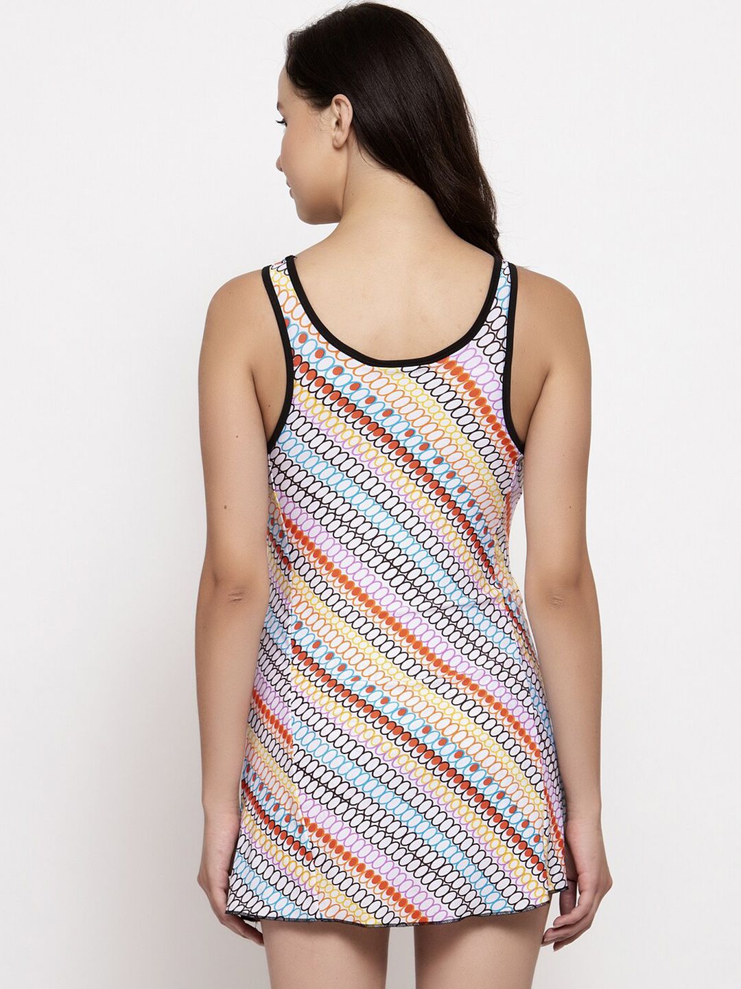 Multicoloured printed swimming dress, has a scoop neck, sleeveless, removable pads, an attached shorts, slip-on closure