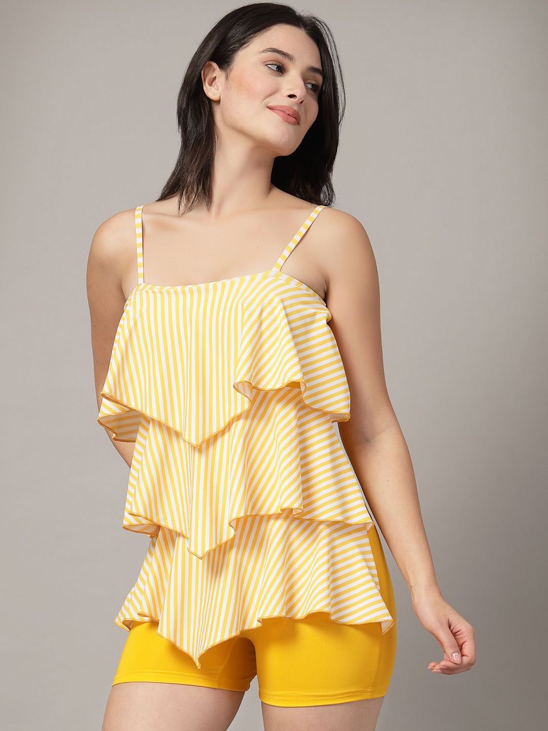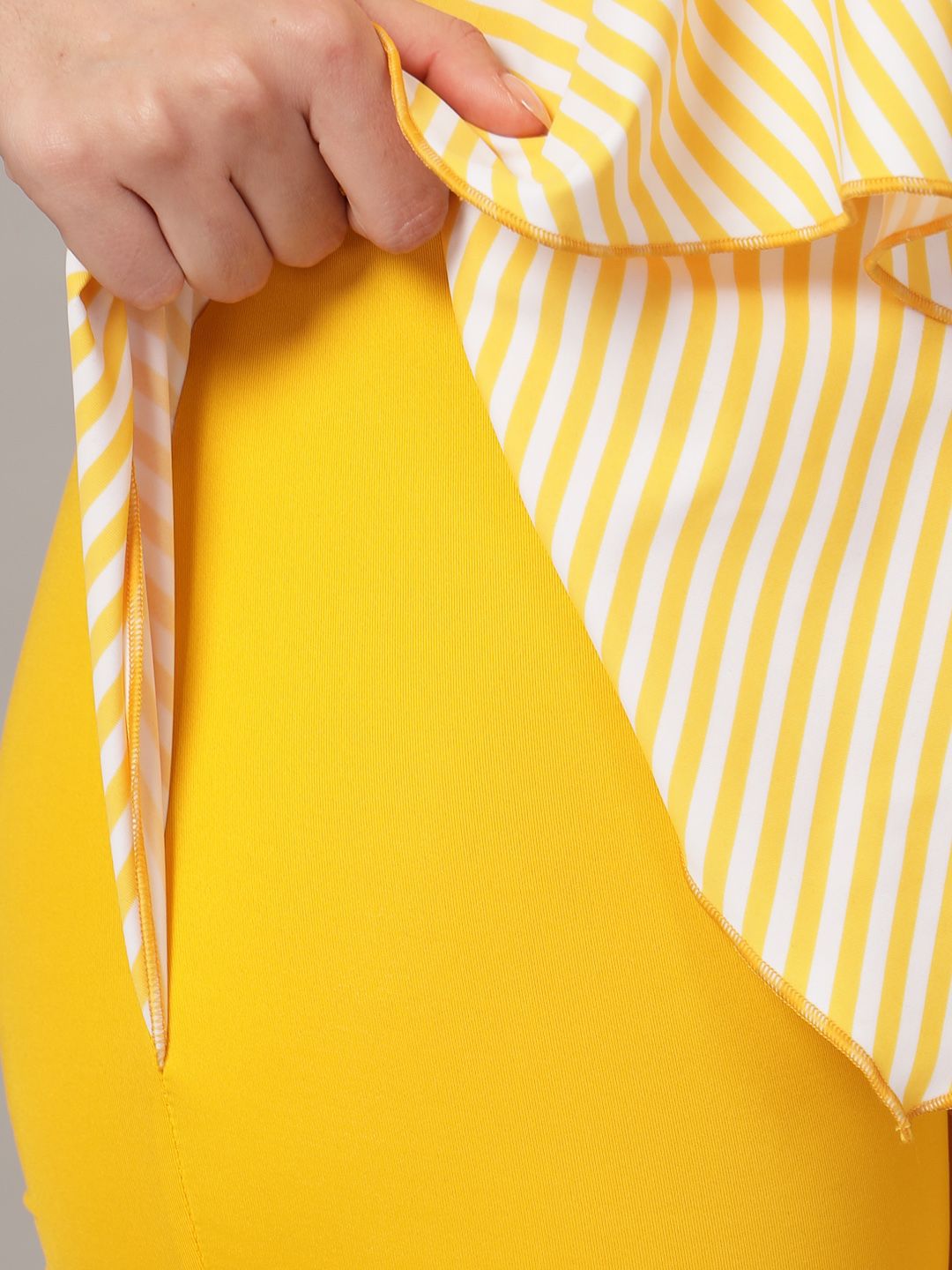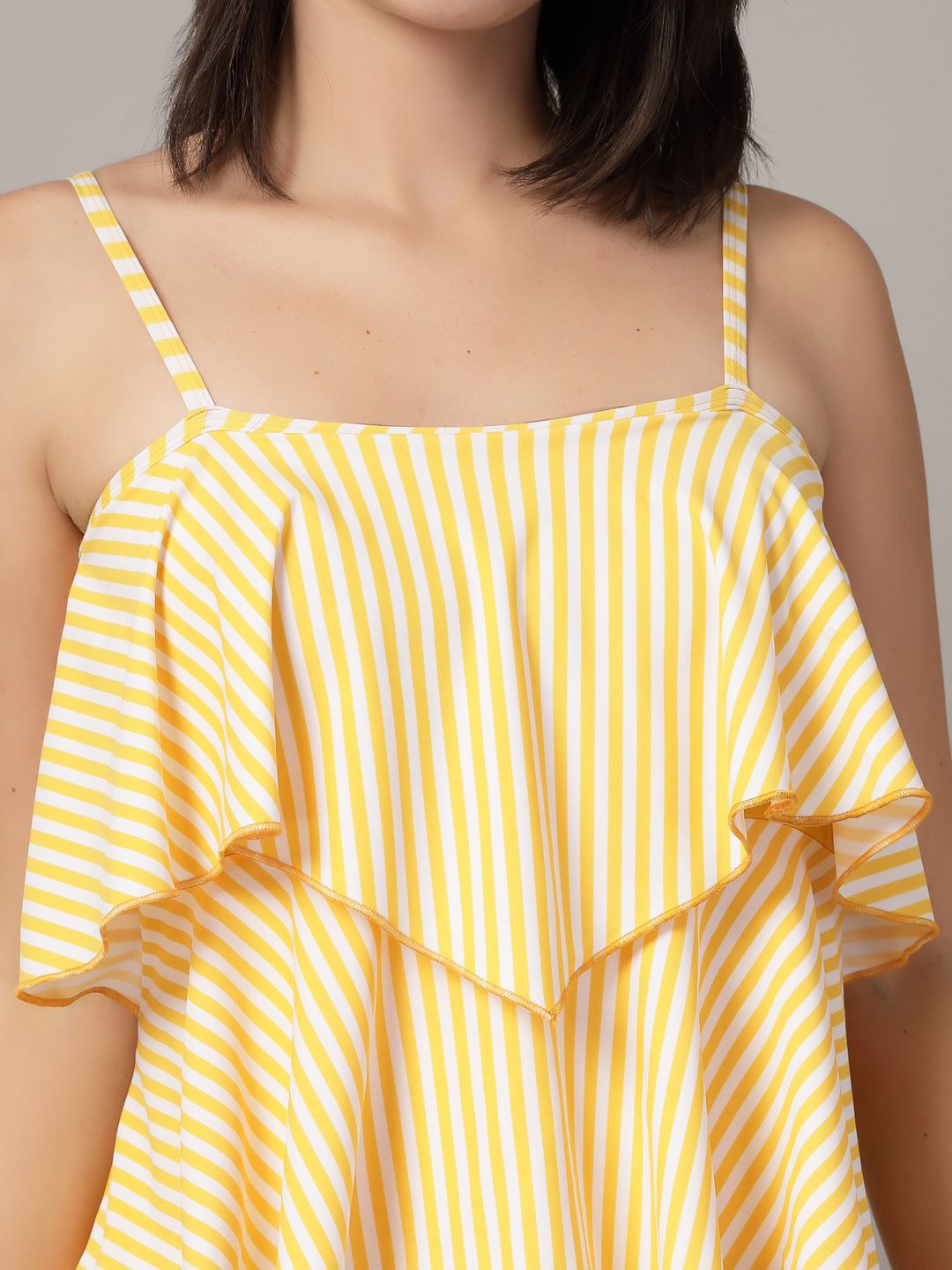 Yellow striped swimming dress, has a shoulder straps neck, sleeveless, has attached shorts.