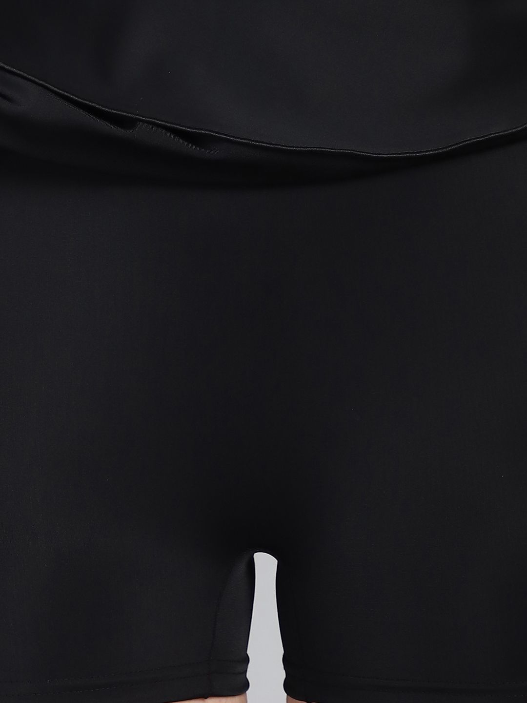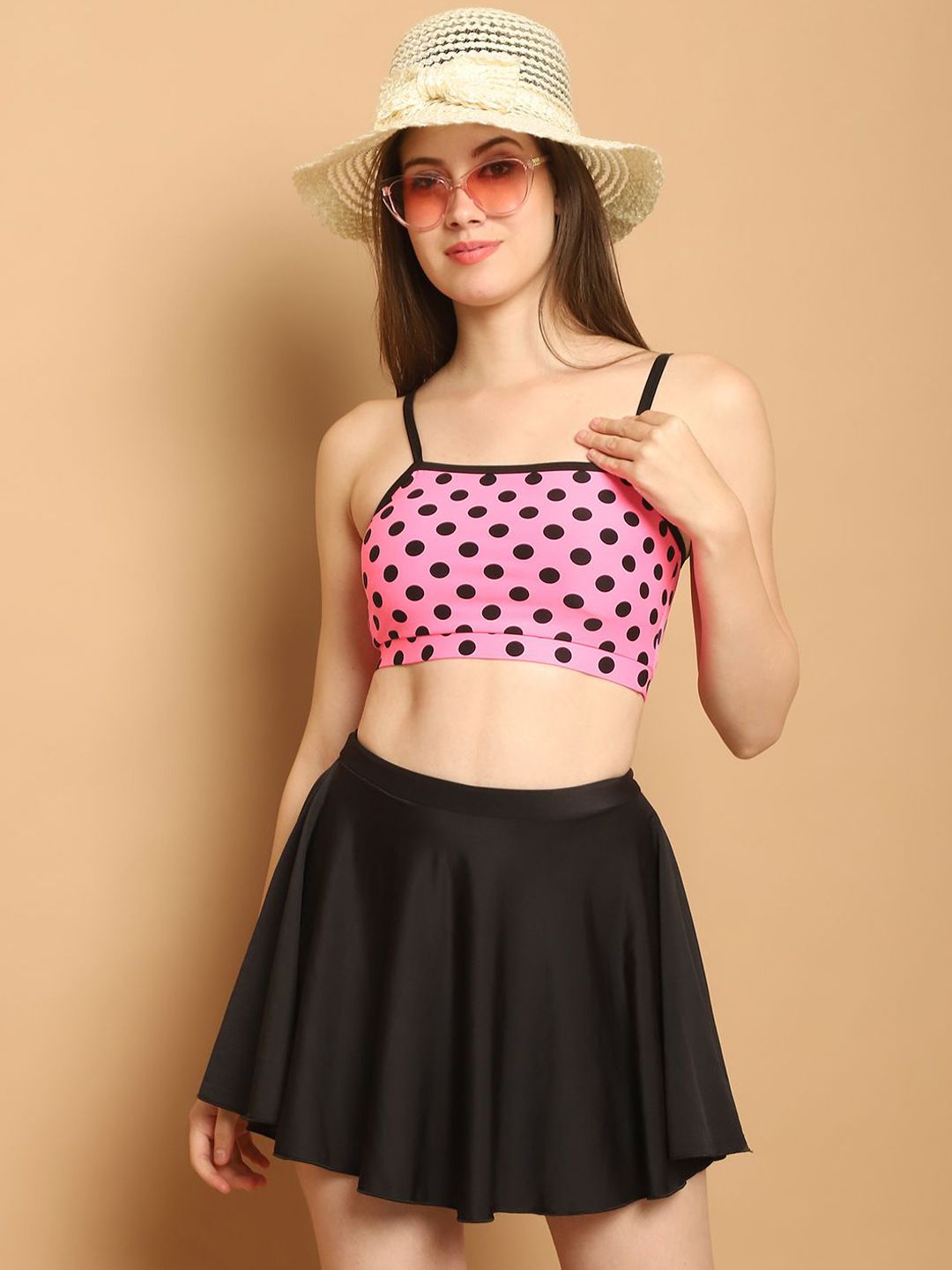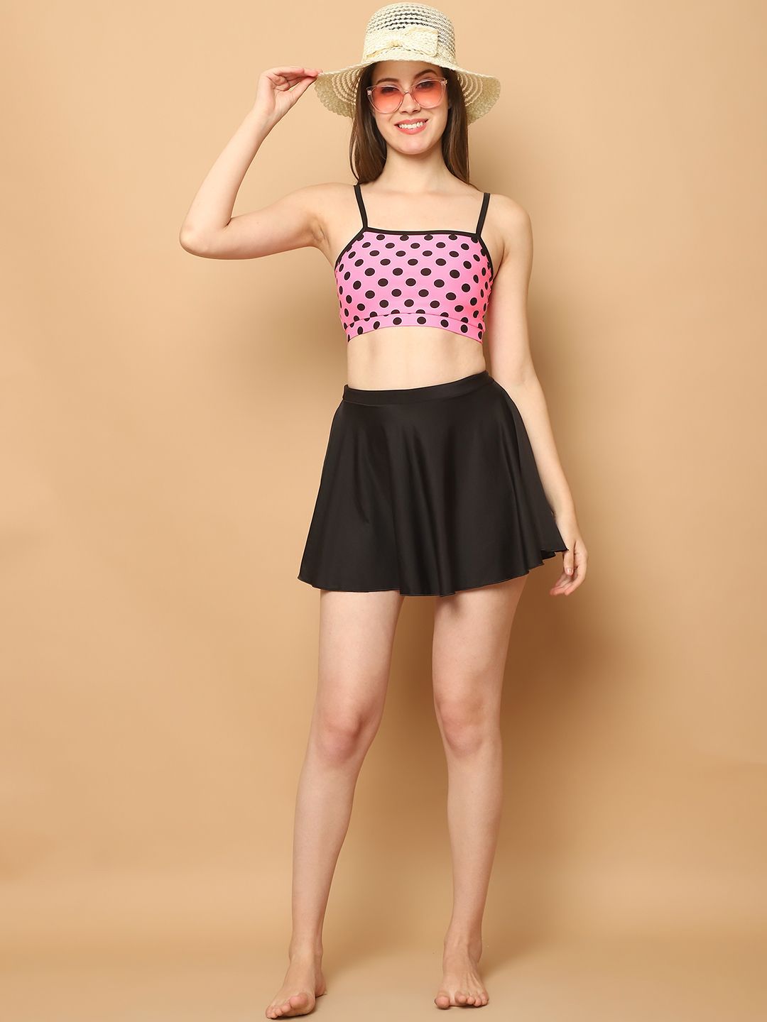 Pink & Black swim setPink printed Padded bra has a shoulder strap & sleeveless with slip on closure closure Black solid Skirts with attached shorts has elasticated waist band with slip on closure