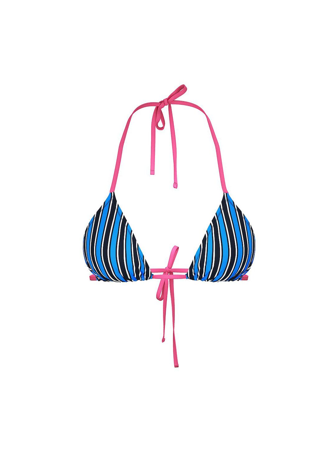 Blue and pink striped triangle silhouette swim bikini top, ruched details, self-tie back and halter straps