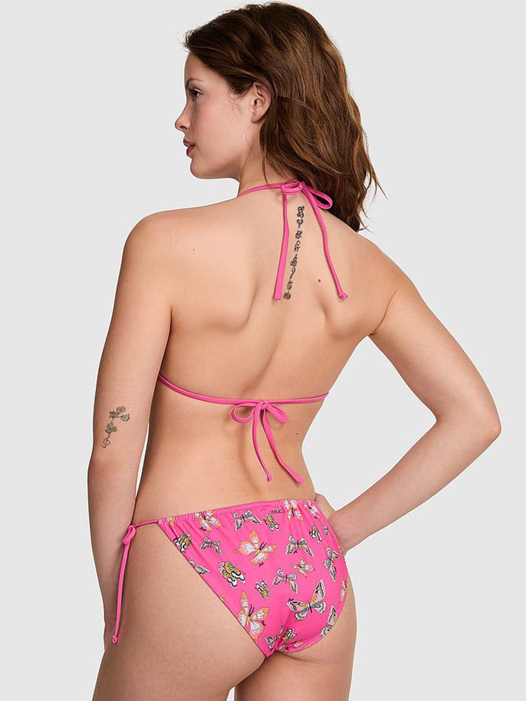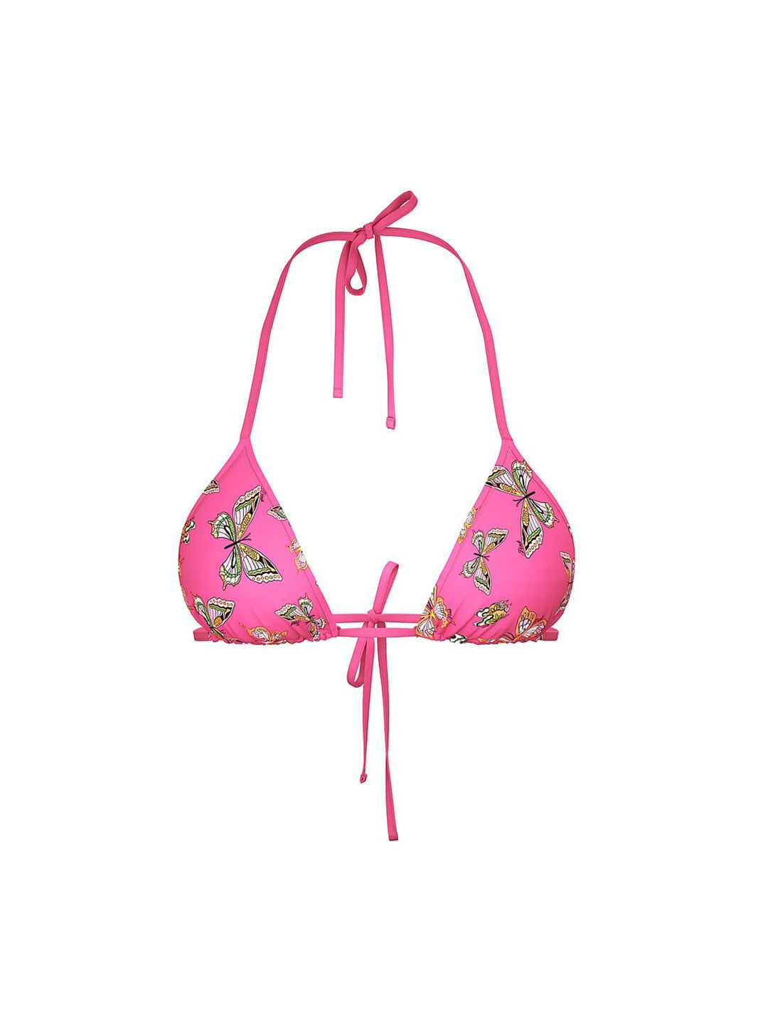 Pink printed Triangle silhouette swim bikini top, has ruched details, self-tie back and halter straps