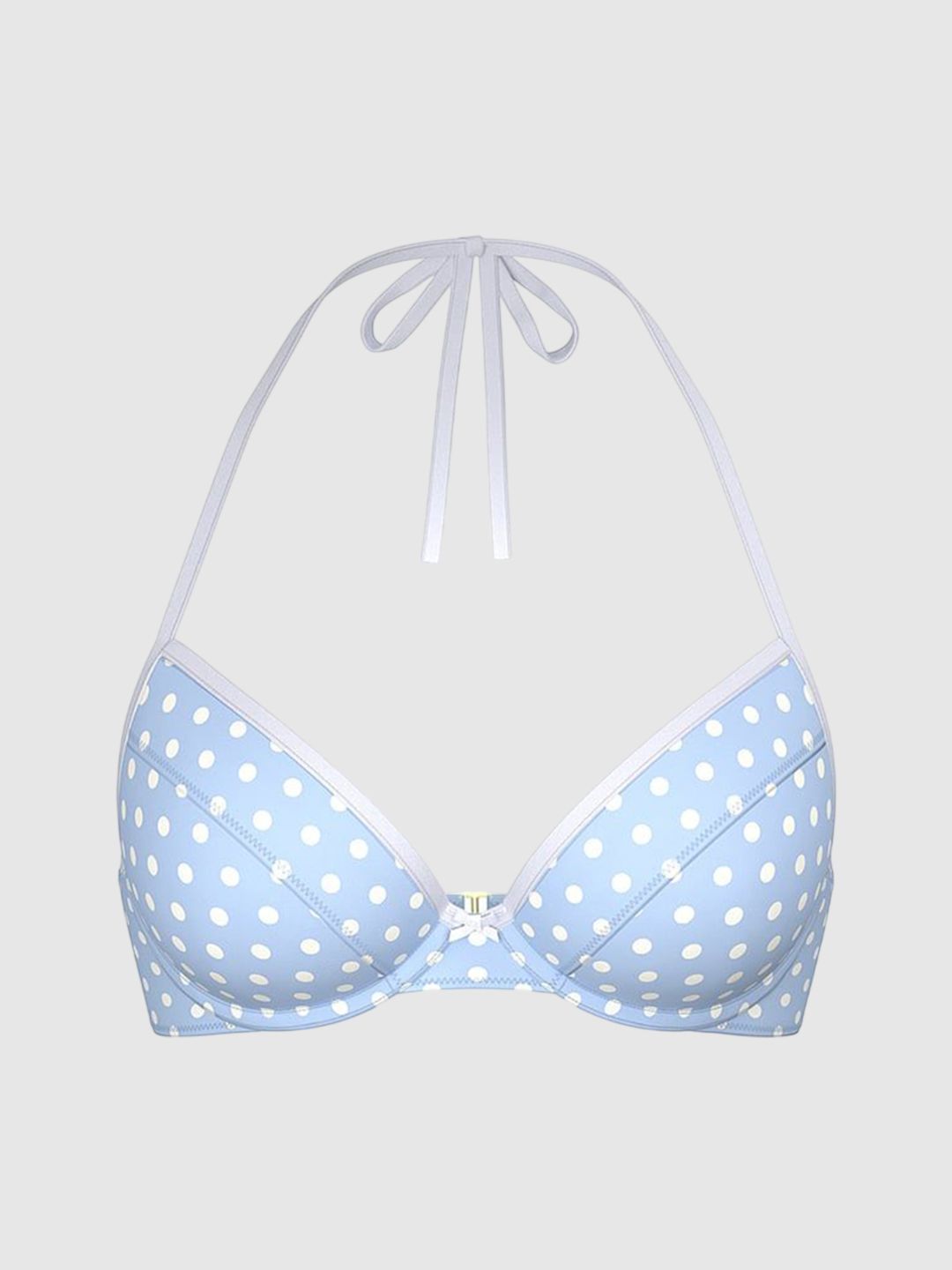 Blue and white printed swim top, has a halter-neck and adjustable self-tie halter straps with back swan-hook closure