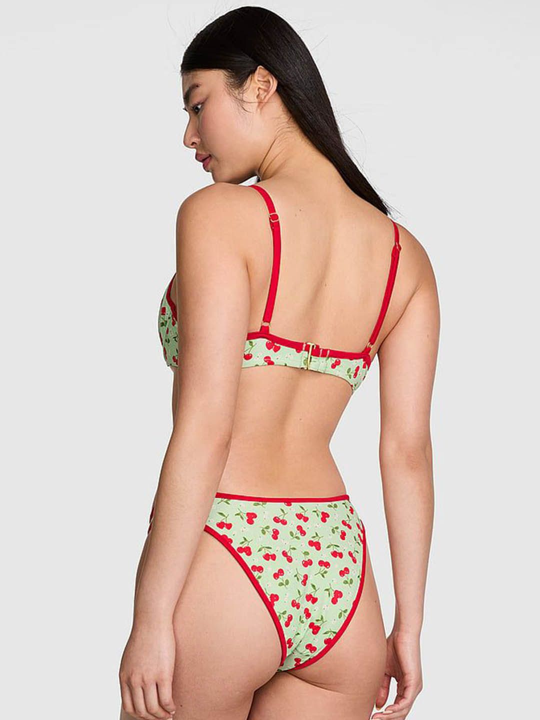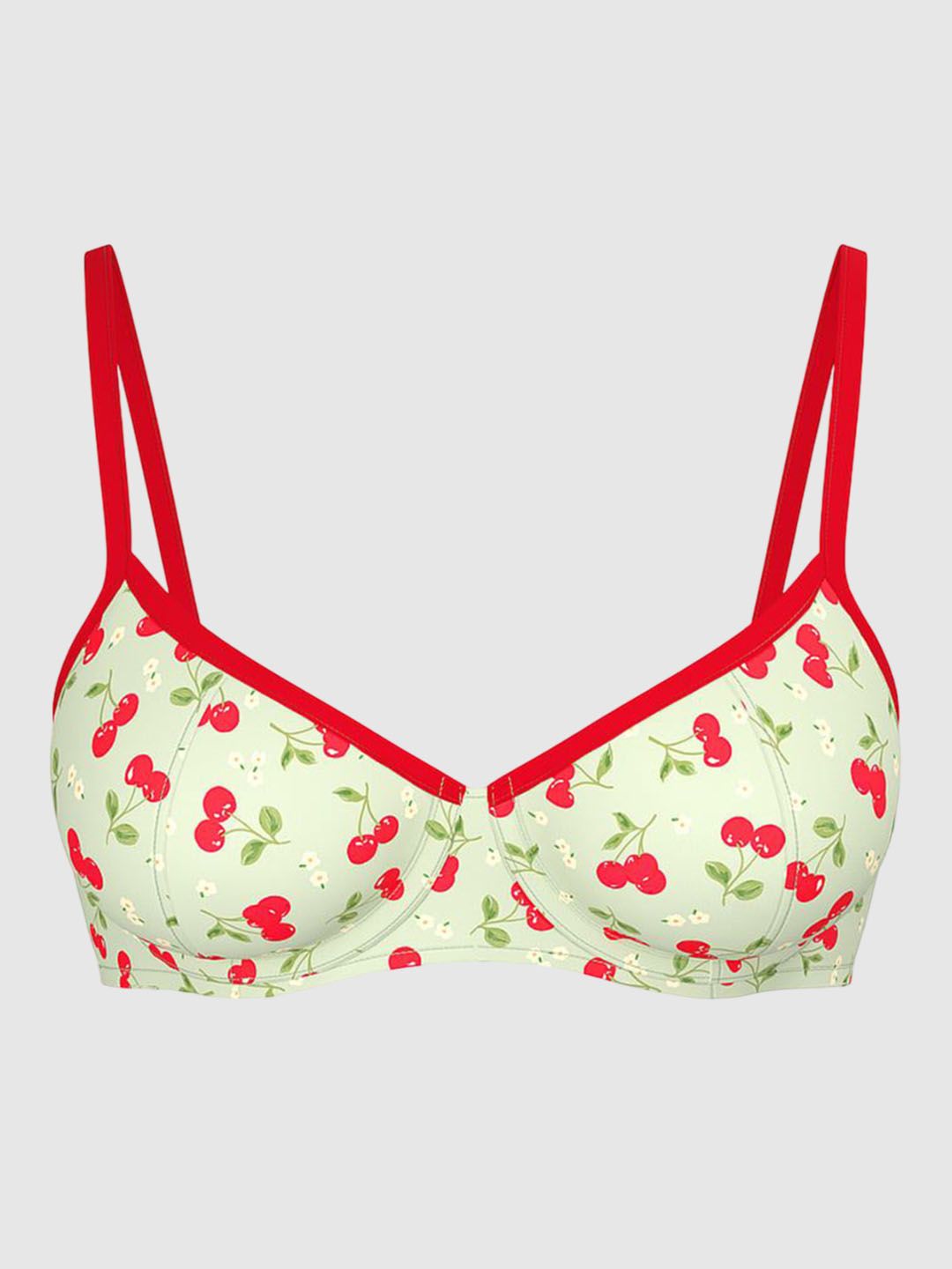 Green and red printed bikini swim top, has a shoulder strap and sleeveless with back hook closure