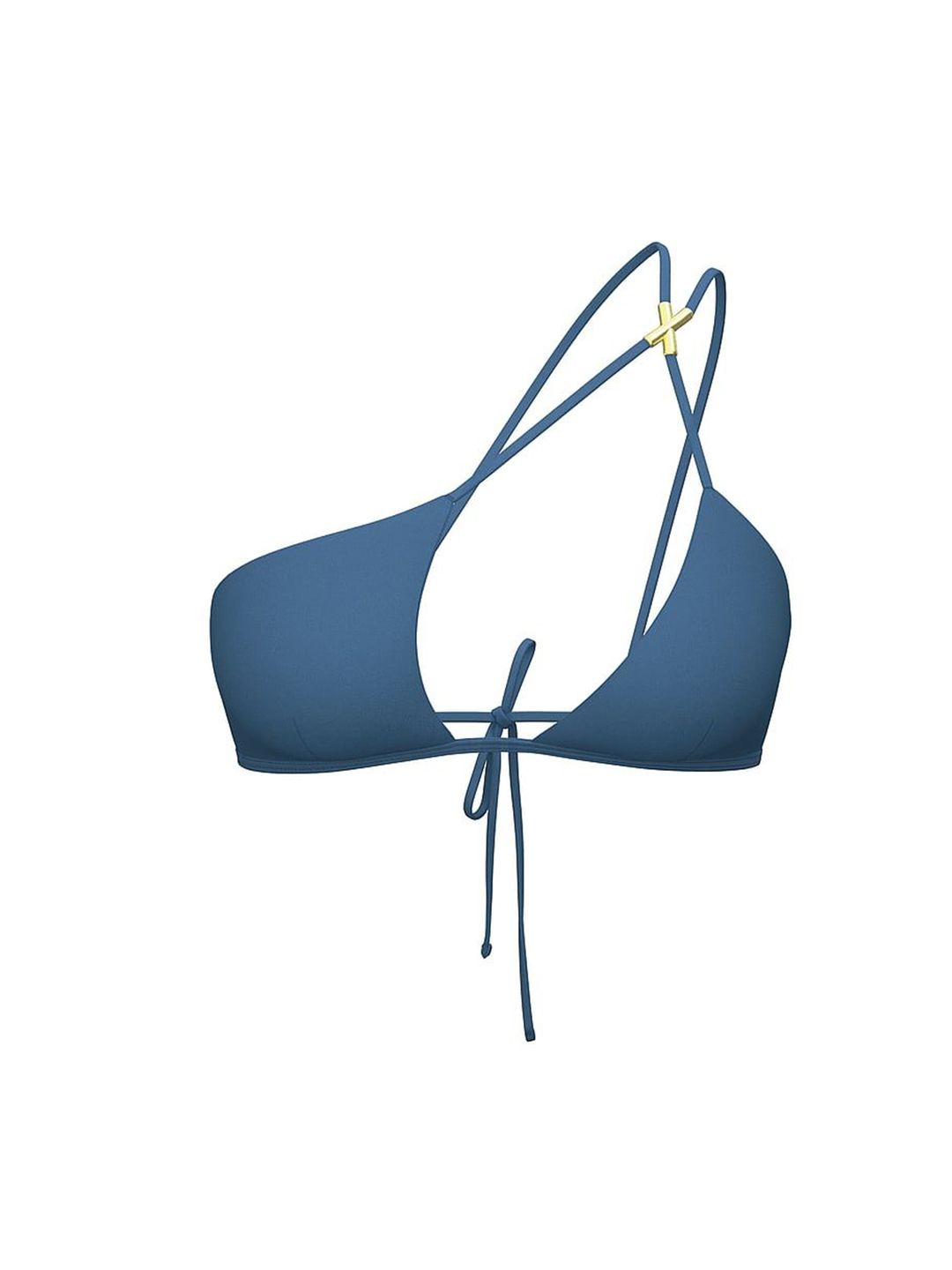 Blue solid swim top, has a one-shoulder straps with back tie-up detail closure