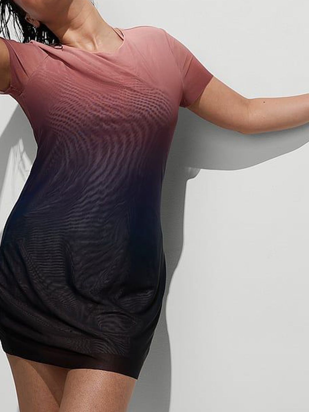 Muave and blue omber cover-up top, has crew neck, short sleeves and slip-on closure