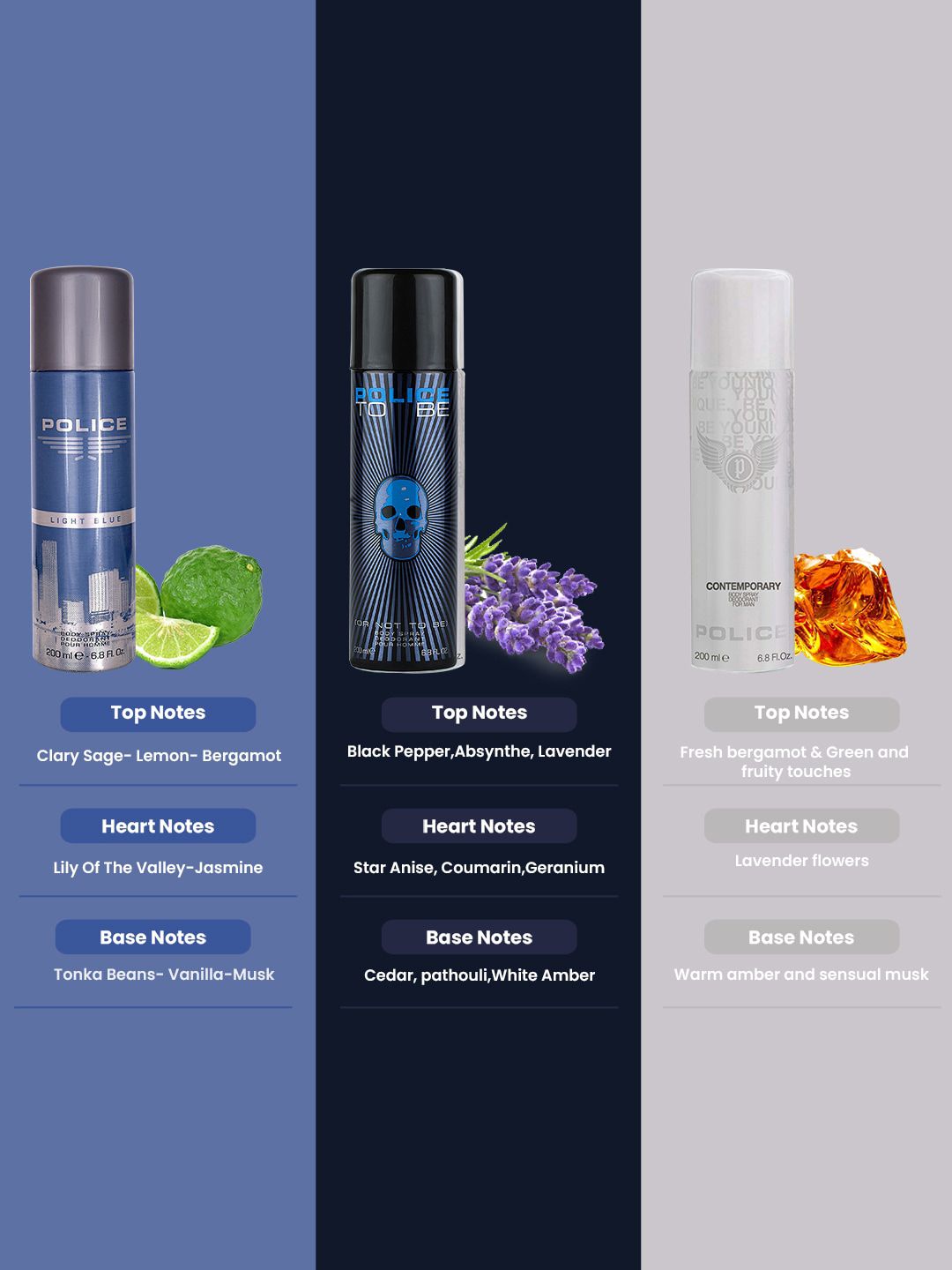 Light blue: Top Notes: Clay Sage, Lemon, BergamotHeart Notes:Lily of the valley, JasmineBase Notes: Tonka beans, Vanilla, MuskT be man: Top notes: Black peper, Absynthe, LavenderHeart notes: Star anise Coumarin, GeraniumBase notes: Cedar, Pathouli, White amberContemperory: Top notes: Fresh bergamot green and fruity touchesHeart notes: Lavender flowersBase notes: Warm amber and sensual musk