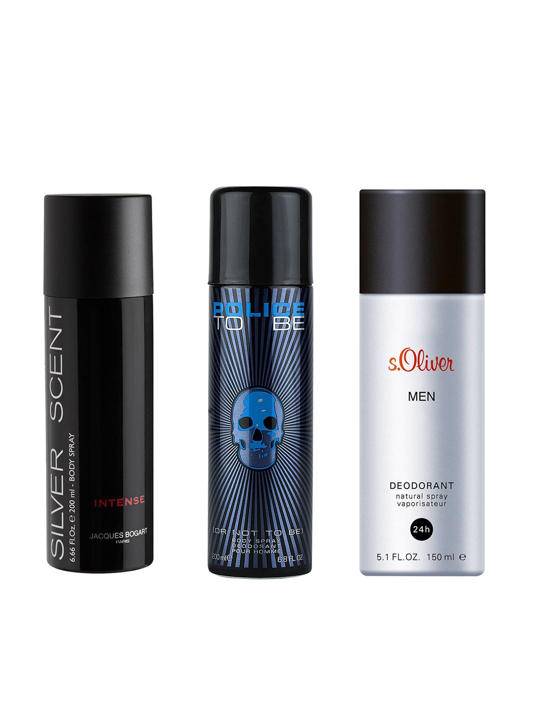Jacques Bogart Silver Scent Intense -Silver Scent by Jacques Bogart is a Oriental Woody fragrance for men. Silver Scent was launched in 2006. Top notes are orange blossom and lemon; middle notes are rosemary, nutmeg, coriander, lavender, geranium and cardamom; base notes are litchi, tonka bean, teak wood and vetiver.Police To Be Man -SPICY, FRUITY, WOODY The essence of To Be masterly represents the masculine power and the contrasting elements of life. The virile elegance of black pepper is softened by the fruity notes of grapefruit and the freshness of violet. The heart is expressed by a luminous accord of apple flowers and it ends in a comfortable base note of cedar wood, patchouli, and white amber.s.Oliver Men Deo -The Deodorant Spray with the fragrance of s.Oliver Men is skin-friendly and provides freshness you can rely on. A fragrance for everyone who values character, individuality and charm.