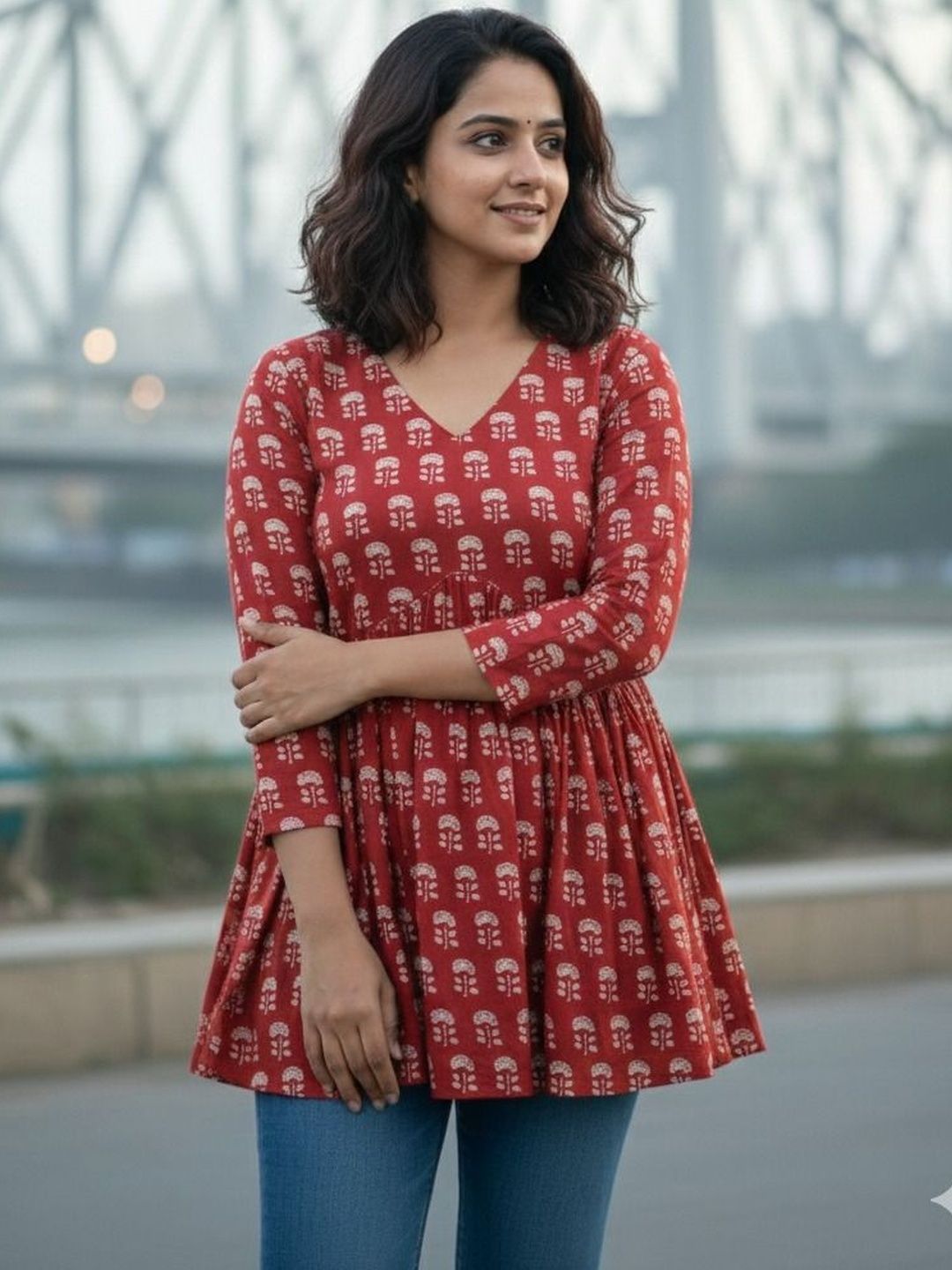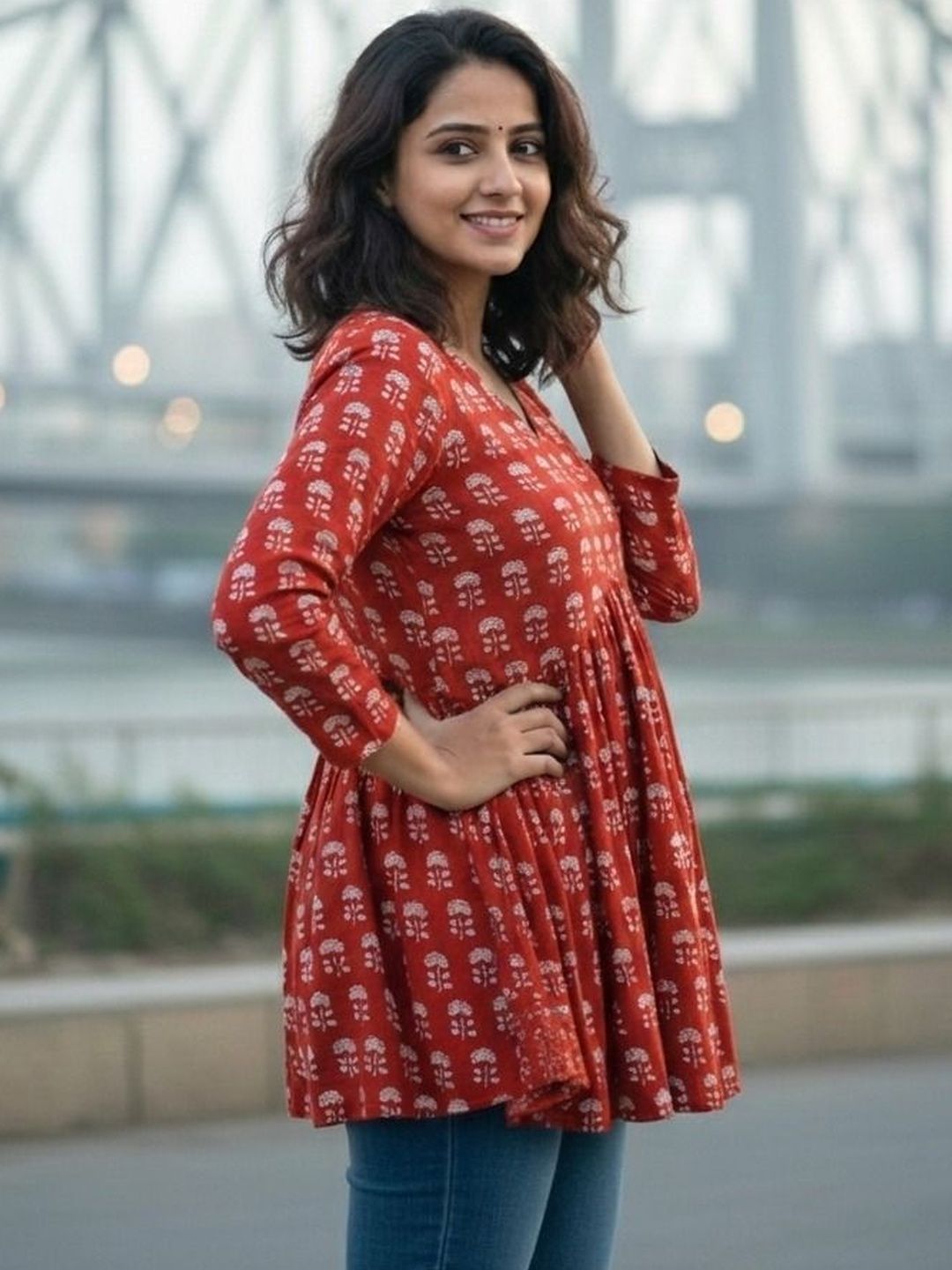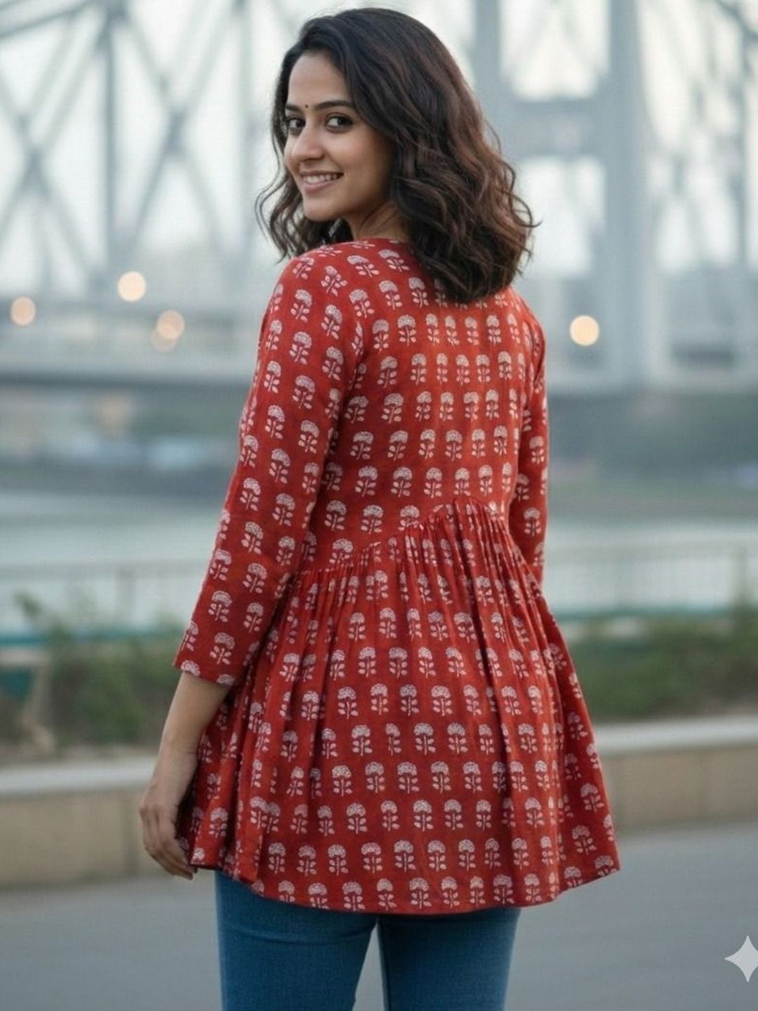 This womens Short kurti is a perfect blend of comfort and elegance. Made from soft and breathable cotton fabric, it is ideal for everyday wear or festive occasions. The flared Short kurti design gives it a graceful and flowy look. It features a stylish neckline and hip lenght that enhances your overall appearance. Perfect for pairing with minimal accessories and traditional footwear.