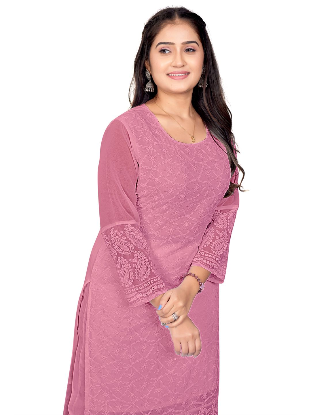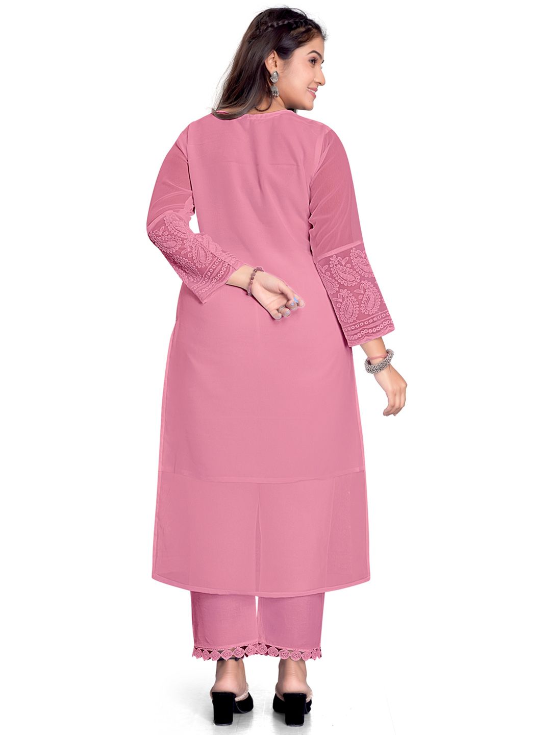 Hand wash separately in cold water using mild detergent. Avoid bleach and harsh chemicals. Do not wring. Dry in shade to preserve color and embroidery. Iron on low heat inside out. Handle with care to retain fabric and design.