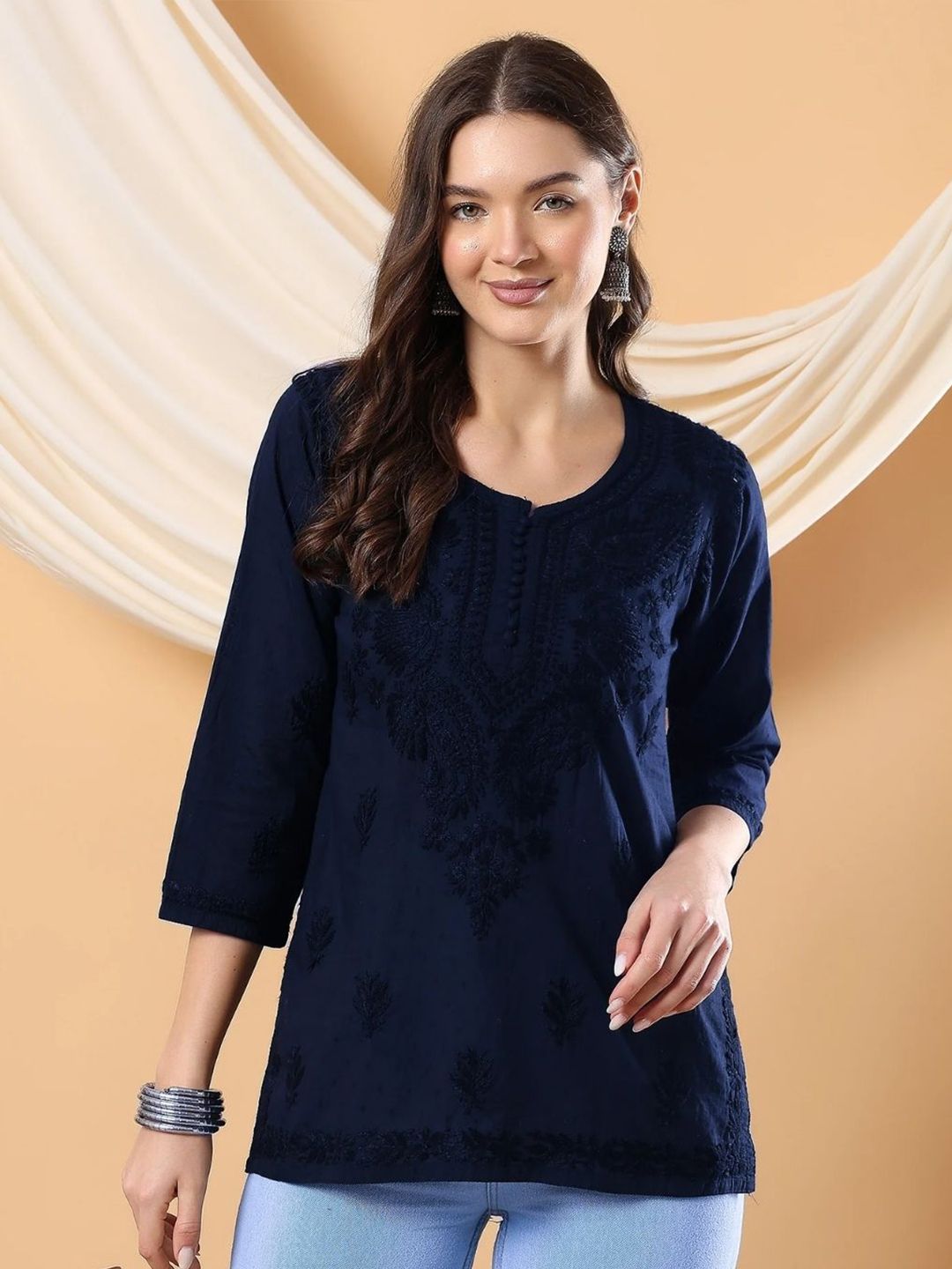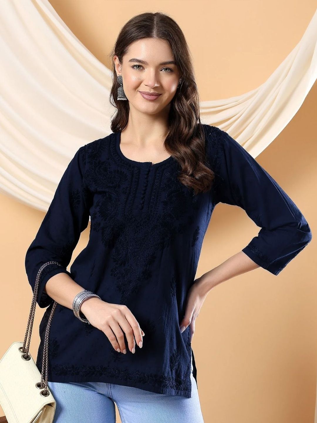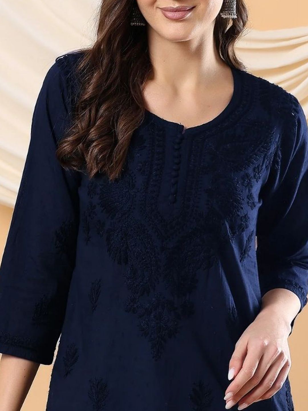 Embrace comfort with this short booti cotton kurti, dyed in rich colors to make your wardrobe pop. The breathable cotton fabric and intricate chikankari detailing make it an ideal choice for daily wear. Pair it with your favorite denim or palazzo pants for a casual yet elegant look. For a more traditional feel, team it with a contrasting dupatta and simple metallic jewelry. This kurti is a must-have for adding an ethnic twist to your everyday outfits.