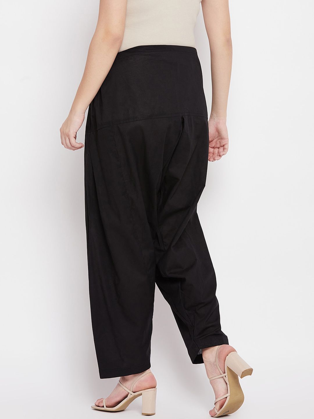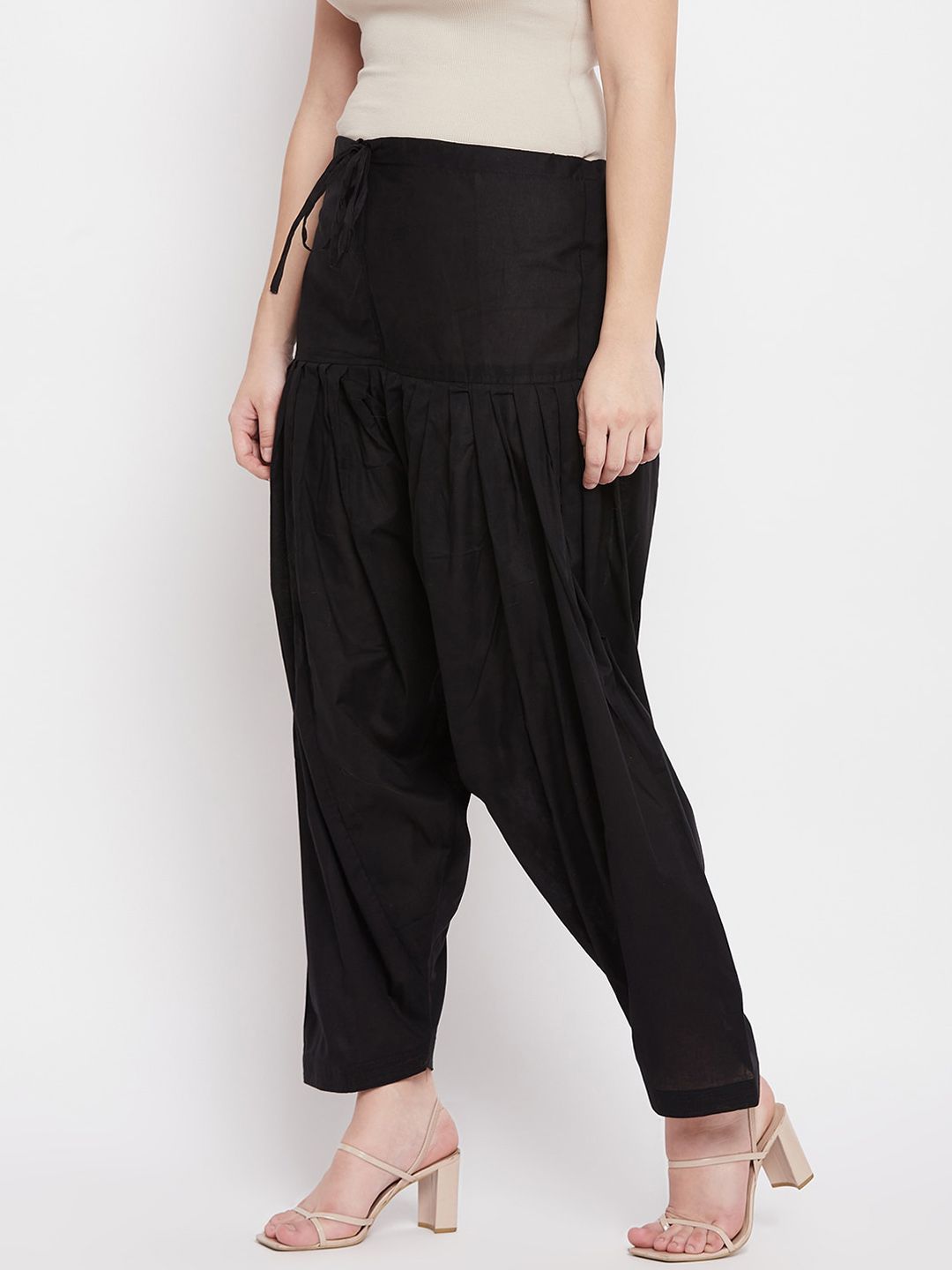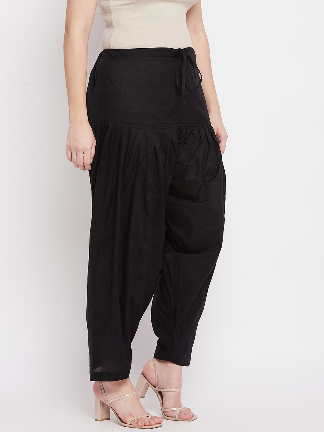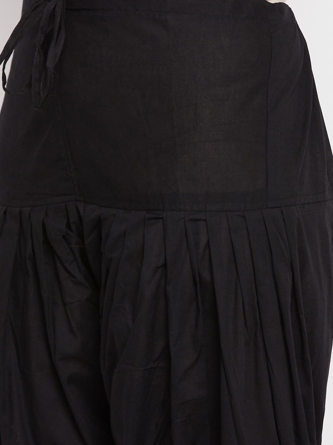 Black solid loose-fit salwar, has a waistband with drawstring closure and pleated details