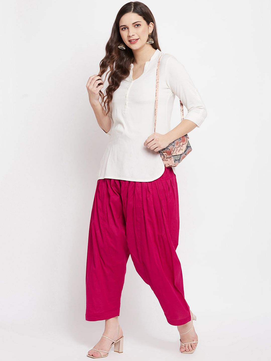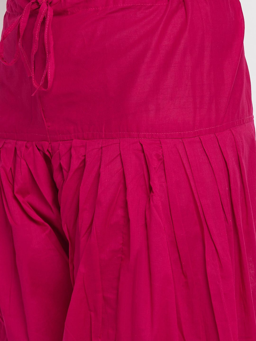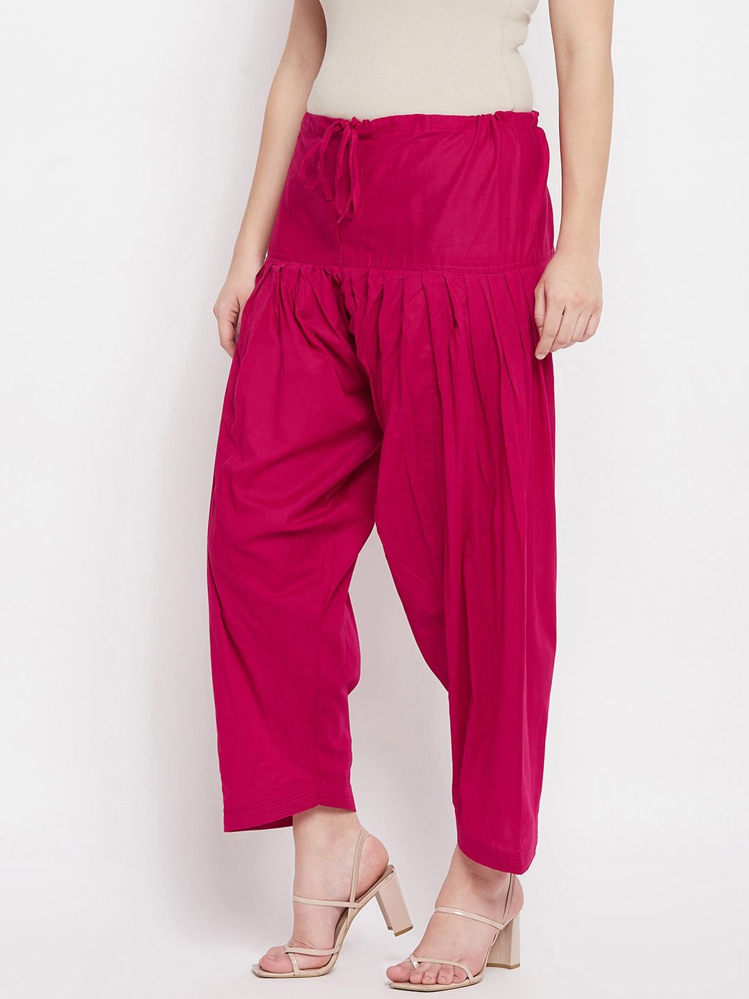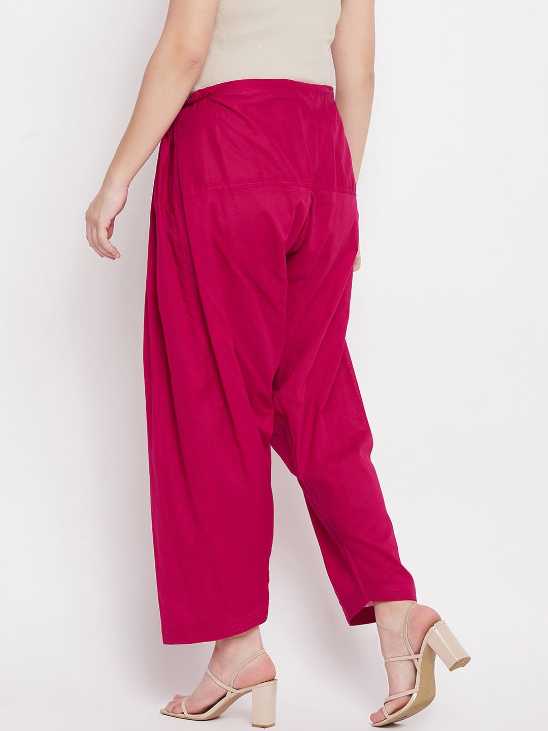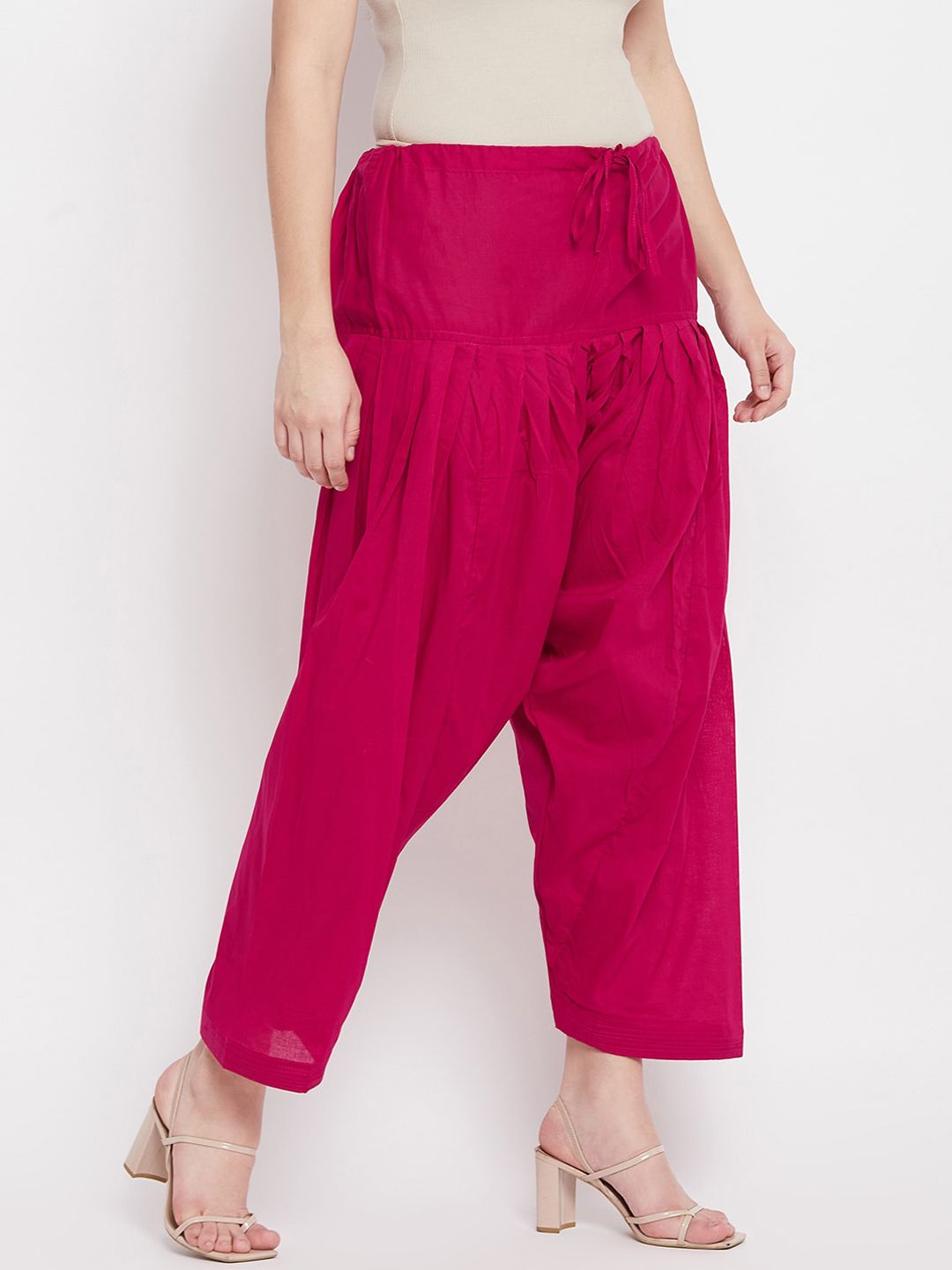 Magenta-pink solid loose-fit salwar, has a waistband with drawstring closure and pleated details