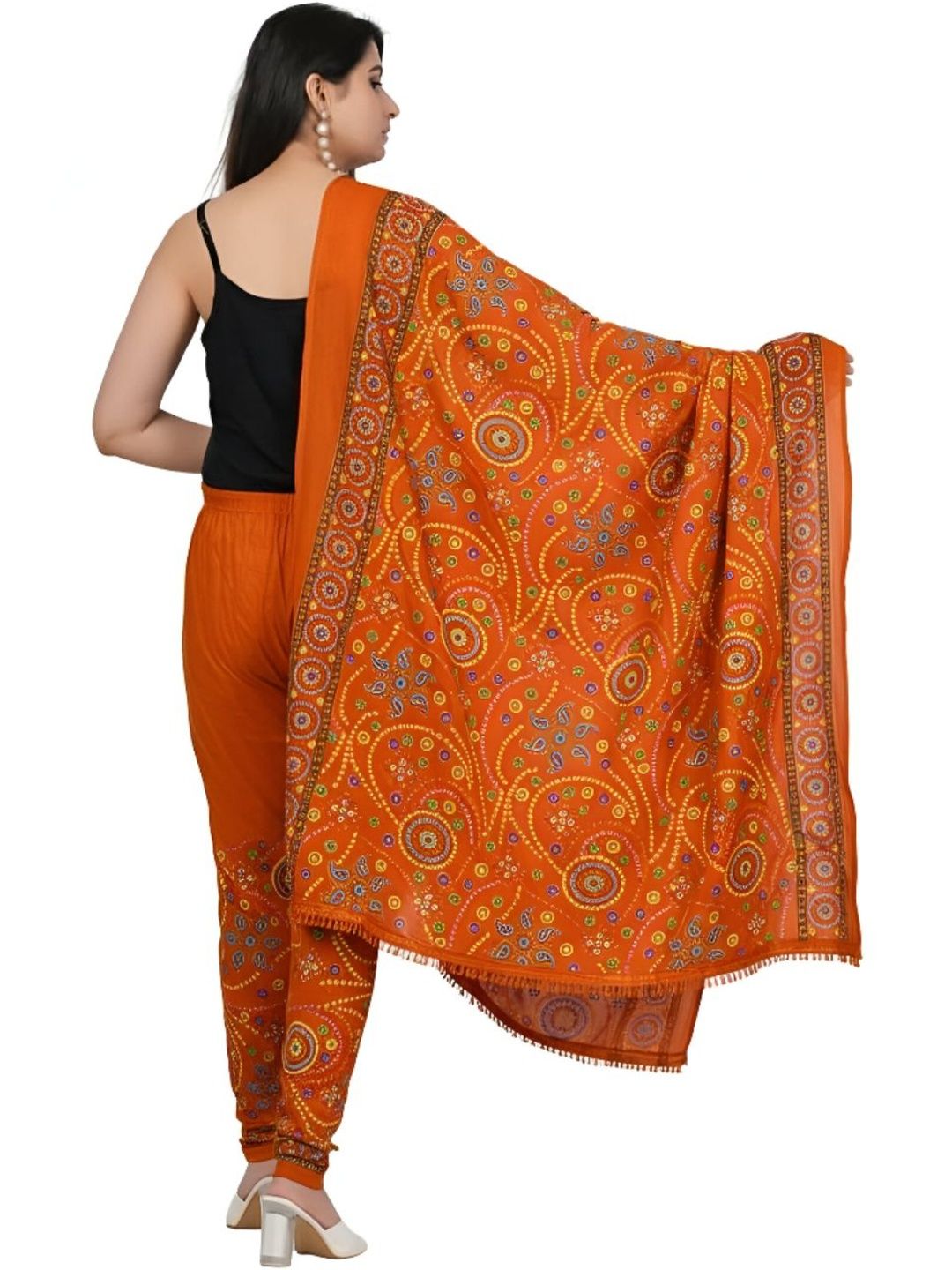 Orange-colored printed ankle-length leggings, has an elasticated waistband with slip-on closure with dupatta
