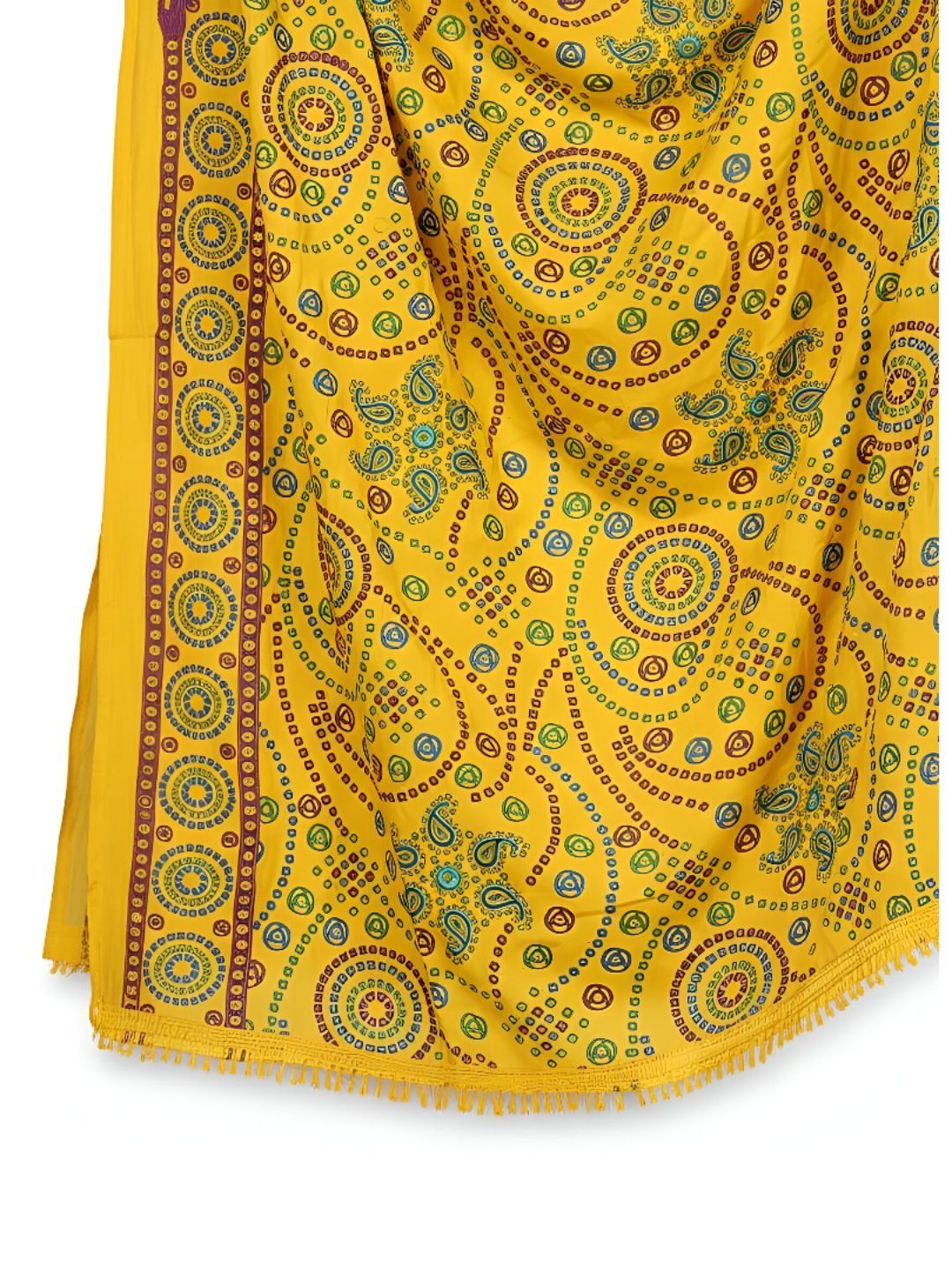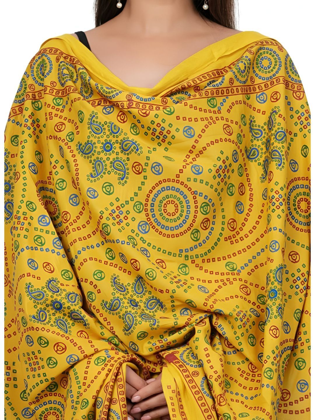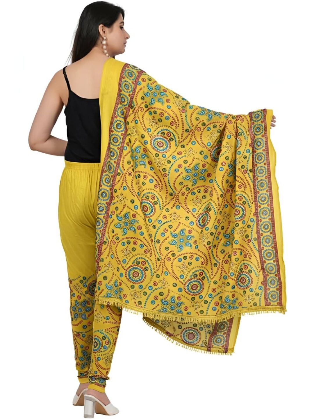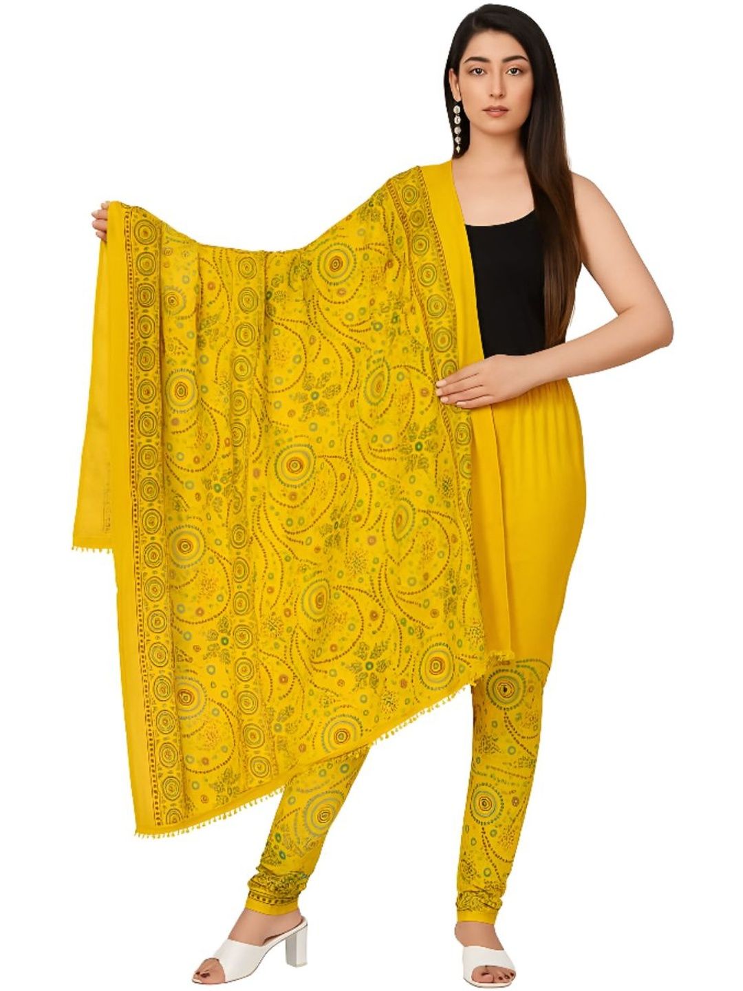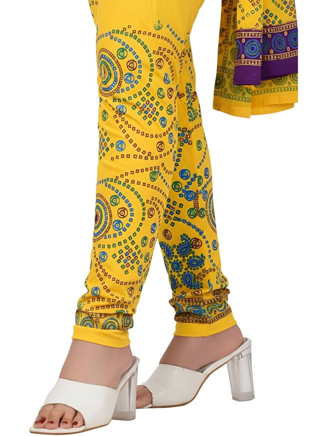 Yellow printed ankle-length leggings, has an elasticated waistband with slip-on closure with dupatta