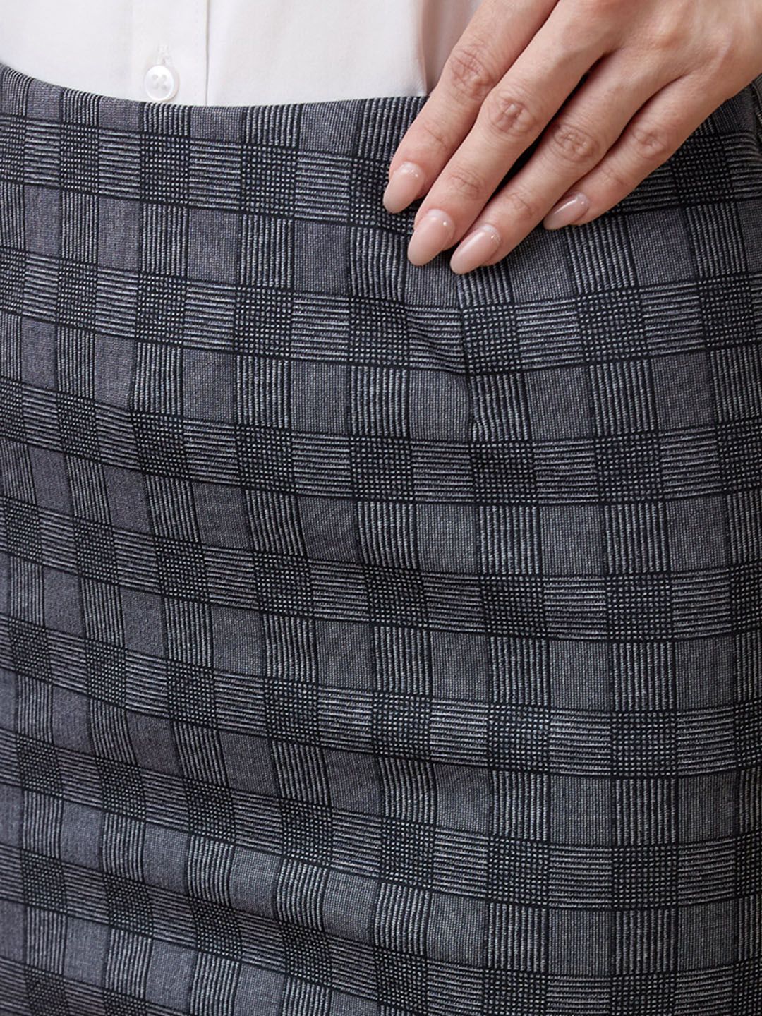 Grey checked straight mini, has an elasticated waistband with slip on closure, and a straight hem