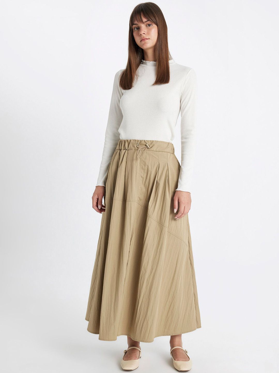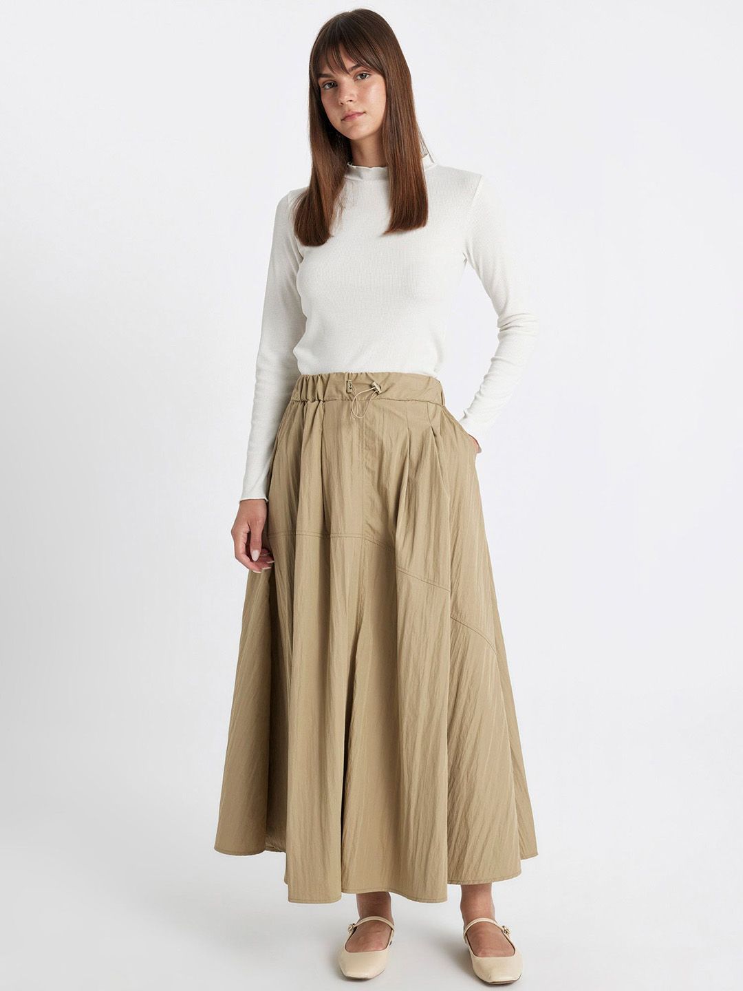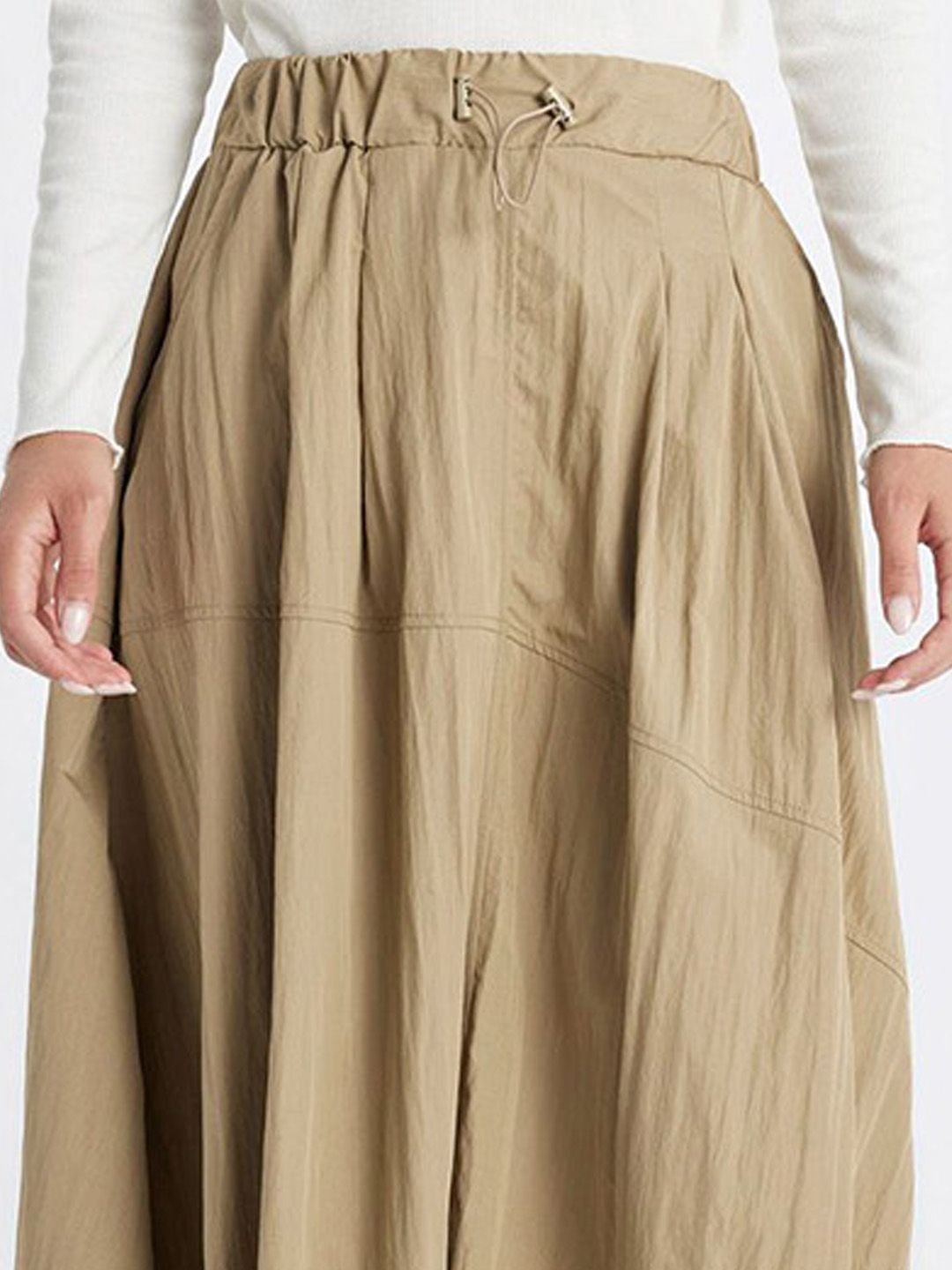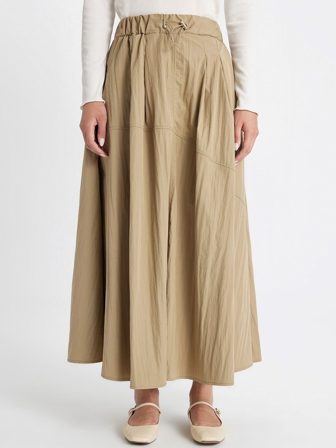 Beige solid flared maxi skirt, has an elasticated waistband with draw-string closure, and a flared hem