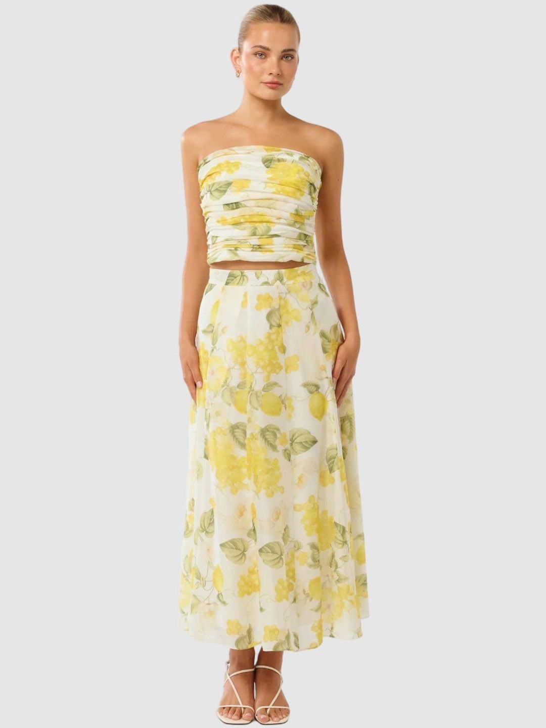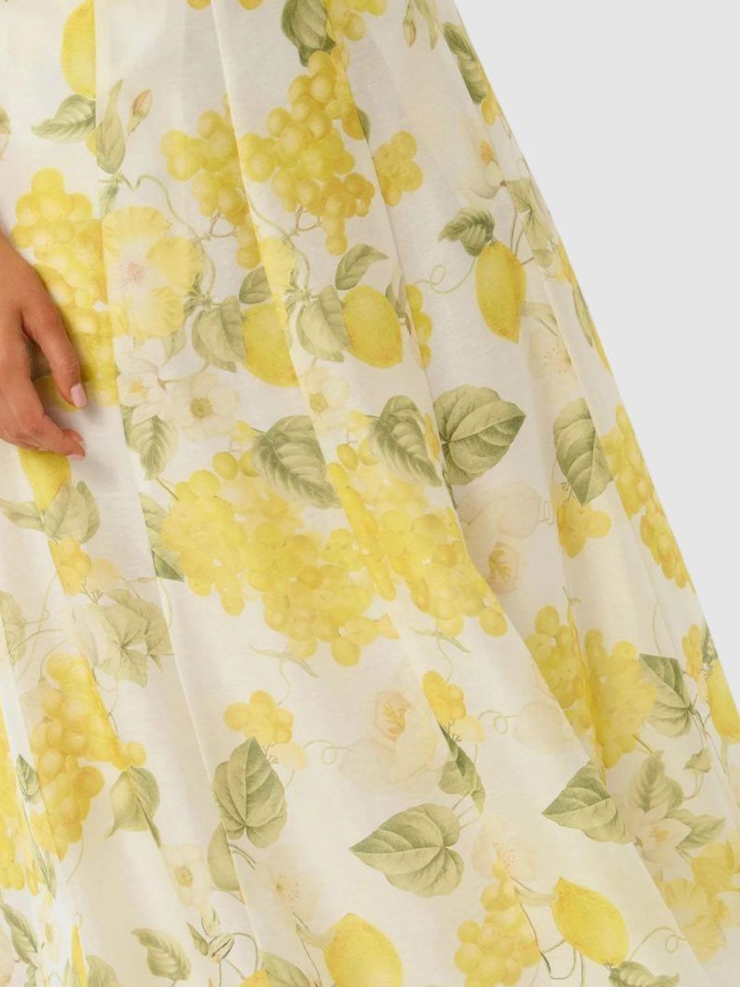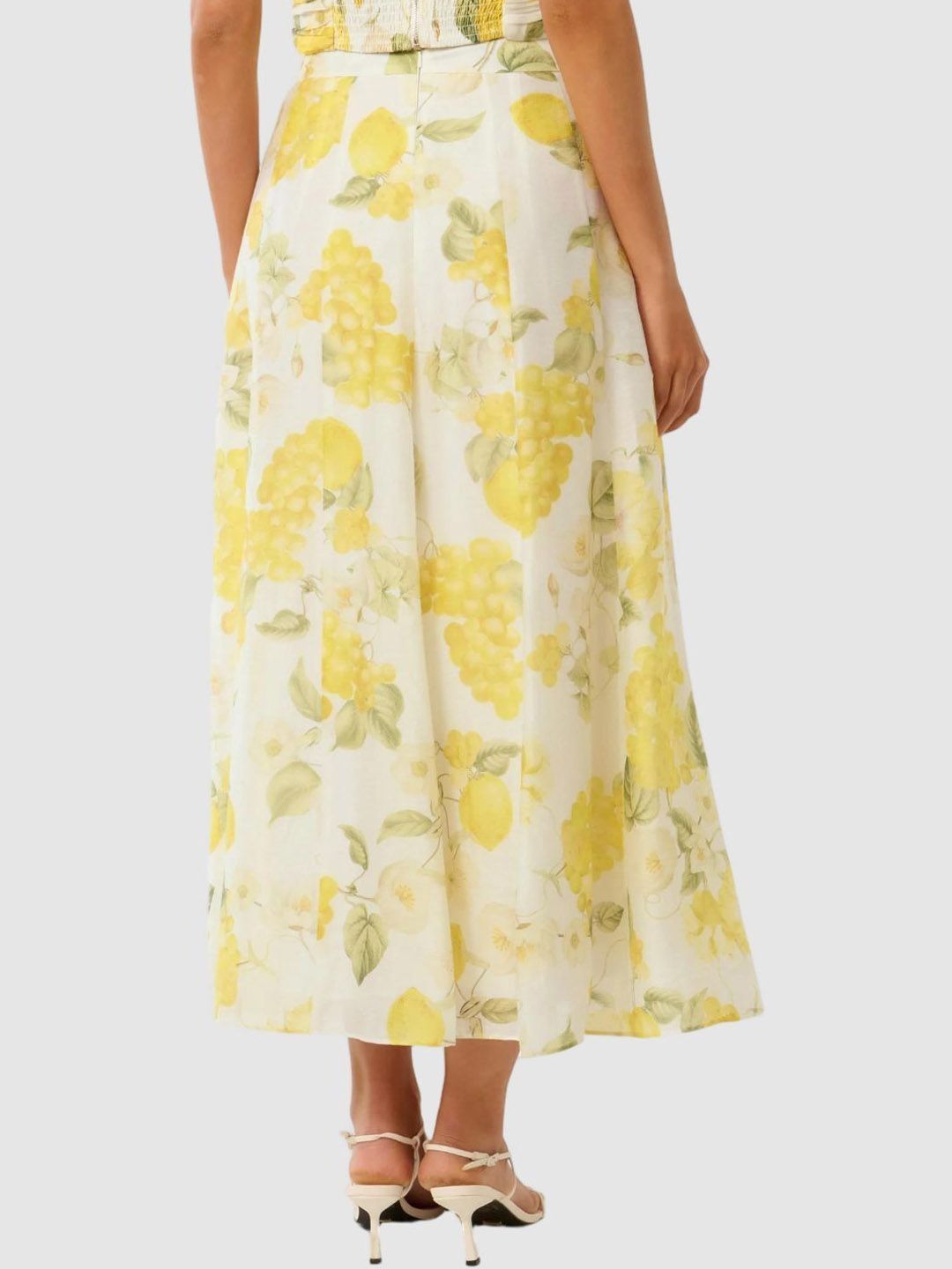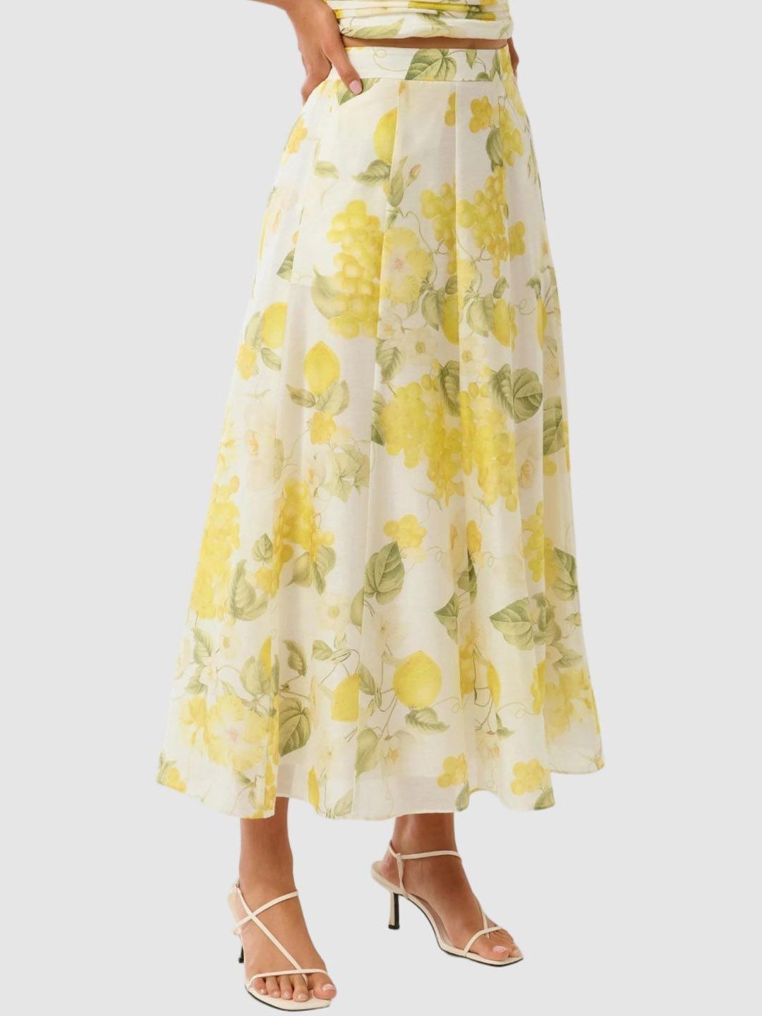 Yellow printed flared maxi skirt, has an elasticated waistband with zip closure, and a flared hem