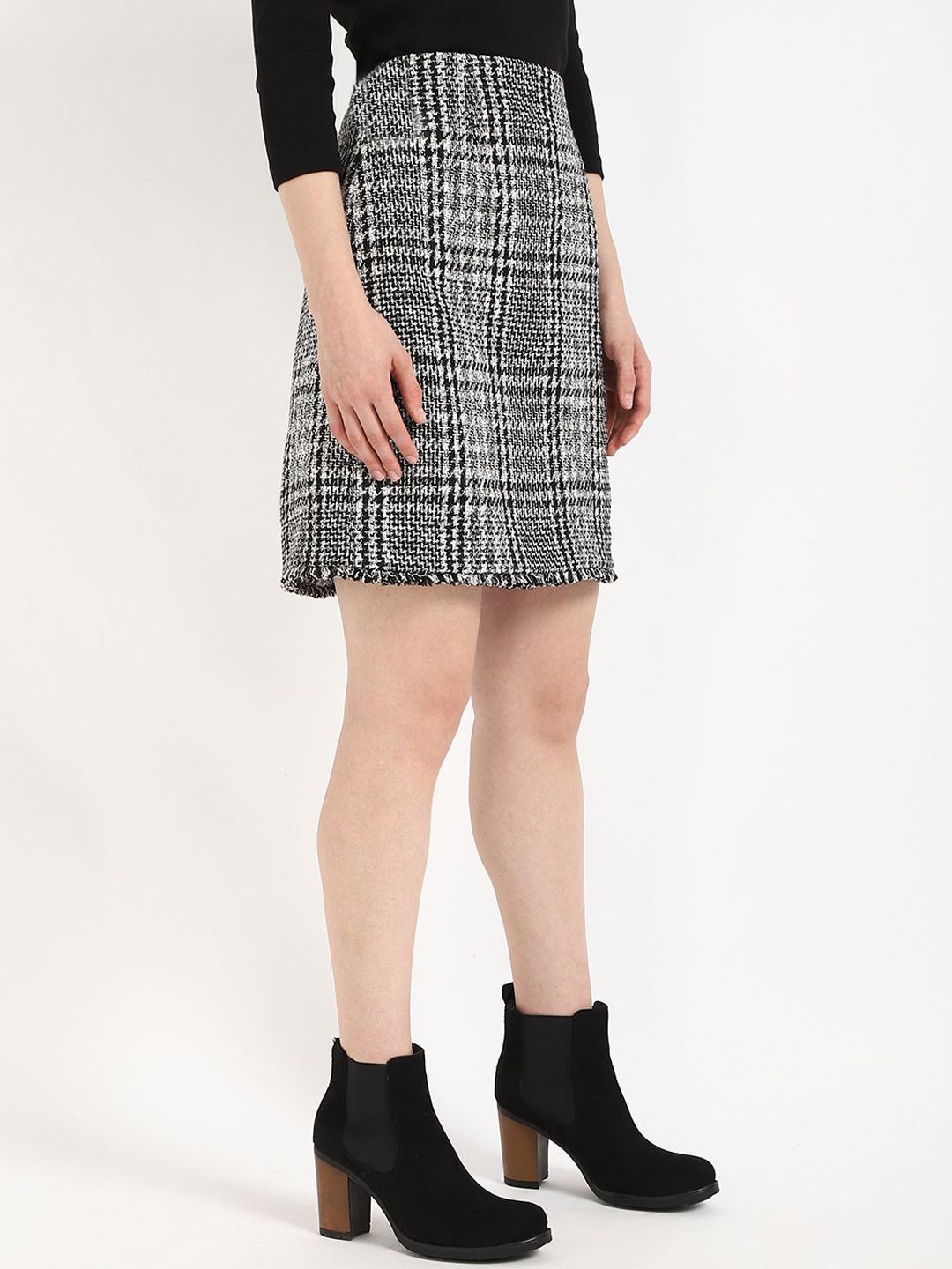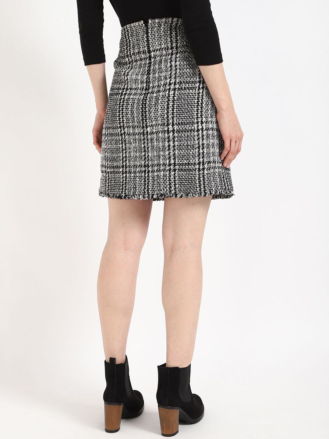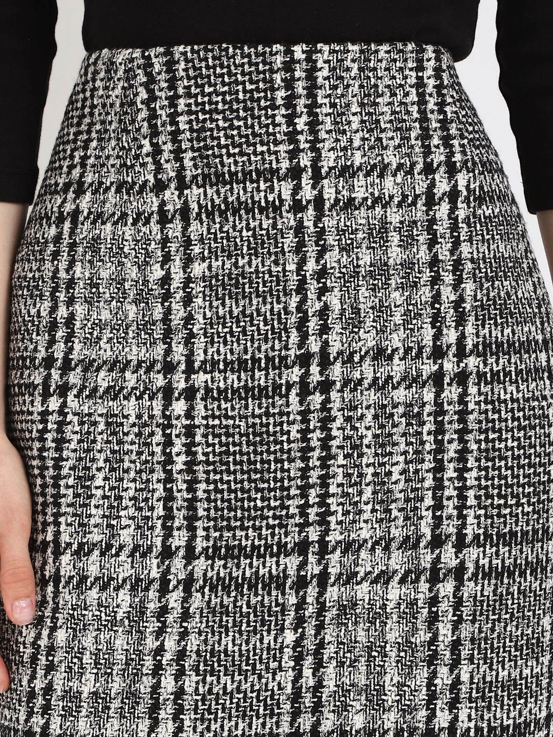 Black checked A-line above knee skirt, has an elasticated waistband with slip-on closure, and a straight hem