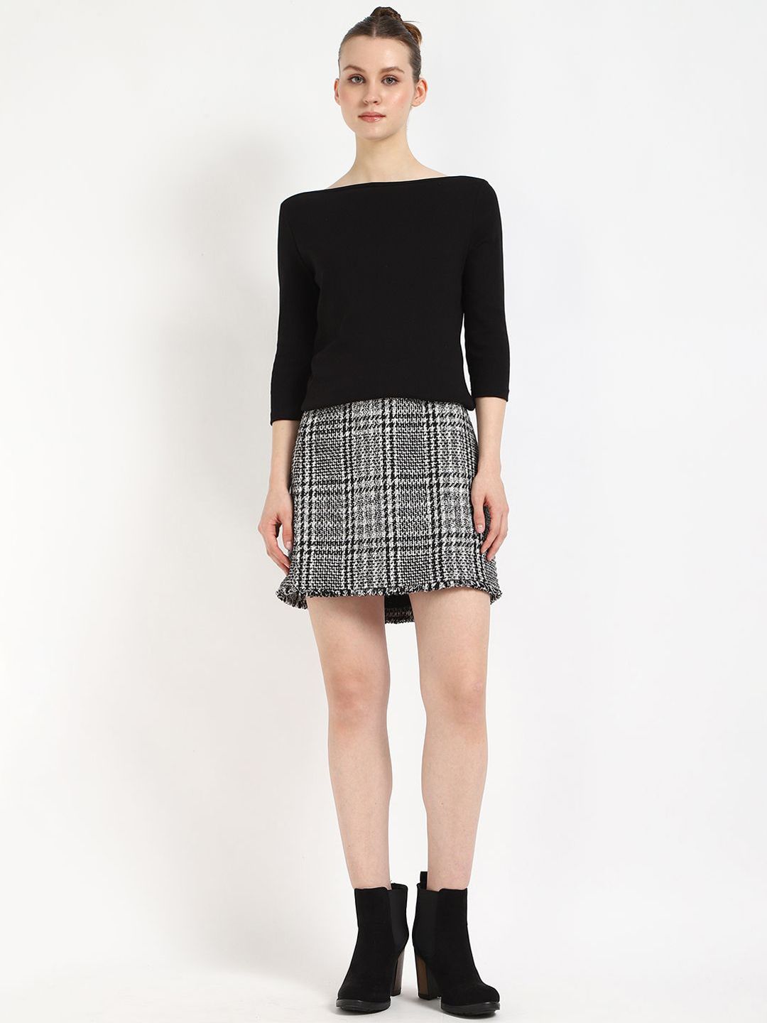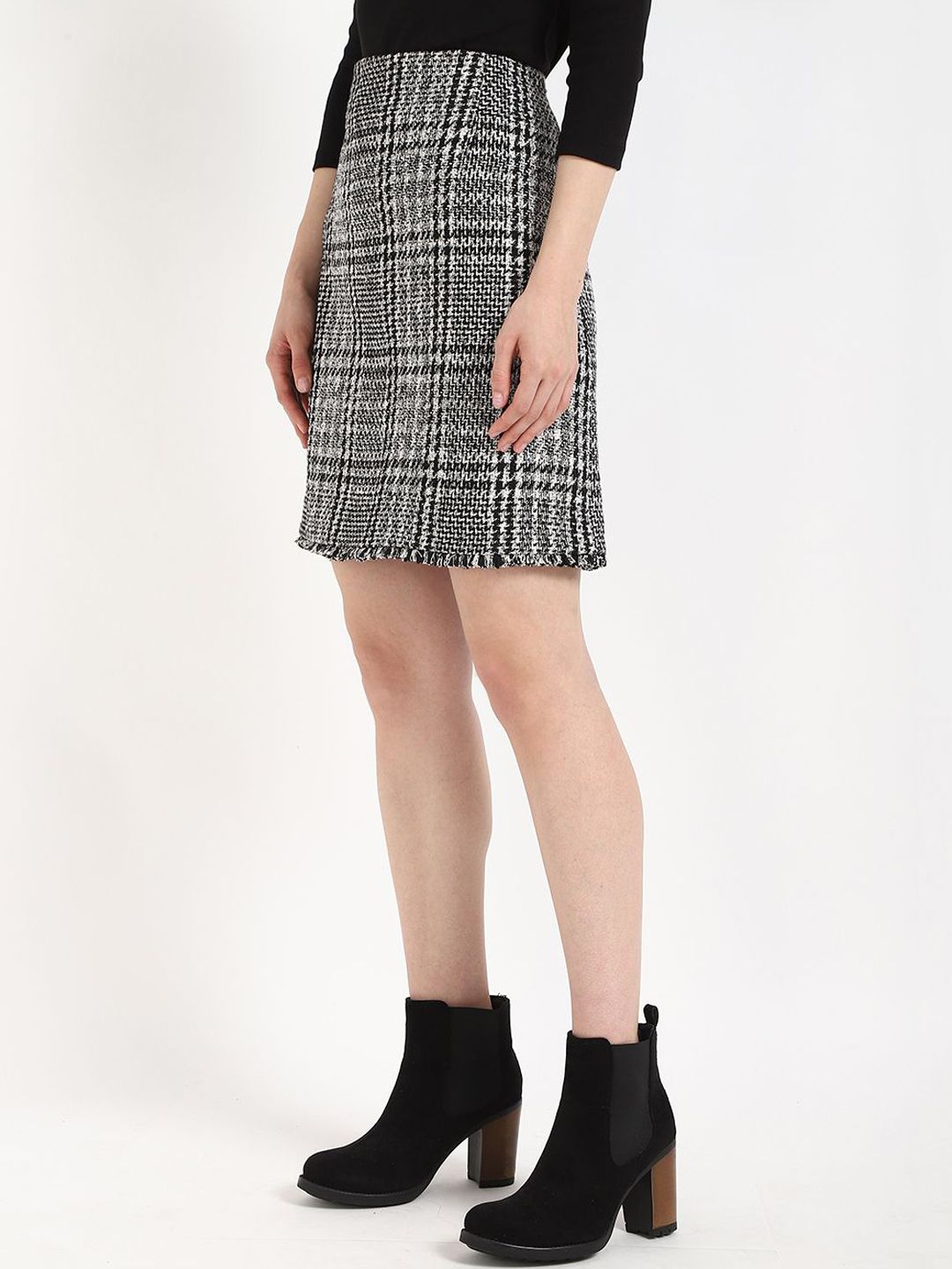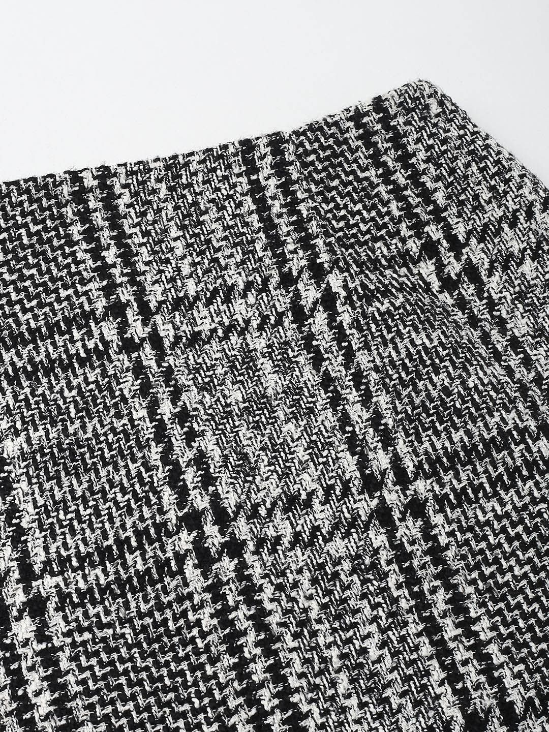 Black checked A-line above knee skirt, has an elasticated waistband with slip-on closure, and a straight hem