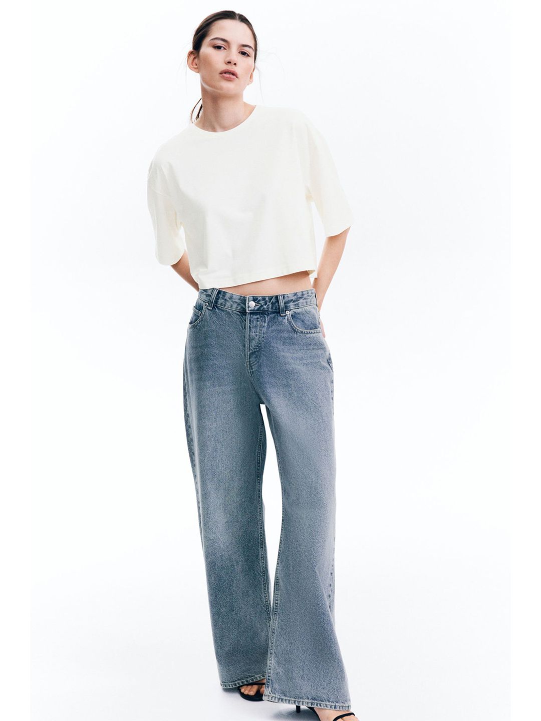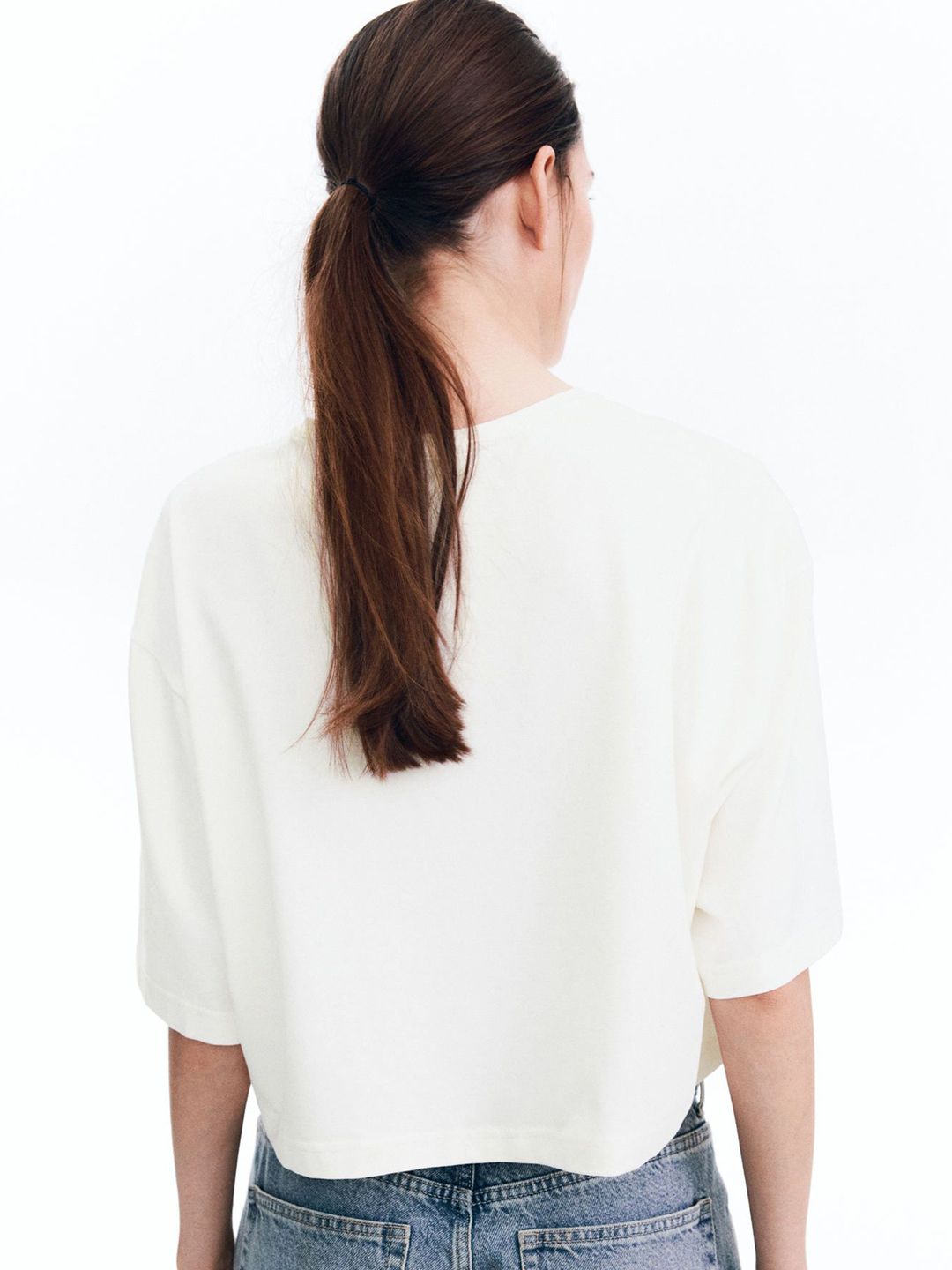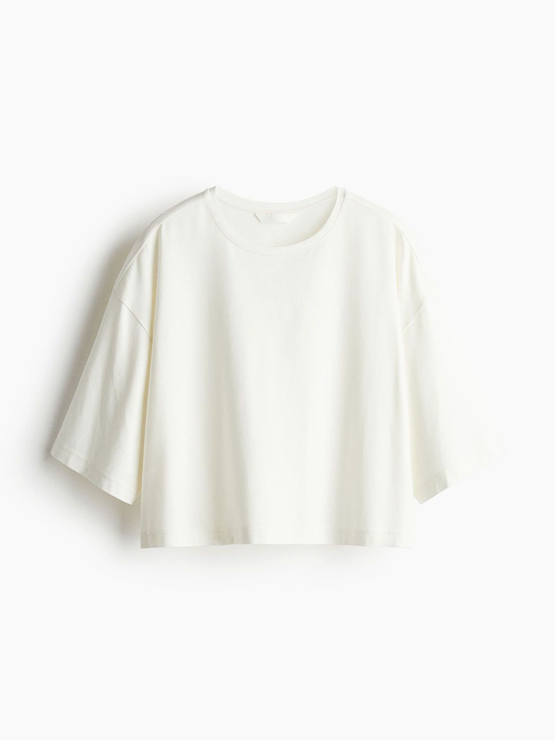 Cropped, boxy-style T-shirt in soft cotton and viscose jersey. Loose fit with dropped shoulders, elbow-length sleeves and a straight-cut hem.