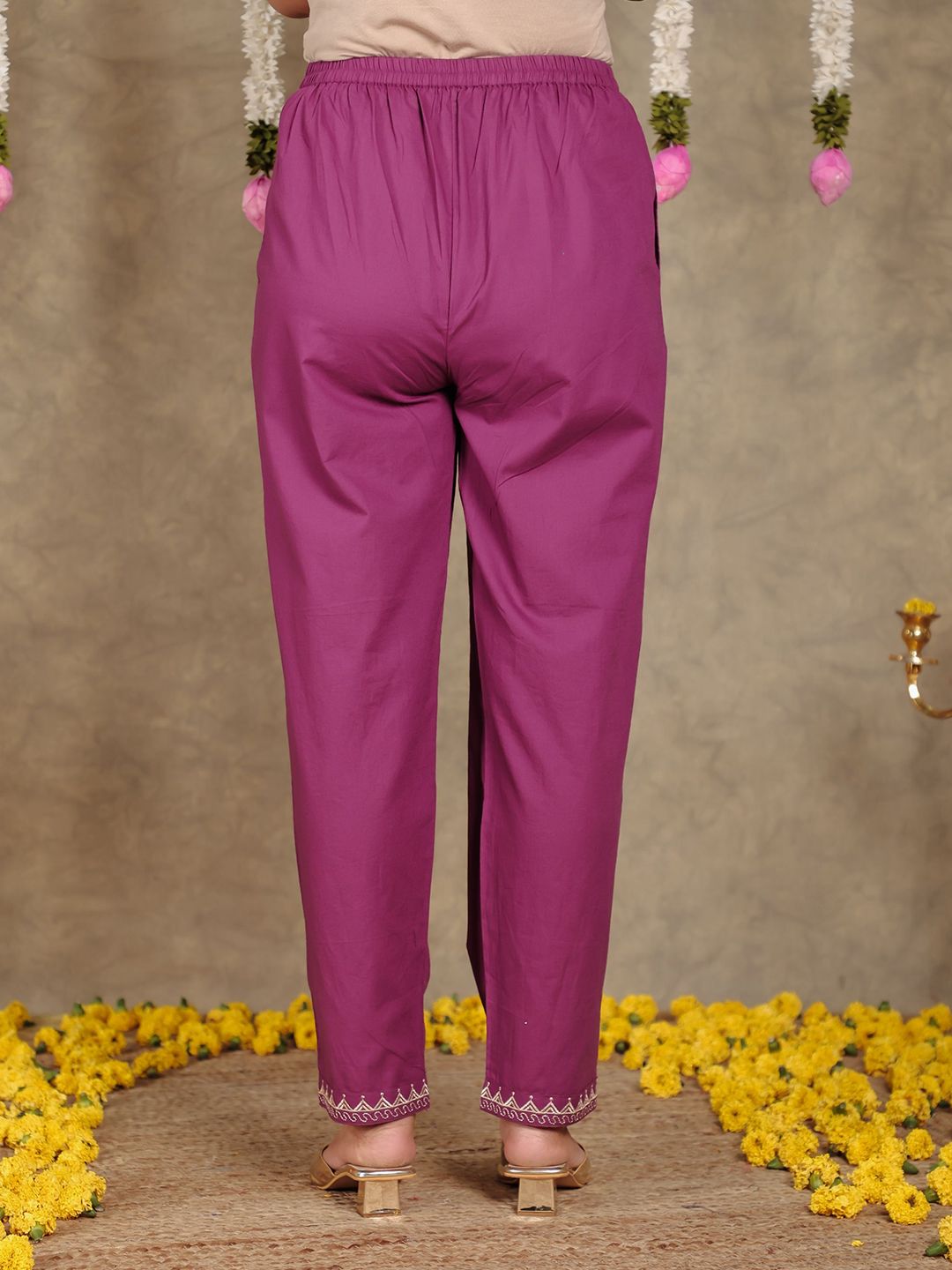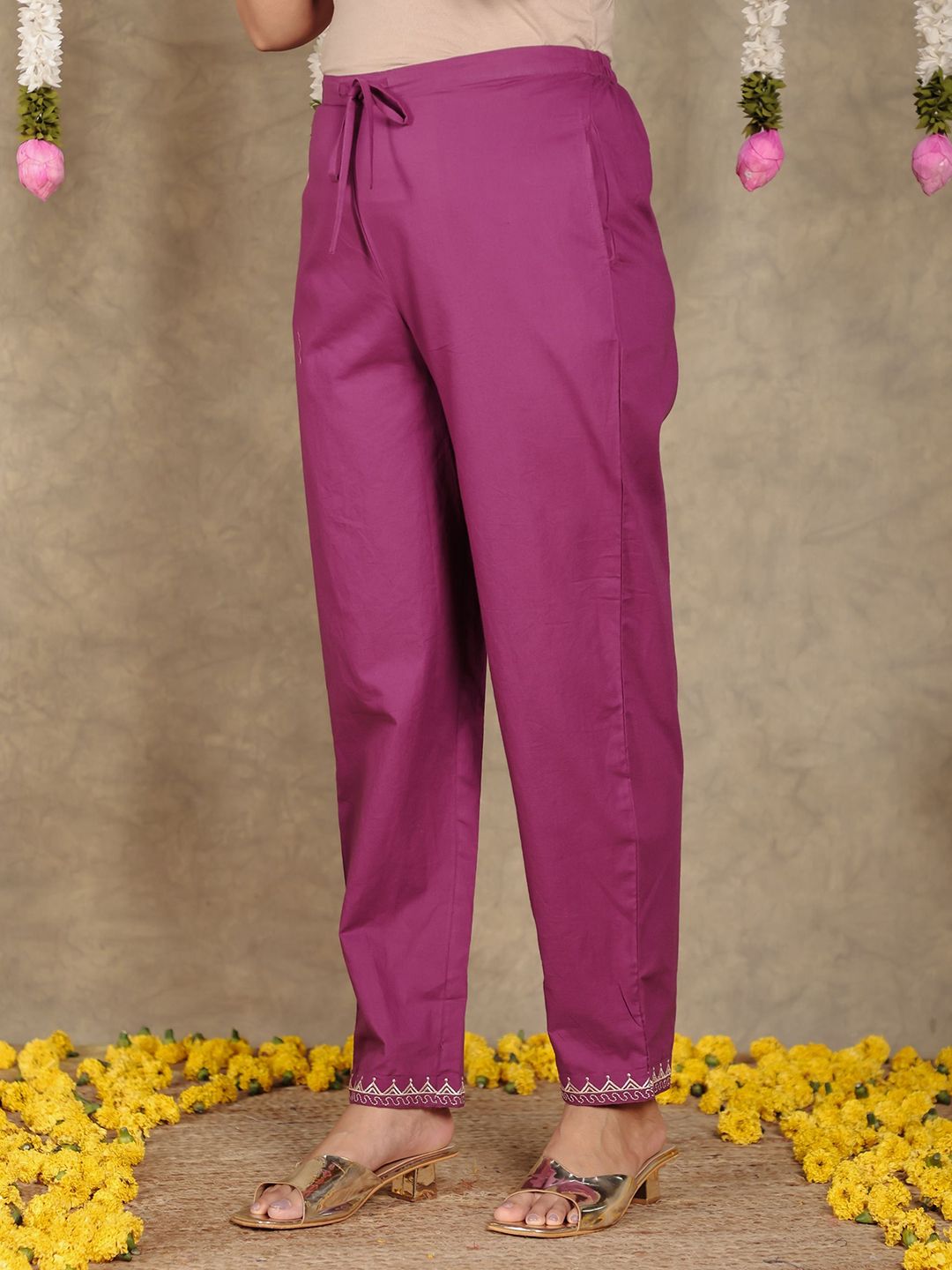 Purple solid regular-fit mid-rise trousers, has a partially elasticated waistband with drawstring closure