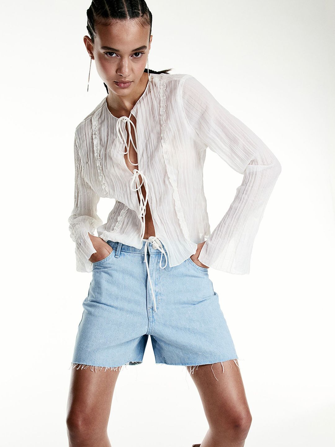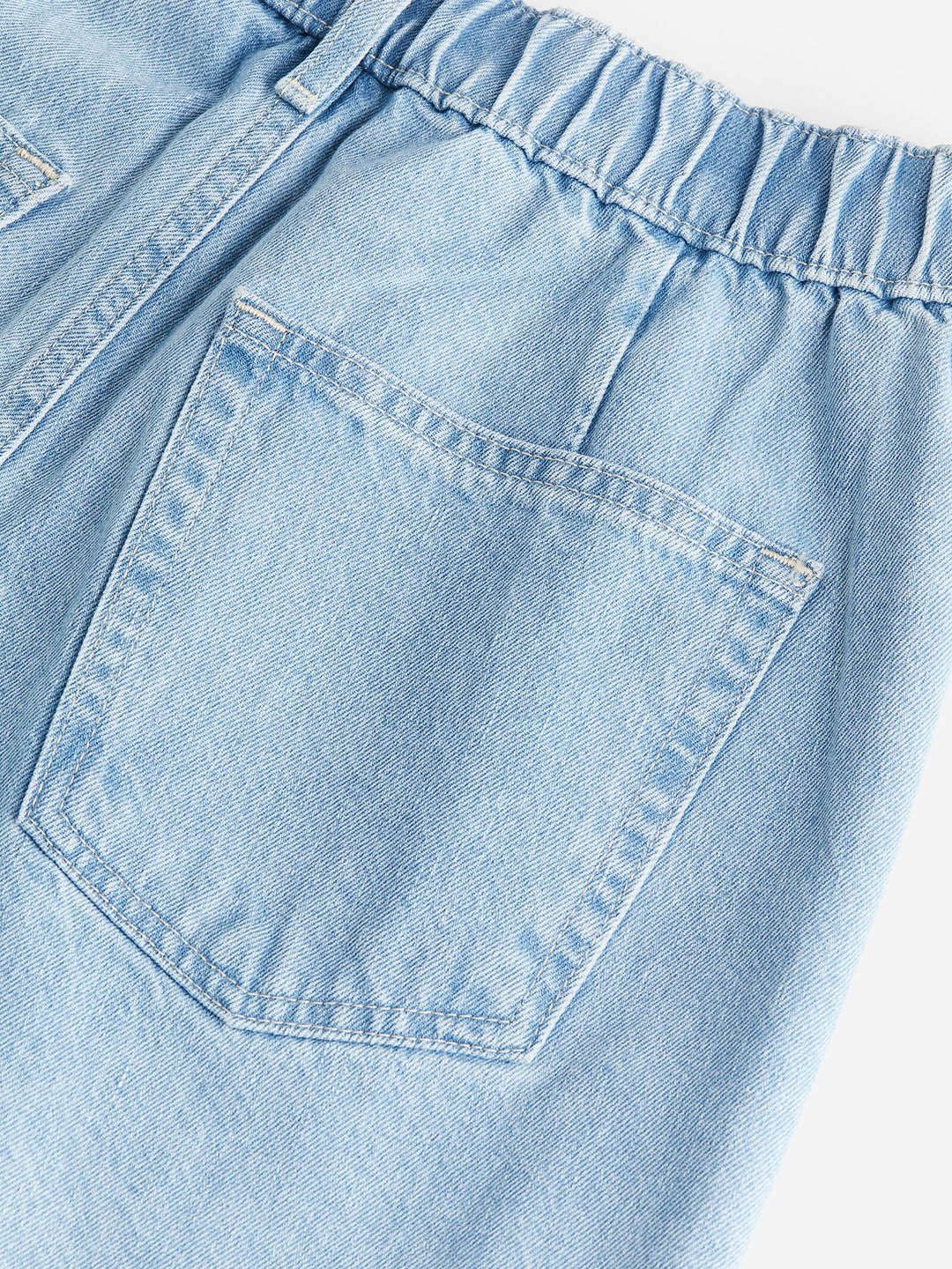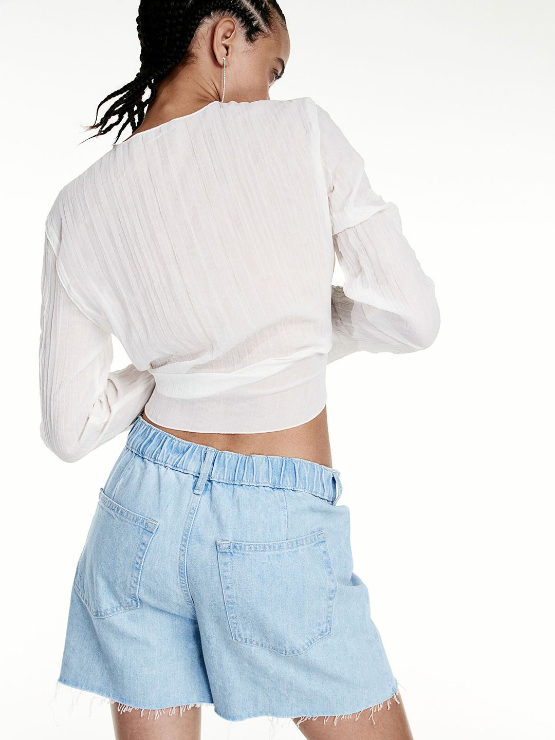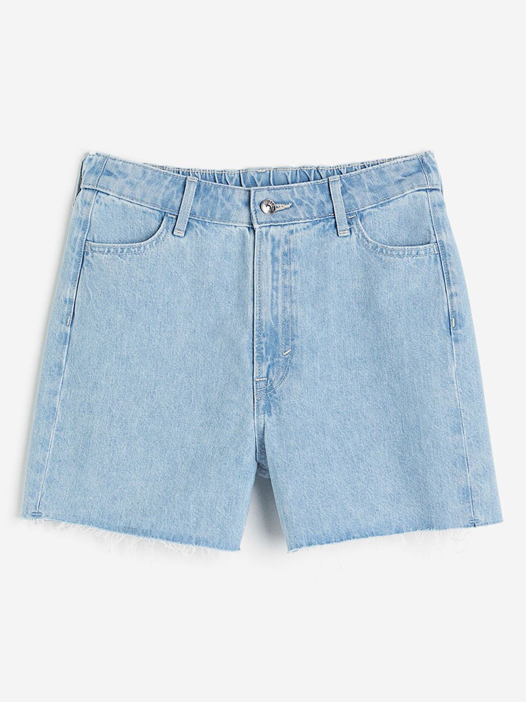 Shorts in rigid denim with covered elastication at the back of the waist. Side pockets, an open back pocket, a zip fly and button, and raw-edge hems.