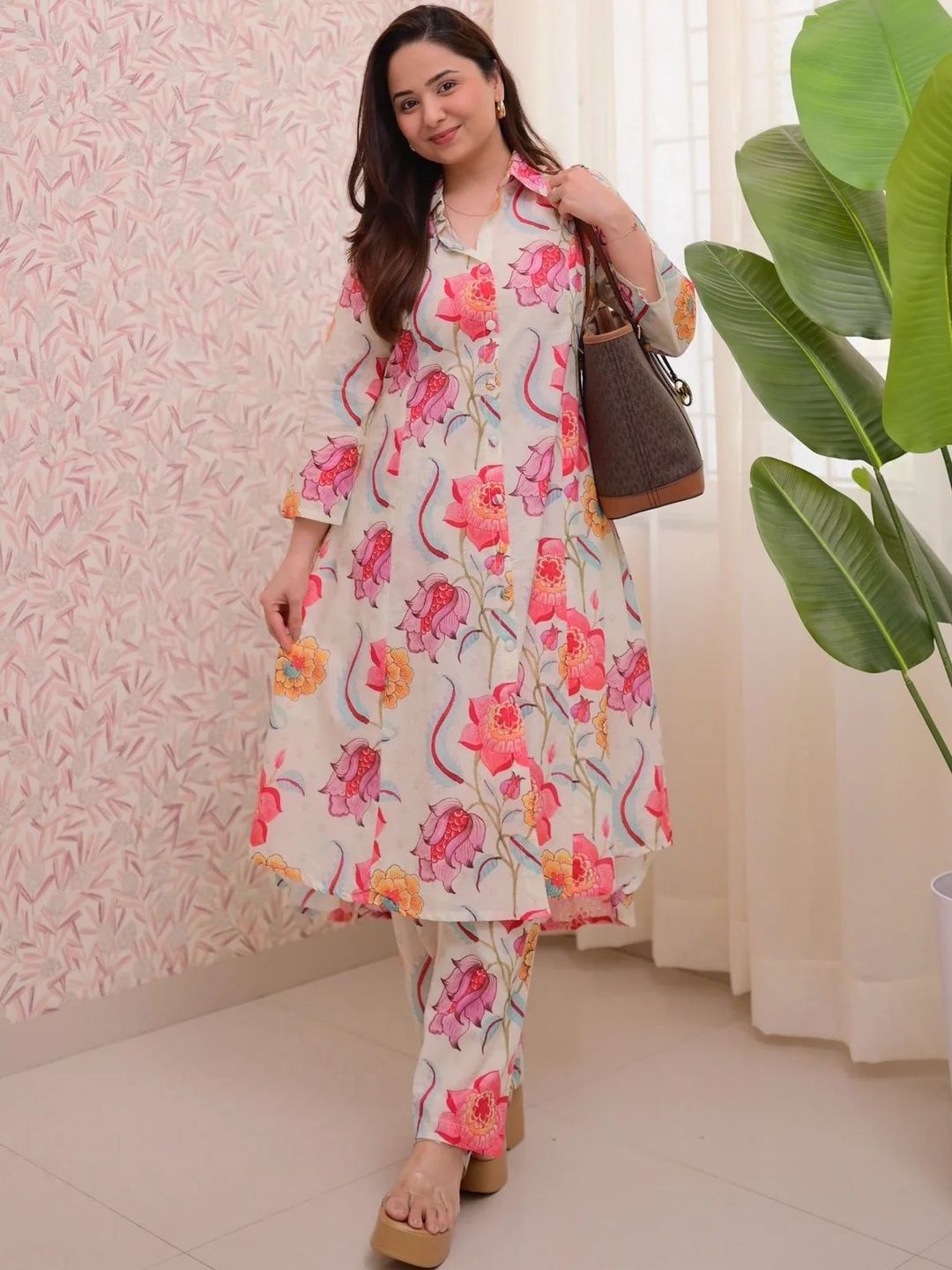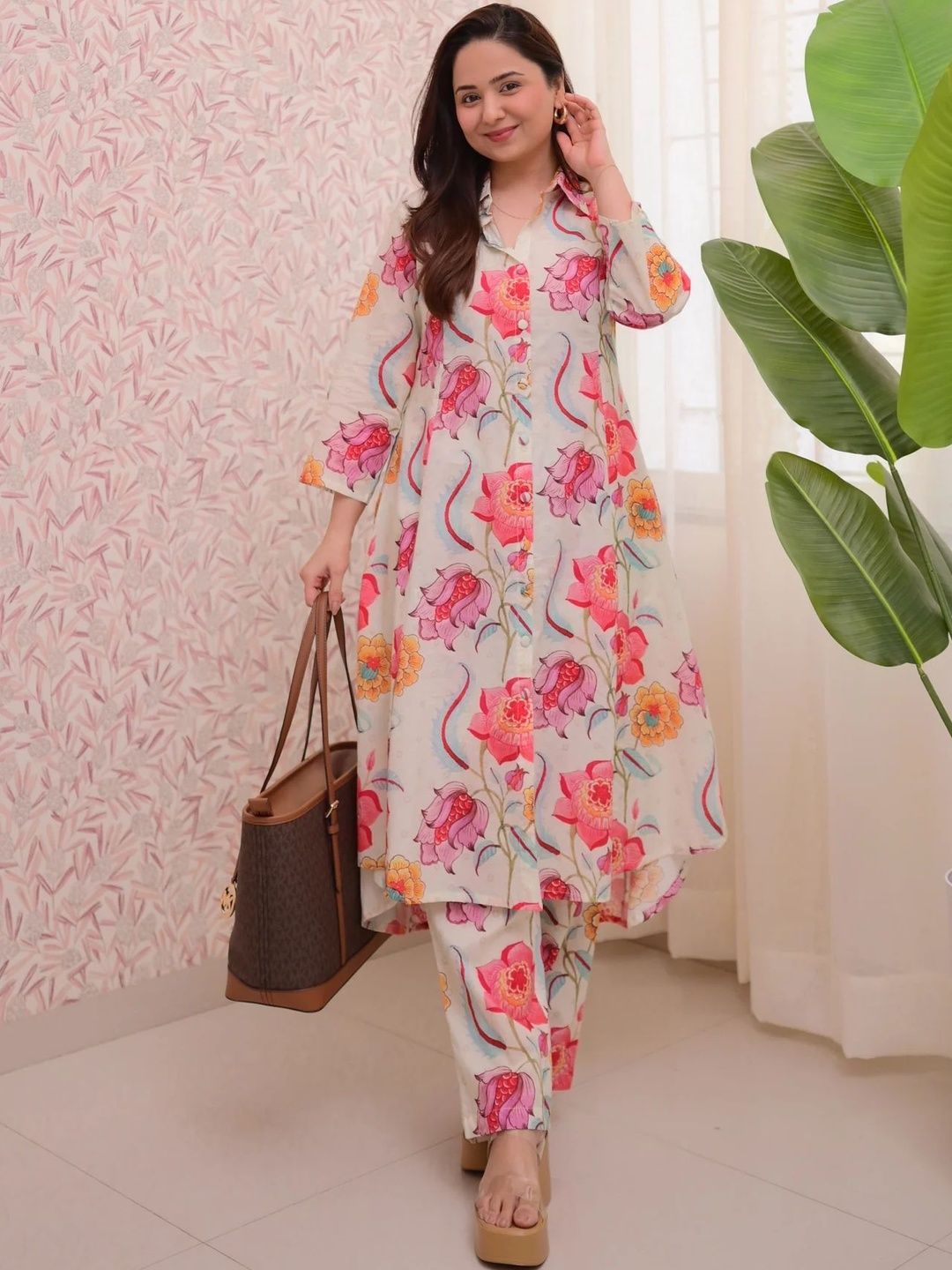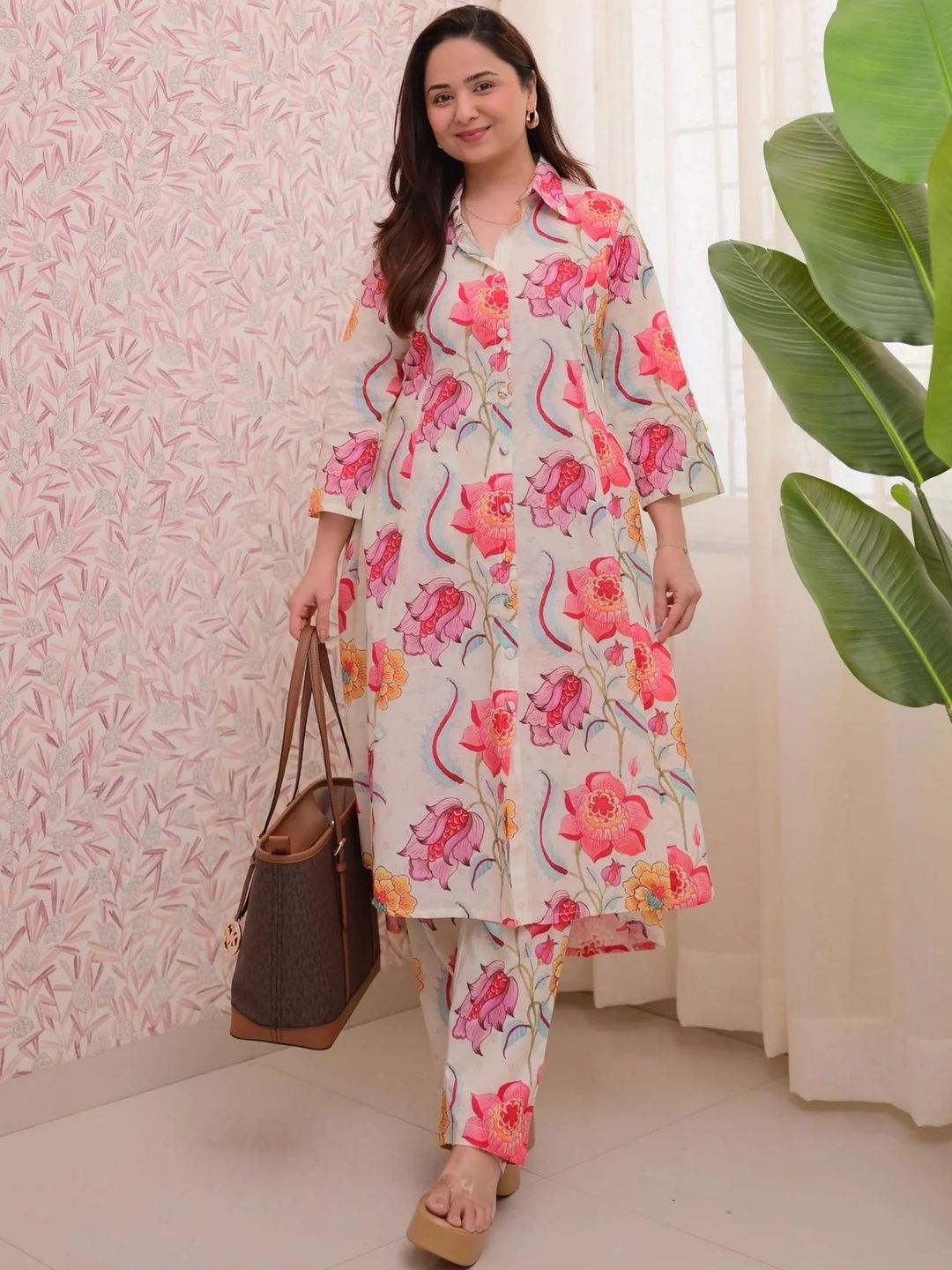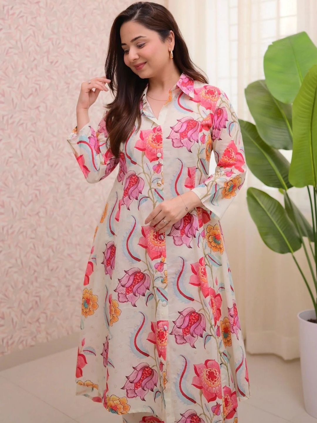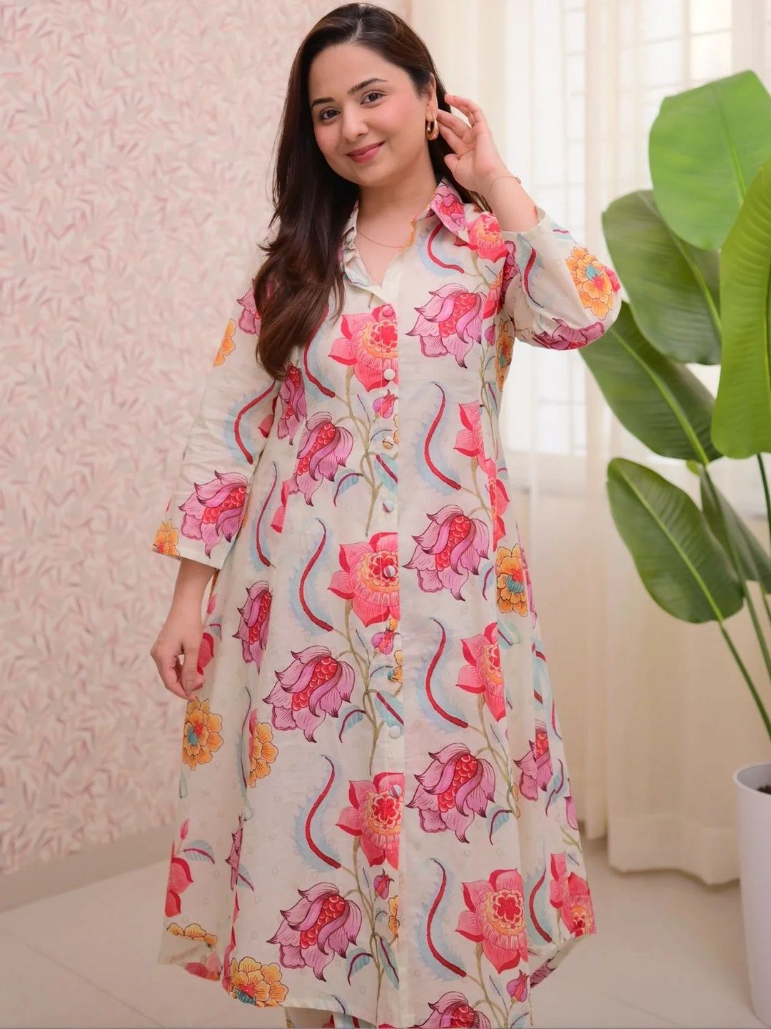 This co-ords consists of tunic and trousersWhite and pink printed tunic, has shirt collar neck and three-quarter sleevesWhite and pink printed trousers, has an elasticated waistband with slip-on closure