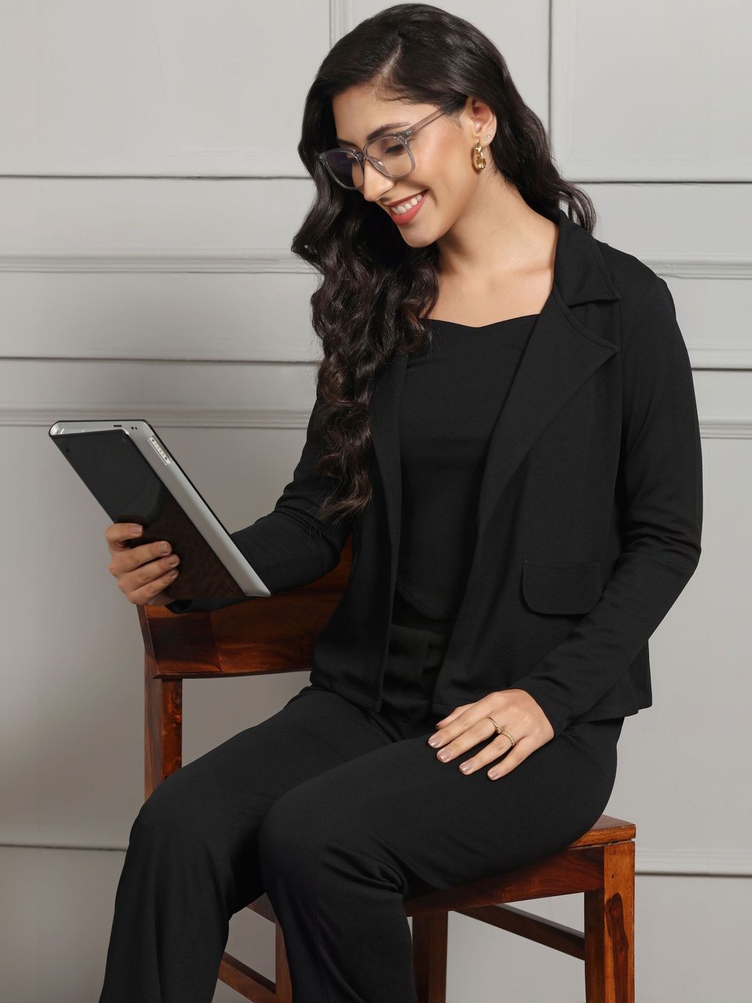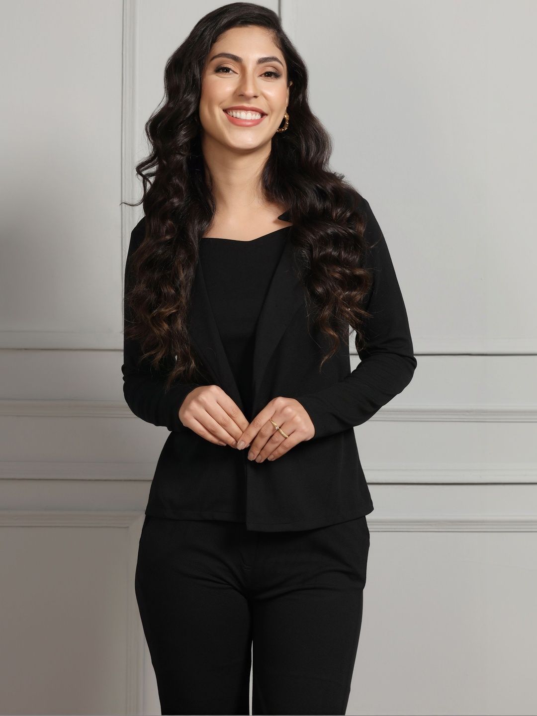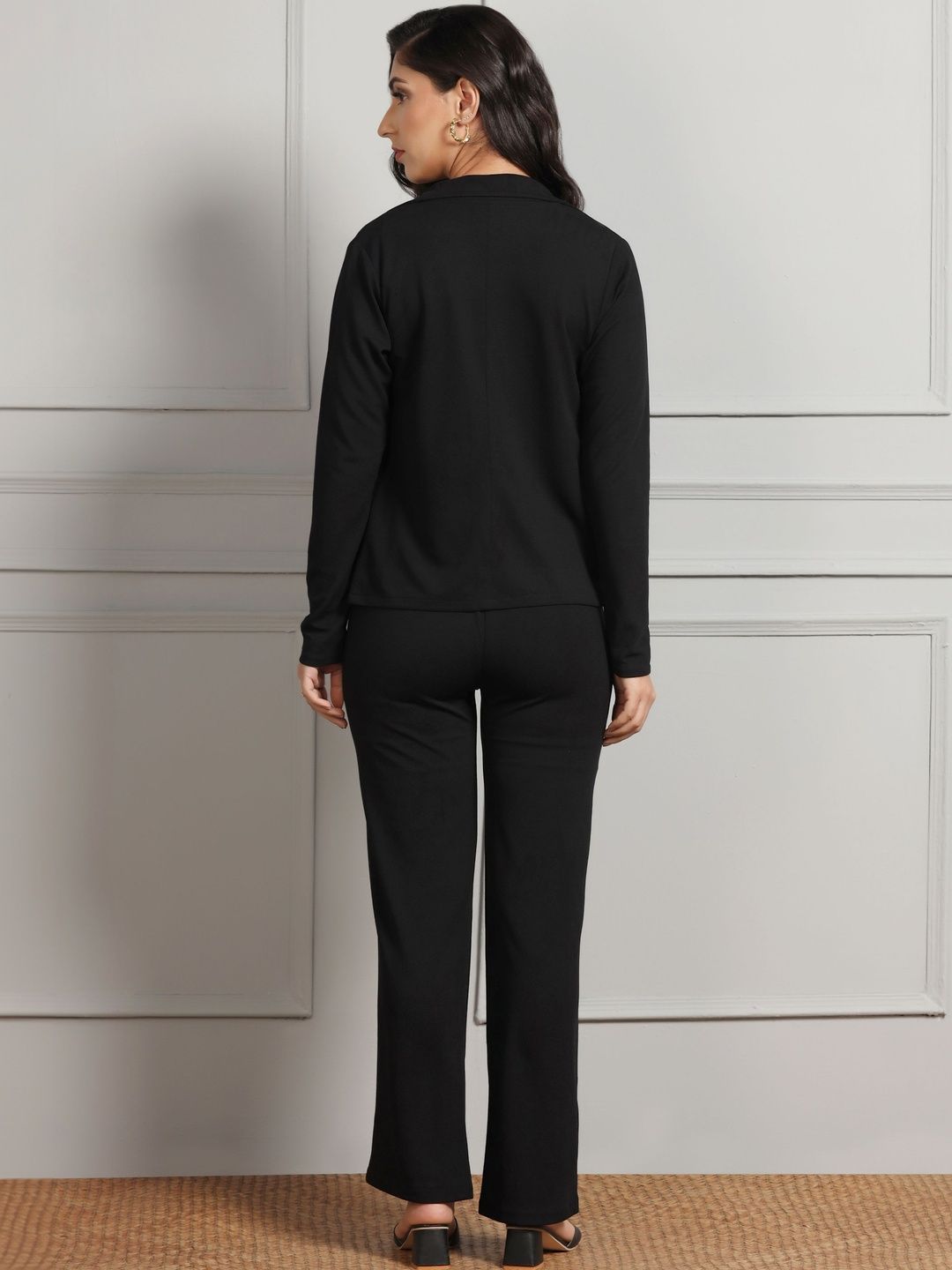 This co-ords consists of a top, blazer and trousersBlack solid top, has a square-neck and sleeveless, secured with slip-on closureBlack solid blazer, has a shirt collar-neck and long sleeves, secured with slip-on closureBlack solid trousers, has an elasticated waistband with slip-on closure and 2 pockets
