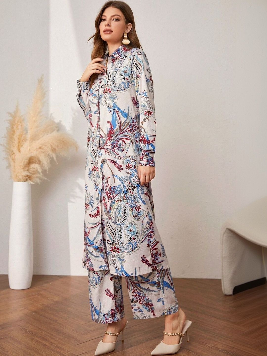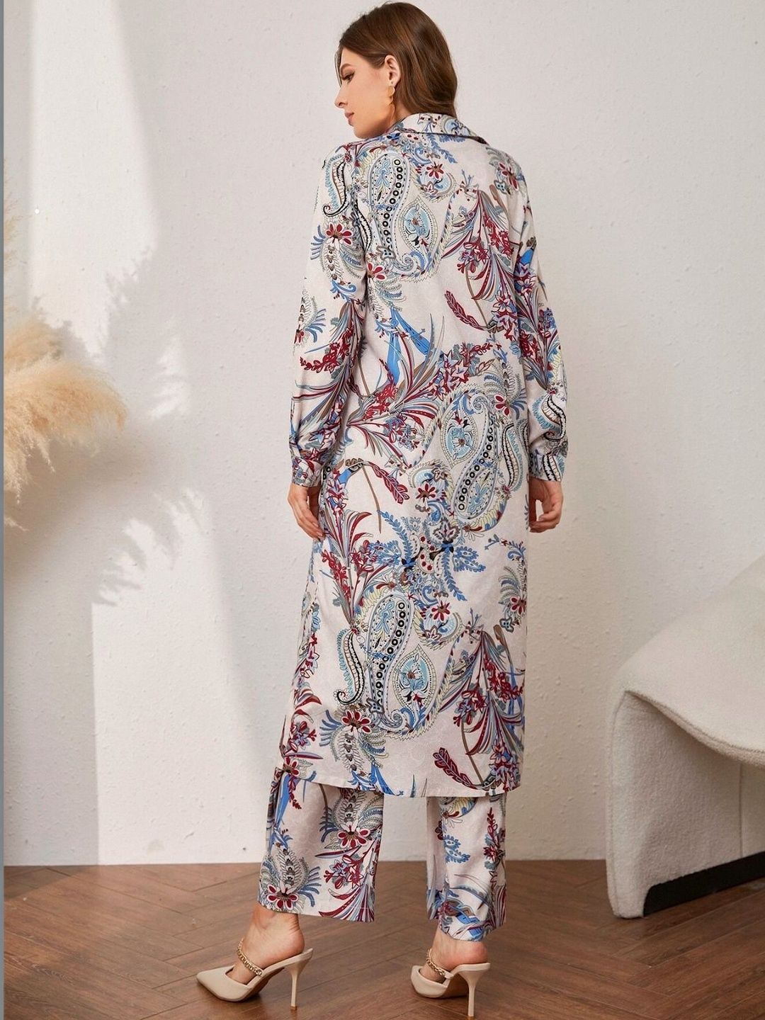 This co-ords consists of a tunic and trousersBlue and red printed tunic has a shirt collar neck and threee quarter sleevesBlue and red printed trousers, has an elasticated waistband with slip-on closure has 2 pockets