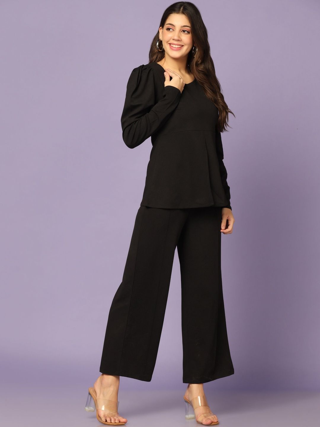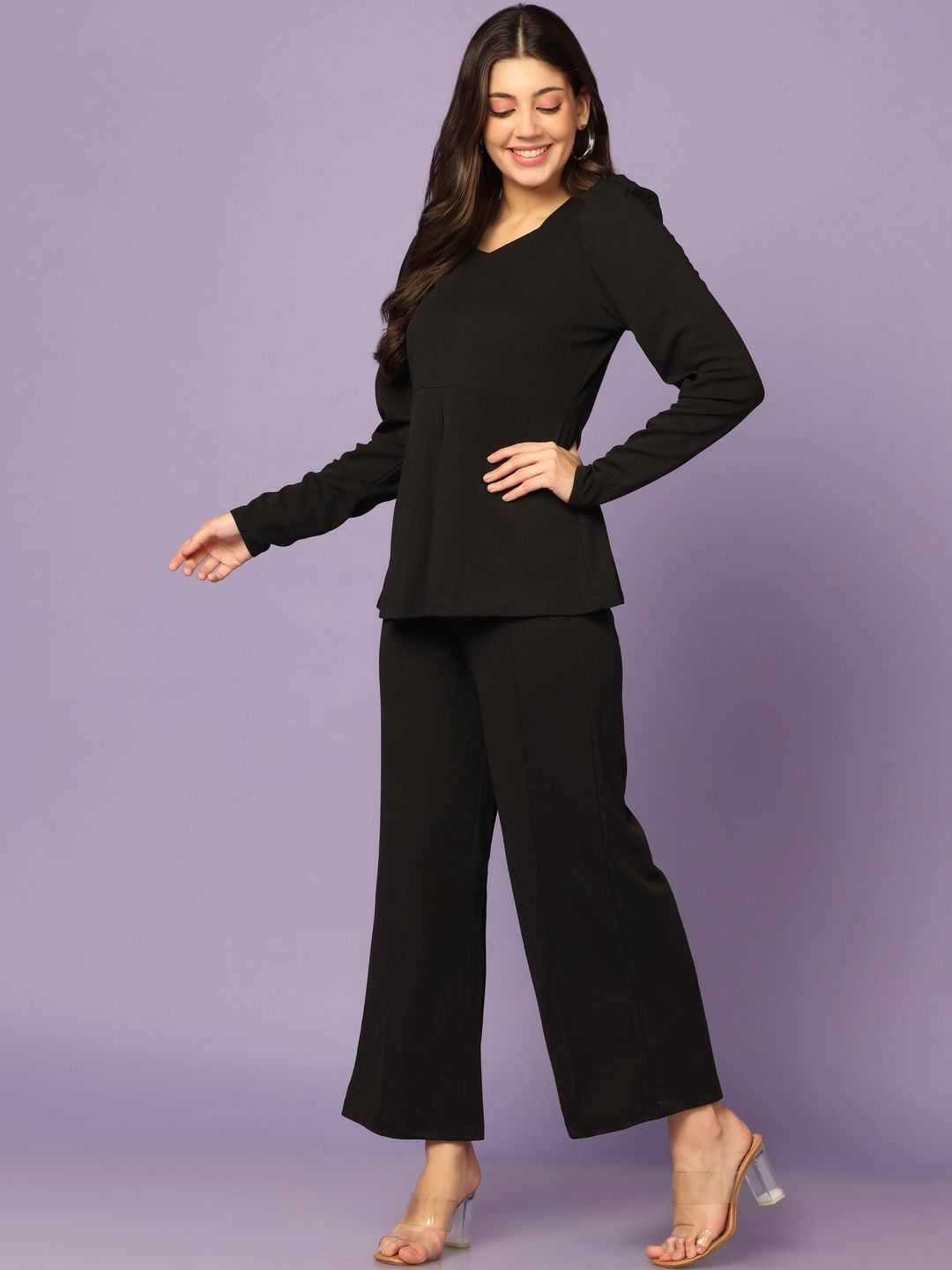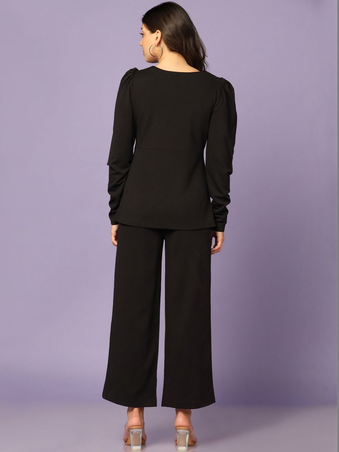 This co-ords consists of a top and trousersBlack solid top, has a square-neck and long sleeves, secured with slip-on closureBlack solid trousers, has an elasticated waistband with slip-on closure