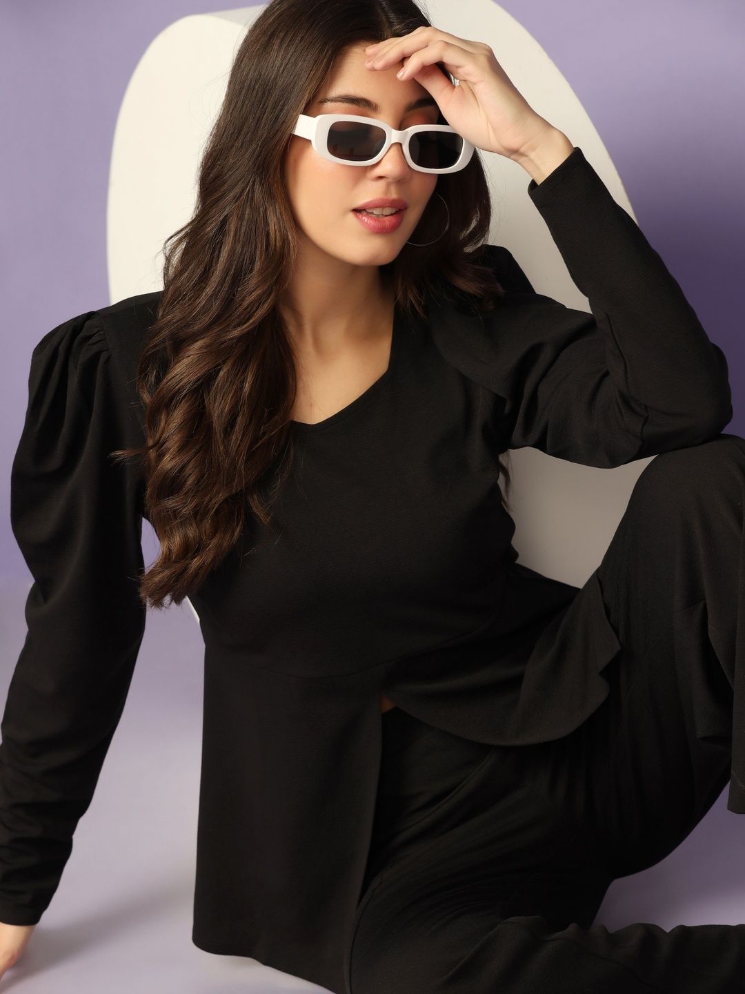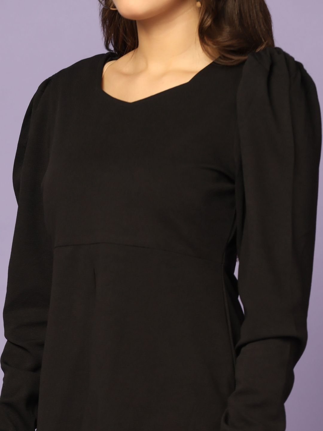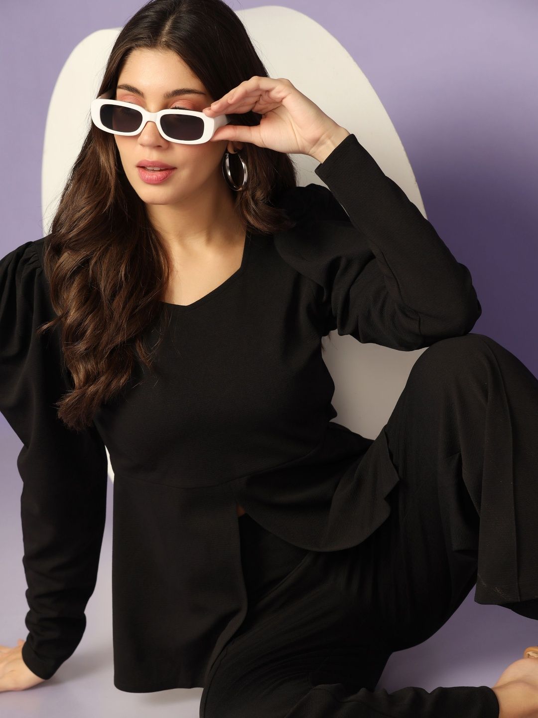 This co-ords consists of a top and trousersBlack solid top, has a square-neck and long sleeves, secured with slip-on closureBlack solid trousers, has an elasticated waistband with slip-on closure