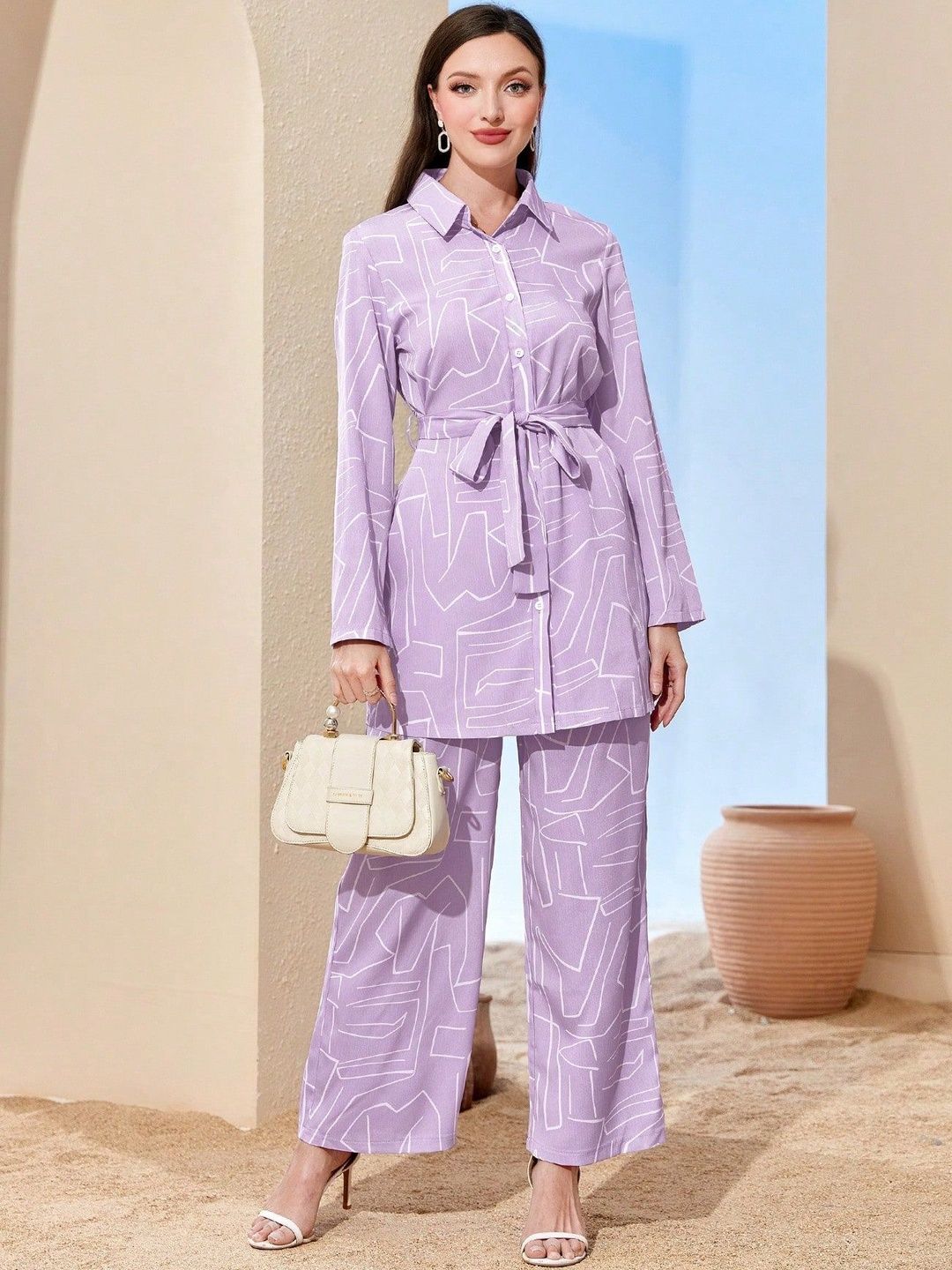 This co-ords consists of shirt and trousersLavender and white printed shirt, has shirt collar neck and three-quarter sleeves, secured with button closureLavender and white printed trousers, has an elasticated waistband with slip-on closure