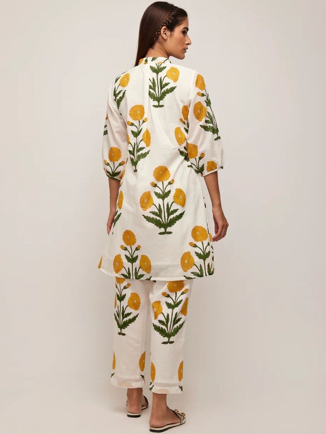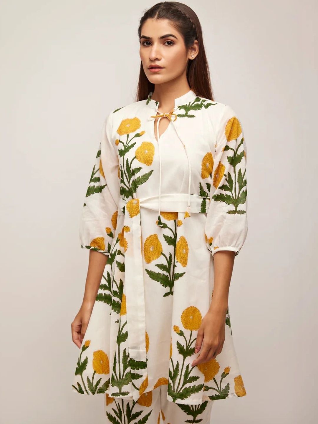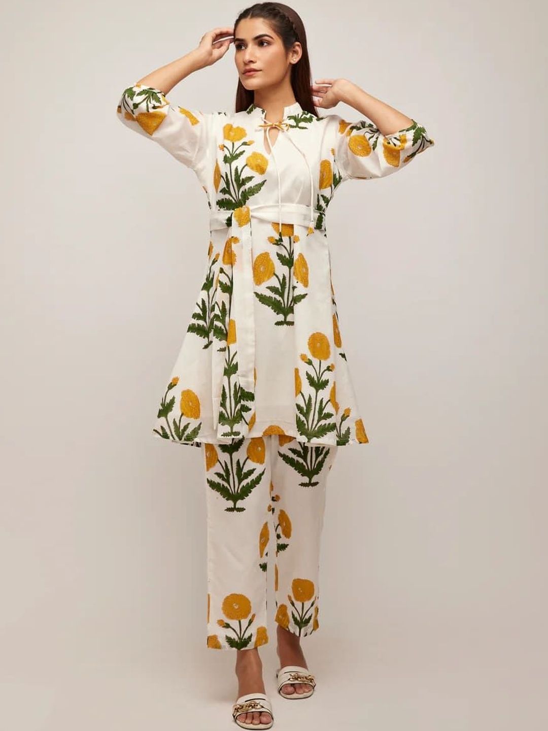 This co-ords consists of a tunic and trousersYellow and white printed tunic, has a mandarin collar neck and three quarter sleeves, Yellow and white printed trousers, has an elasticated waistband with slip-on closure has 2 pockets