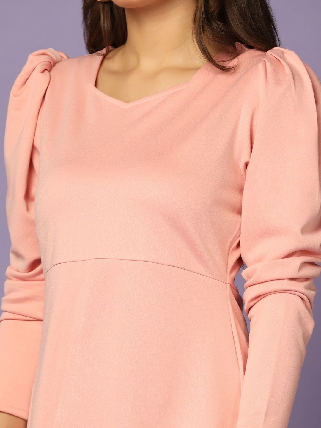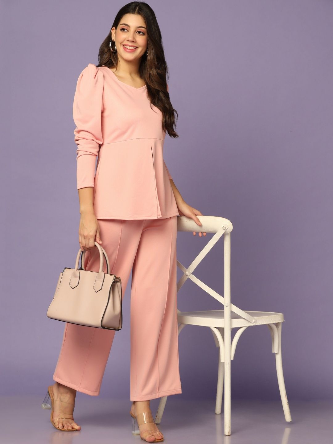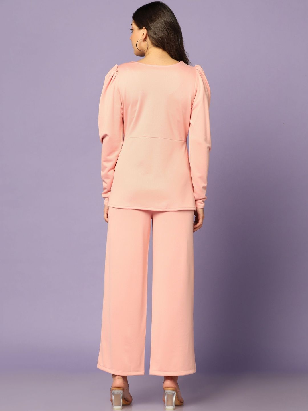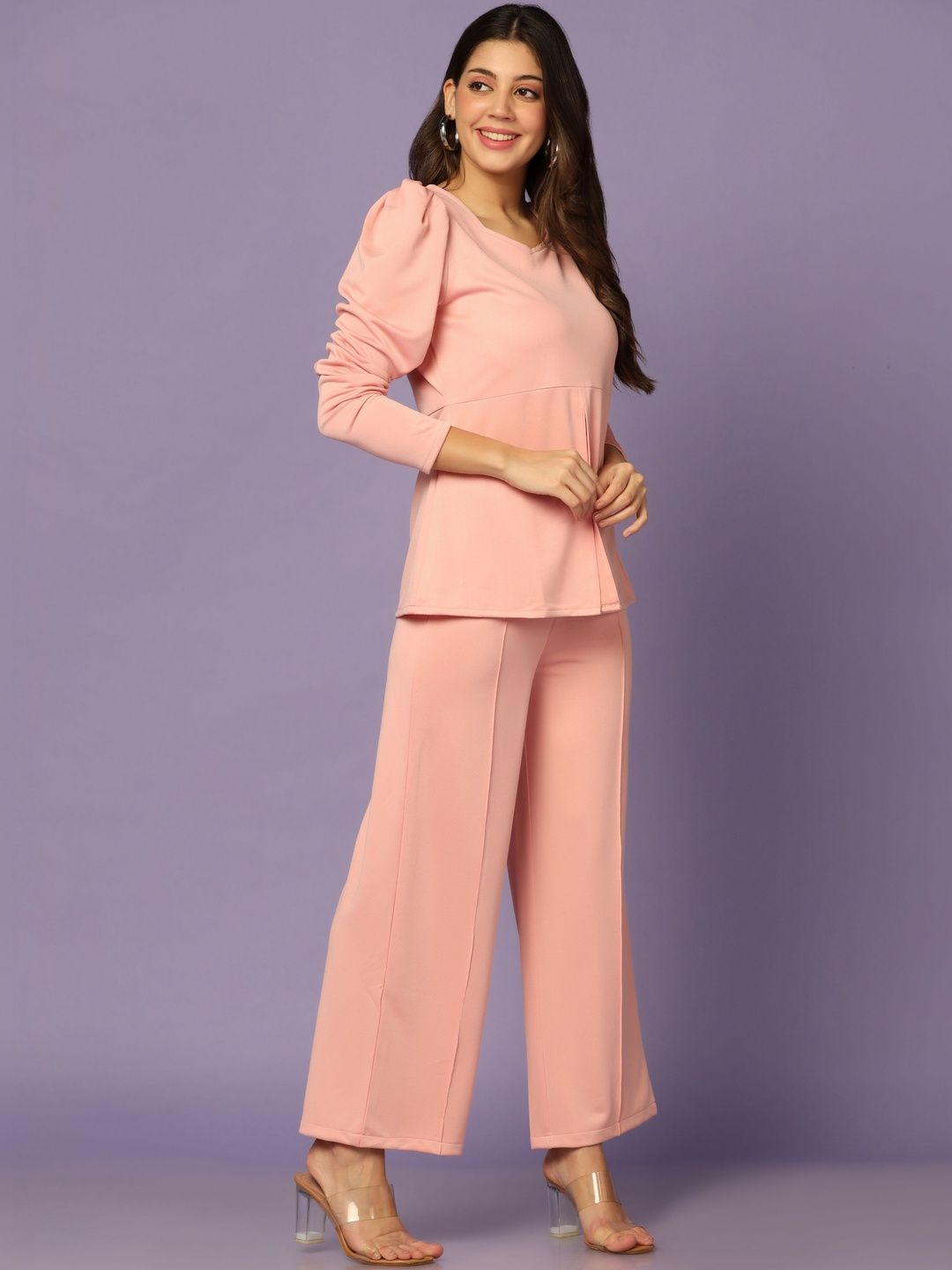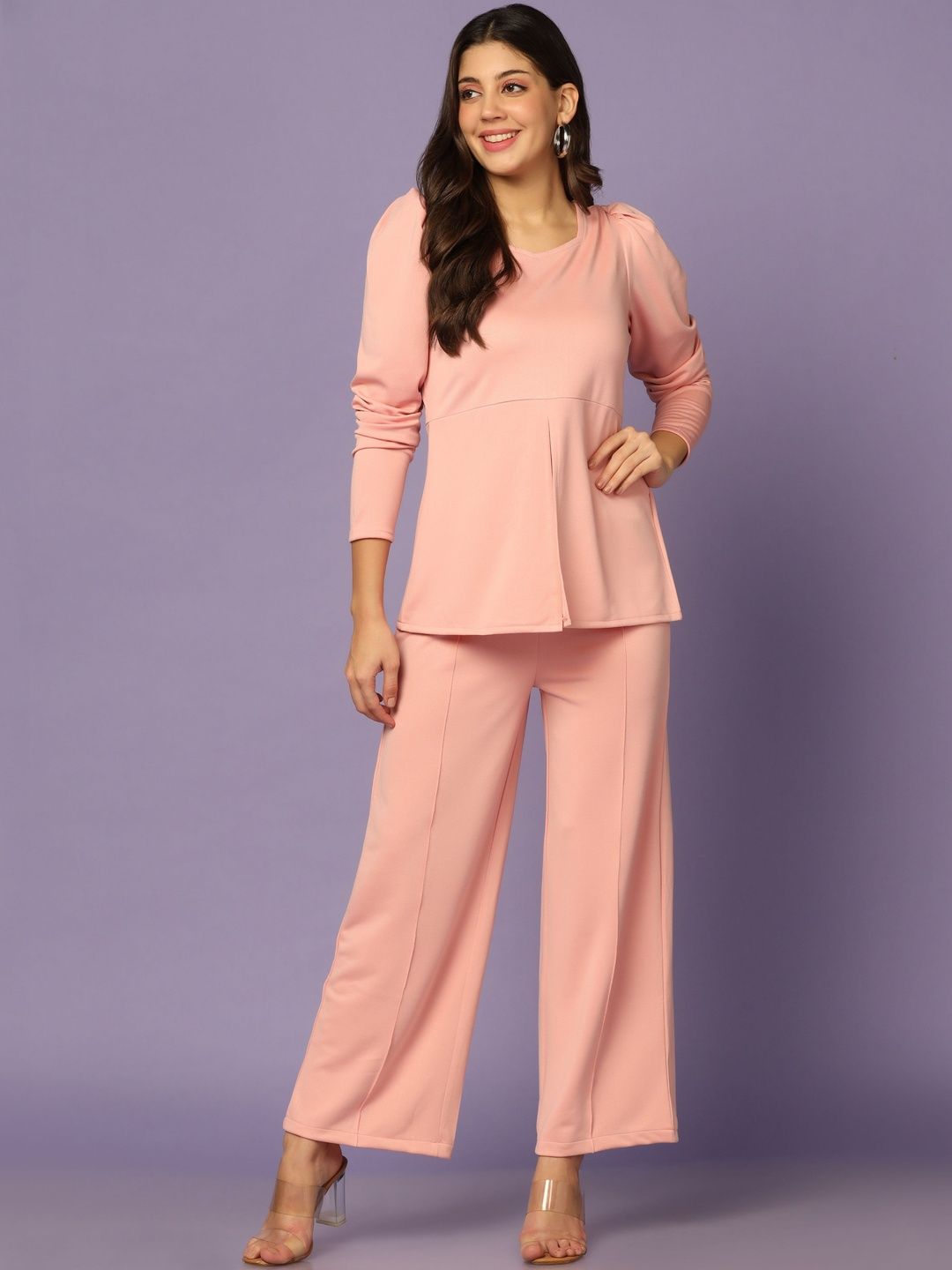 This co-ords consists of a top and trousersPeach solid top, has a square-neck and long sleeves, secured with slip-on closurePeach solid trousers, has an elasticated waistband with slip-on closure