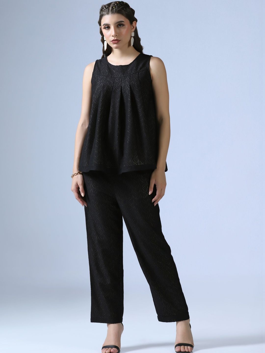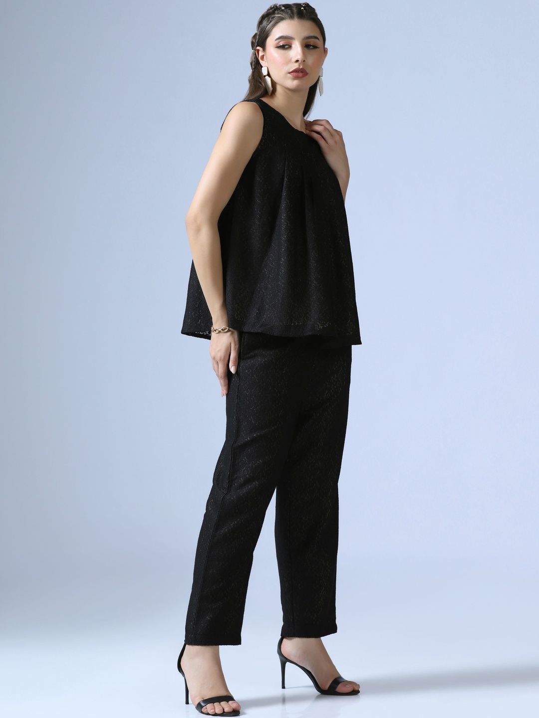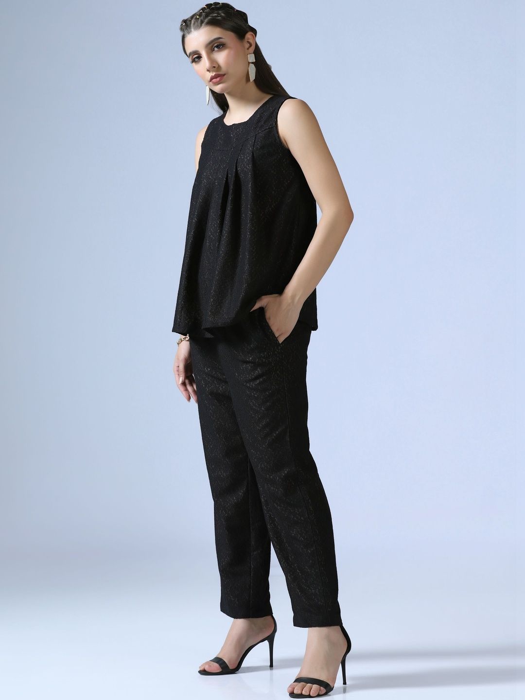 This co-ords consists of top and trouserBlack solid top, has round neck and sleeveless with slip on closureBlack solid trouser, has an elasticated waistband with slip on closure and a pocket
