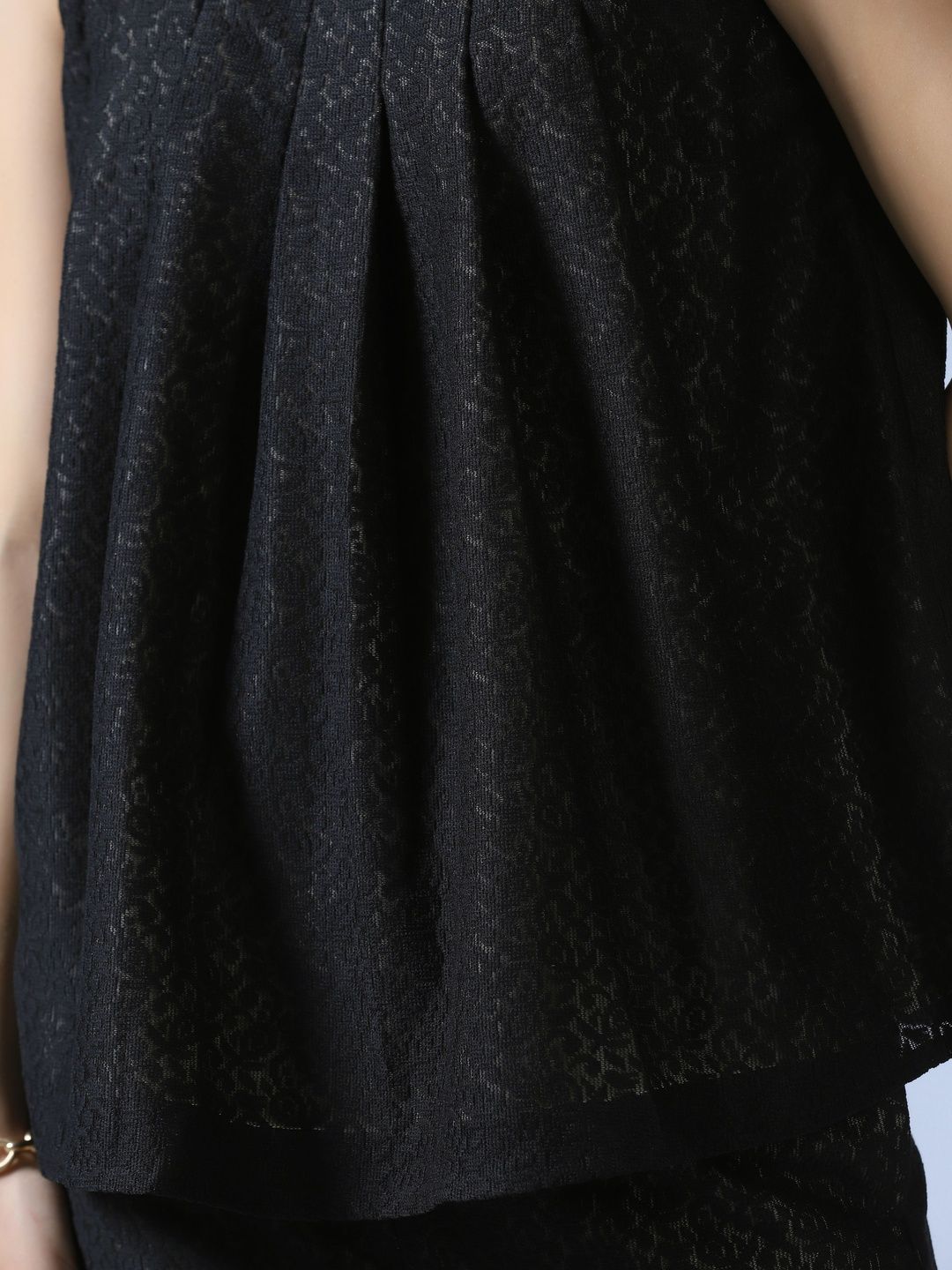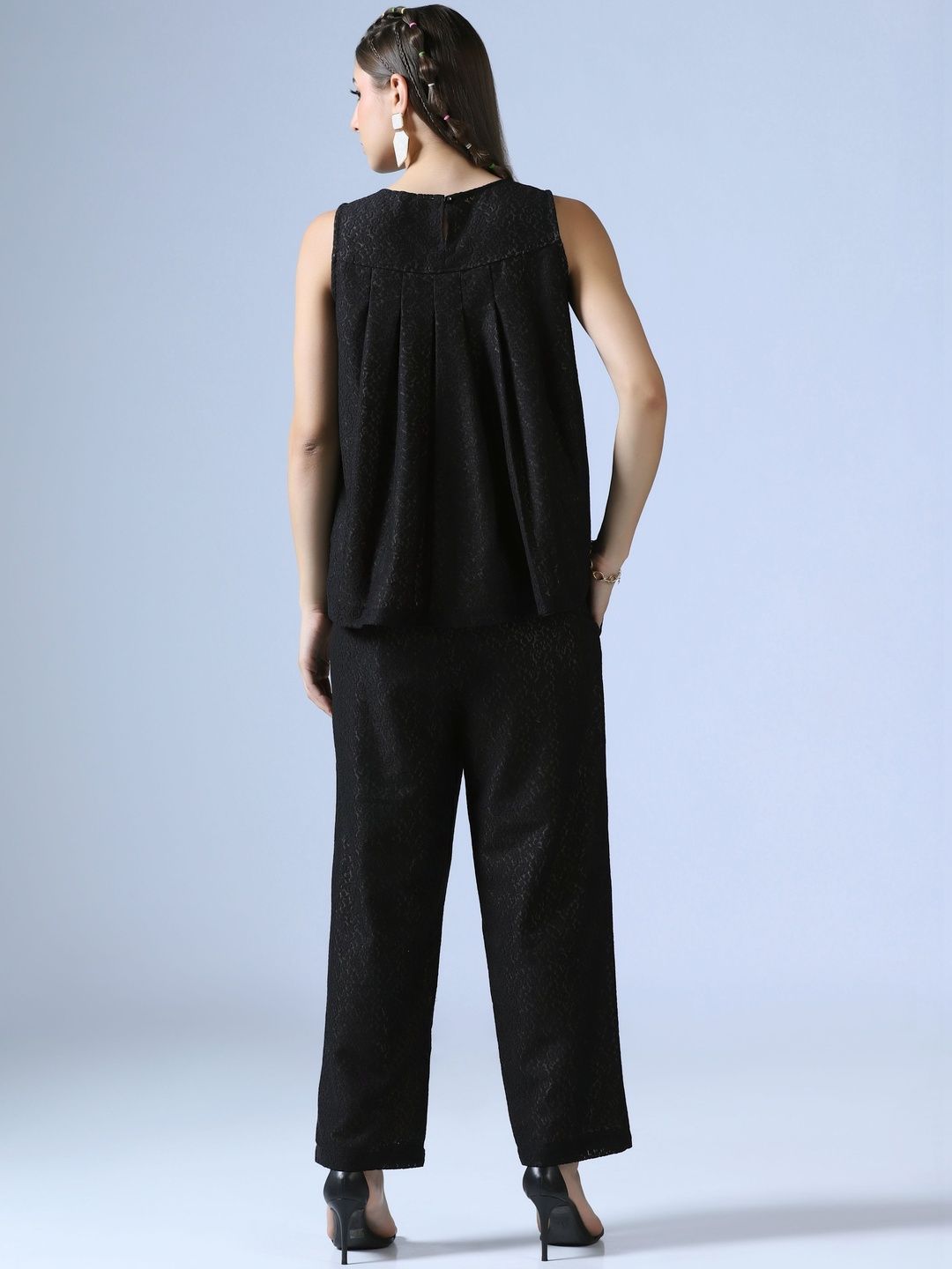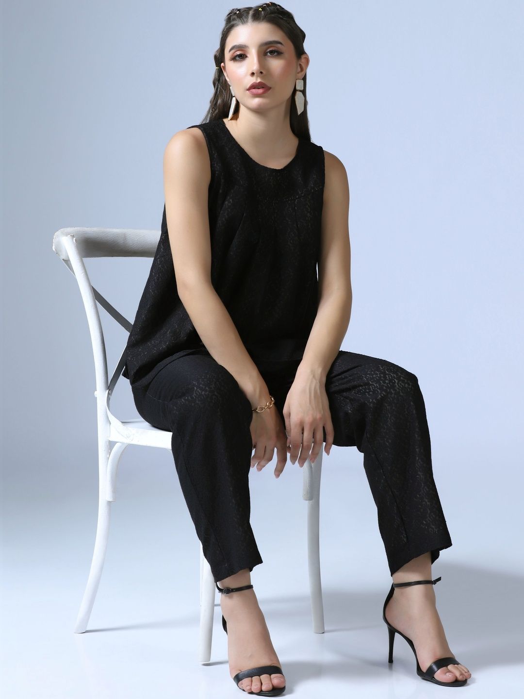 This co-ords consists of top and trouserBlack solid top, has round neck and sleeveless with slip on closureBlack solid trouser, has an elasticated waistband with slip on closure and a pocket