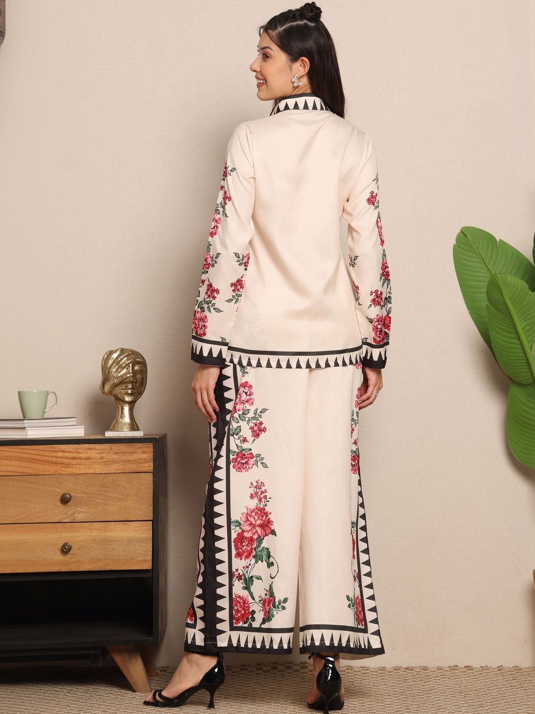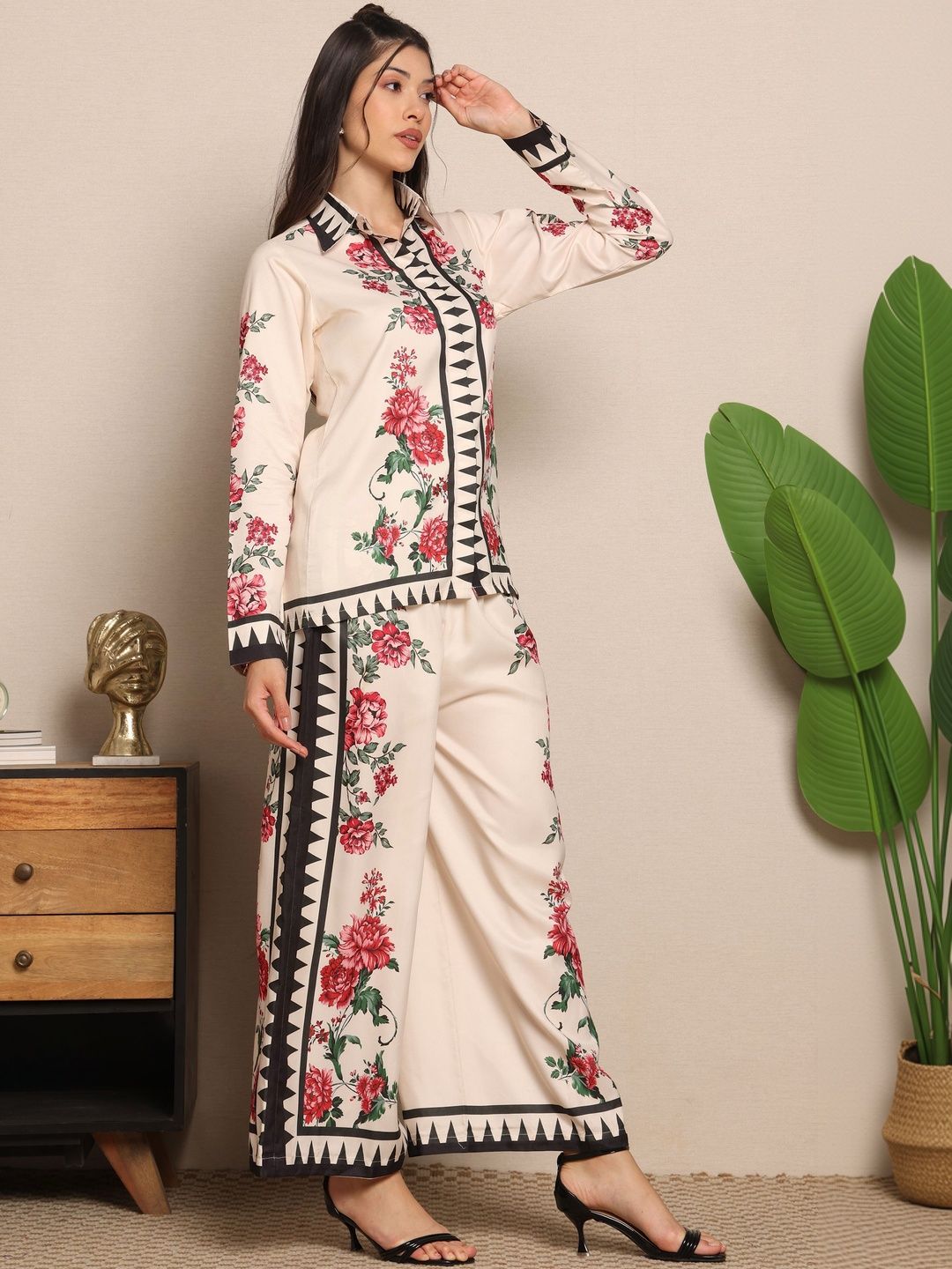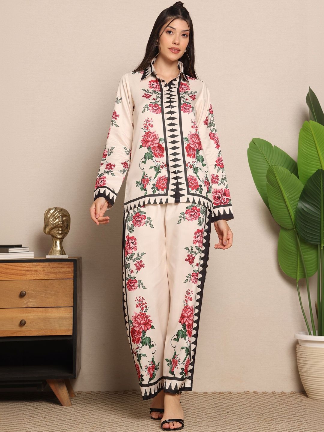 This co-ords consists of a tunic and trousersPeach coloured & black printed tunic has a shirt collar neck and full sleeves sleevesPeach coloured & black printed trousers, has an elasticated waistband with slip-on closure has 2 pockets
