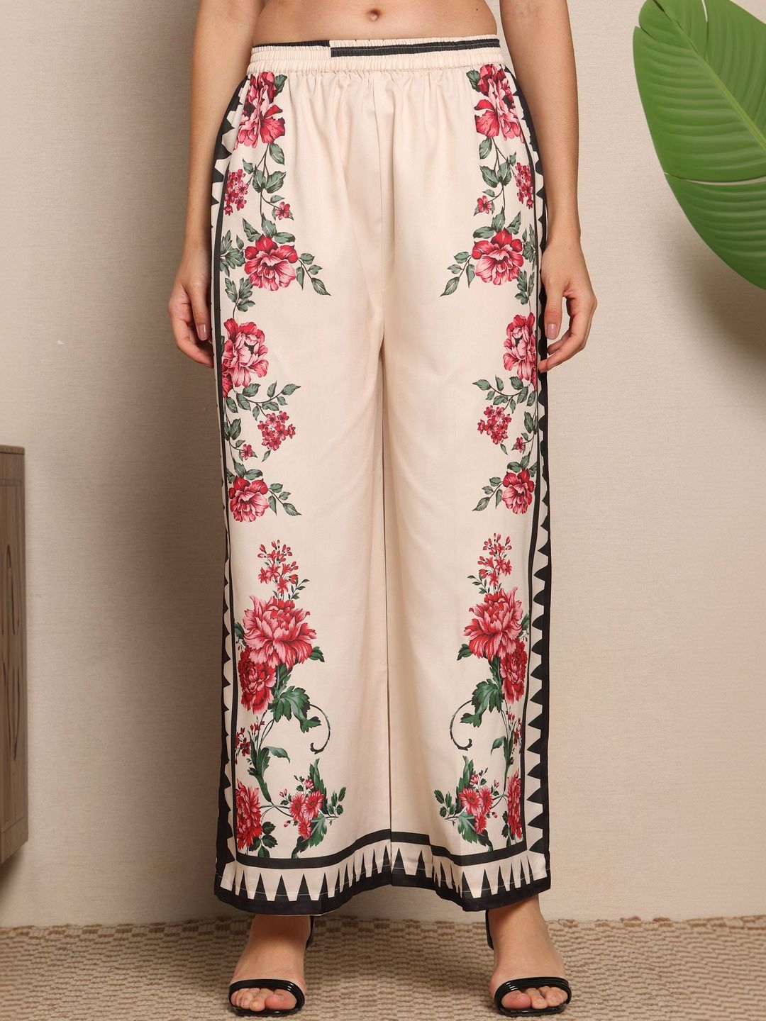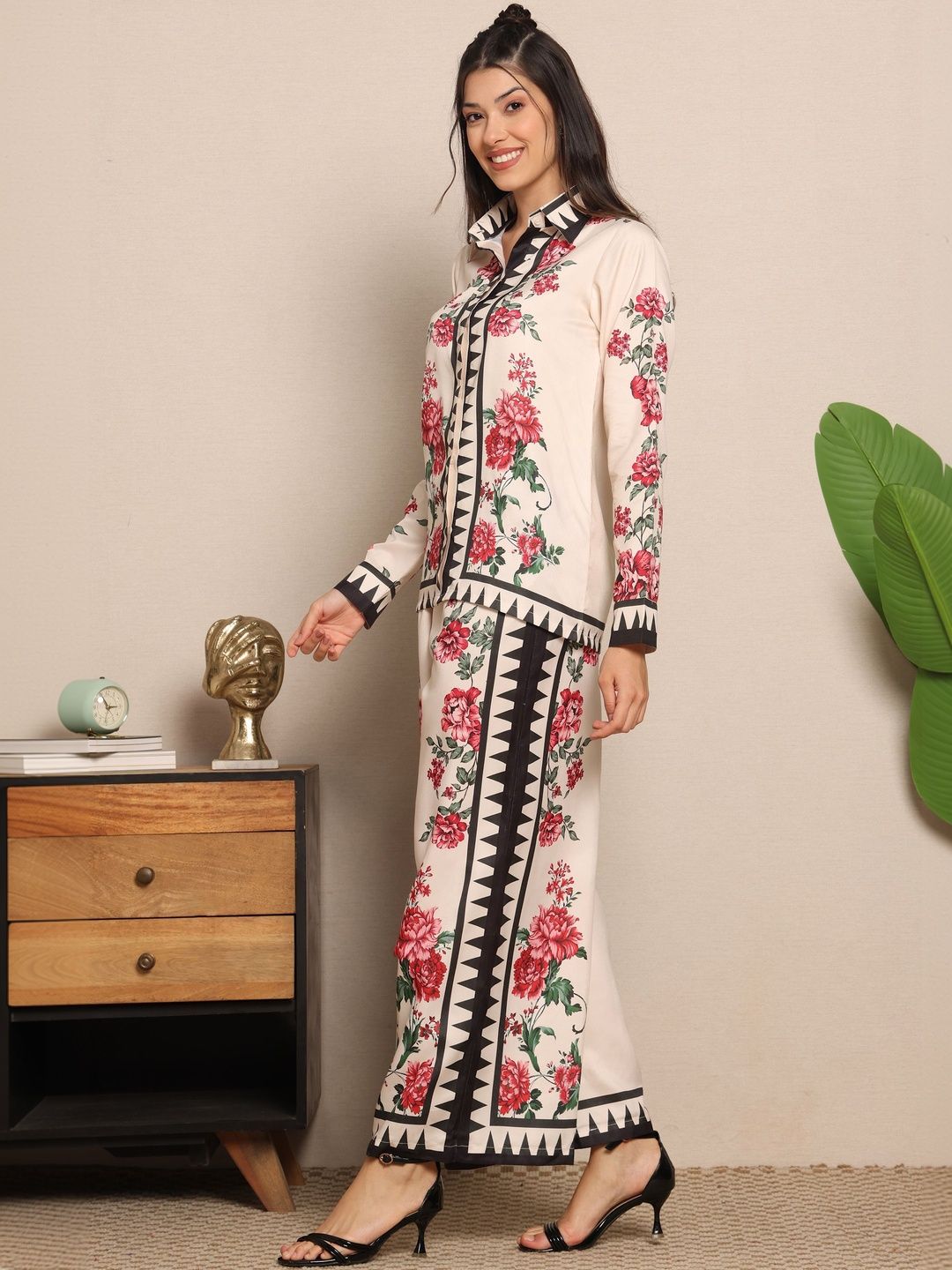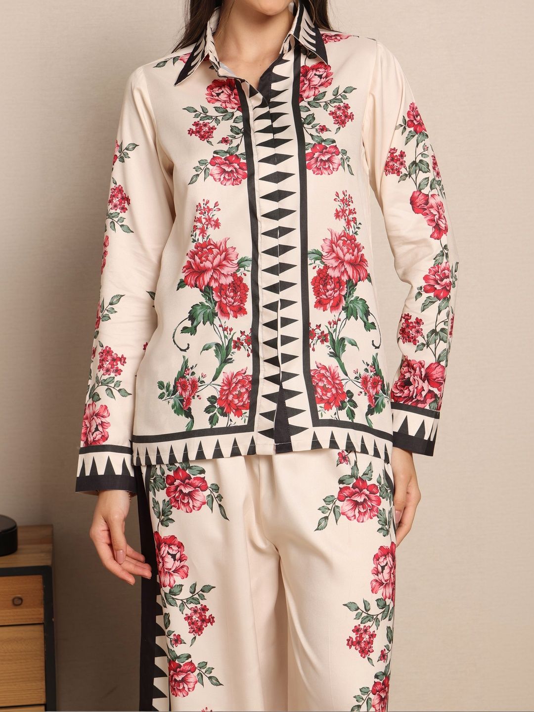 This co-ords consists of a tunic and trousersPeach coloured & black printed tunic has a shirt collar neck and full sleeves sleevesPeach coloured & black printed trousers, has an elasticated waistband with slip-on closure has 2 pockets